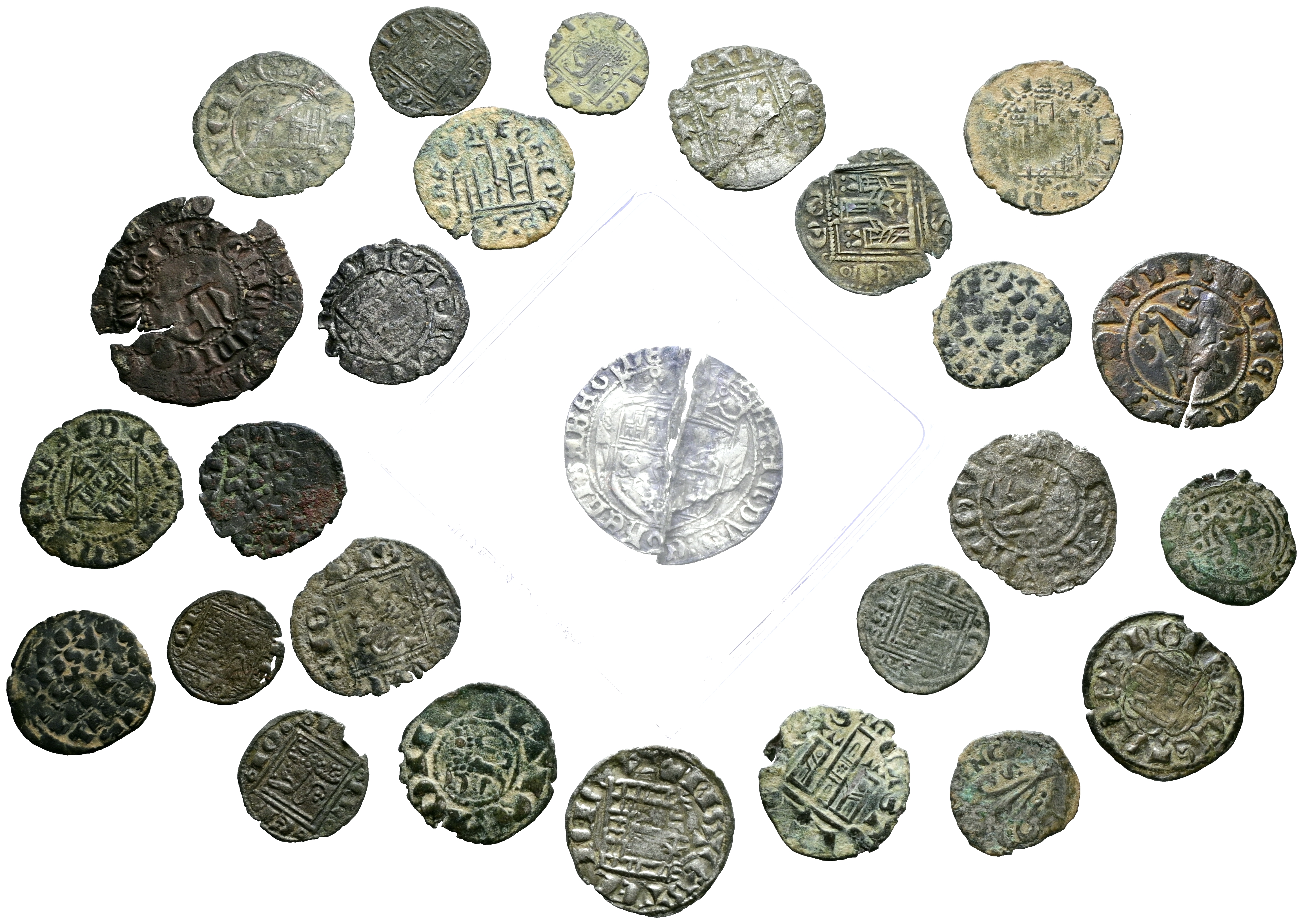 EPOCA MEDIEVAL. Interesantísimo resto de colección formado por 26 monedas acuñadas entre los reinados de Alfosno X y Enqrique IV. A adestacar, una gran variedad de módulos y tipos. Incluye 1 Real de los Reyes Católicos anterior a la prágmatica (fracturado) y 1 Dinero valenciano de Carlos I. Diferentes cecas, medidas y estados de conservación. A EXAMINAR.