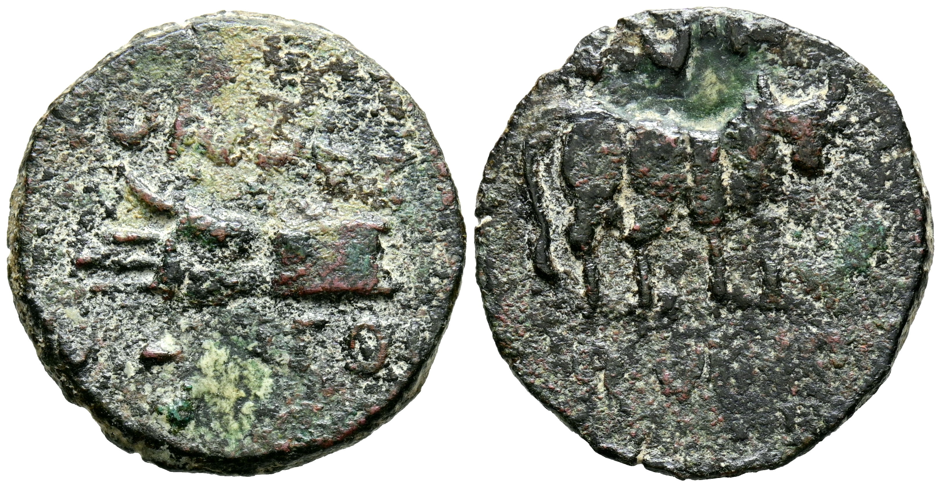 CARTAGONOVA (Cartagena, Murcia). Semis. (Ae. 4,54g/22mm). 27 a.C.-14 d.C. (FAB-579). Anv: Mano a izquierda, alrededor leyenda: CONDVC MALLEOL. Rev: Toro a derecha, alrededor leyenda: II VIR QVINQ. BC+.