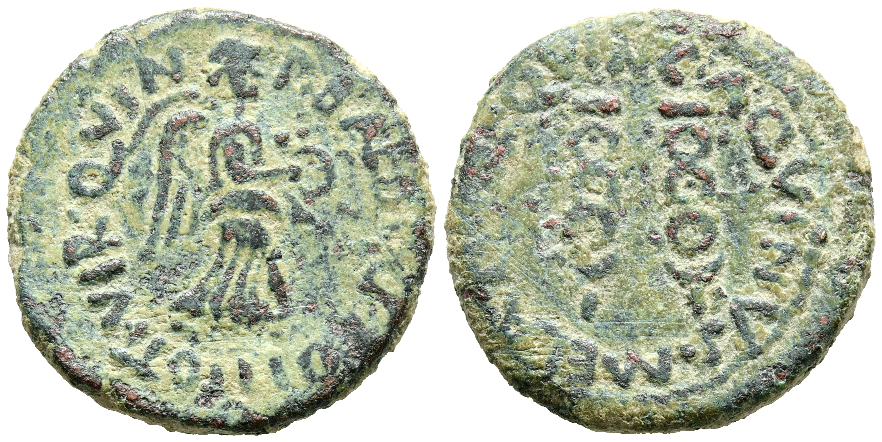 CARTAGONOVA (Cartagena, Murcia). Semis. (Ae. 5,53g/22mm). 27 a.C.-14 d.C. (FAB-580). Anv: Victoria a derecha, alrededor leyenda: P BAEBIVS POLLIO II VIR QVIN. Rev: Dos estandarte, alrededor leyenda: C AQVINVS MELA II VIR QVIN. MBC-.