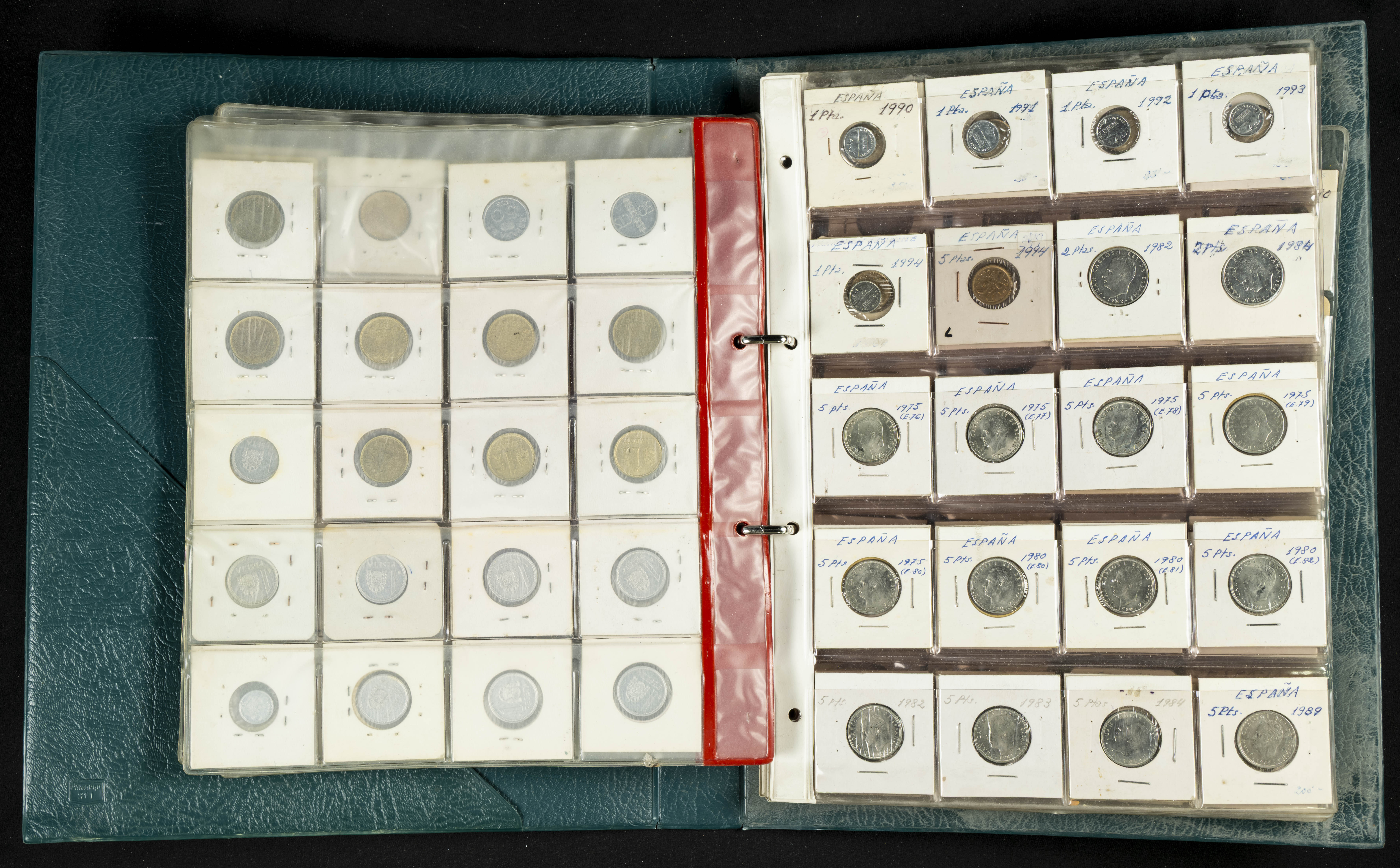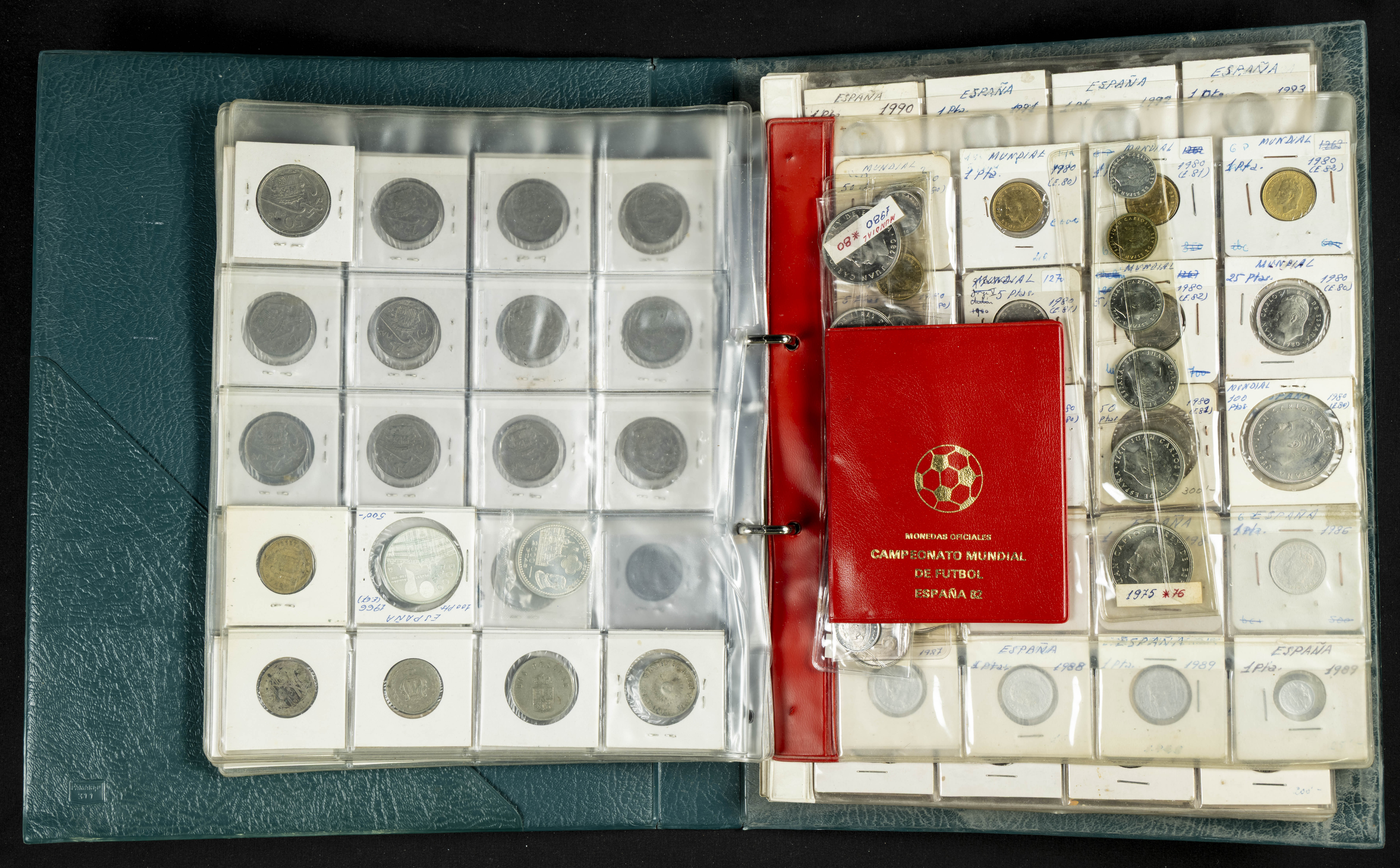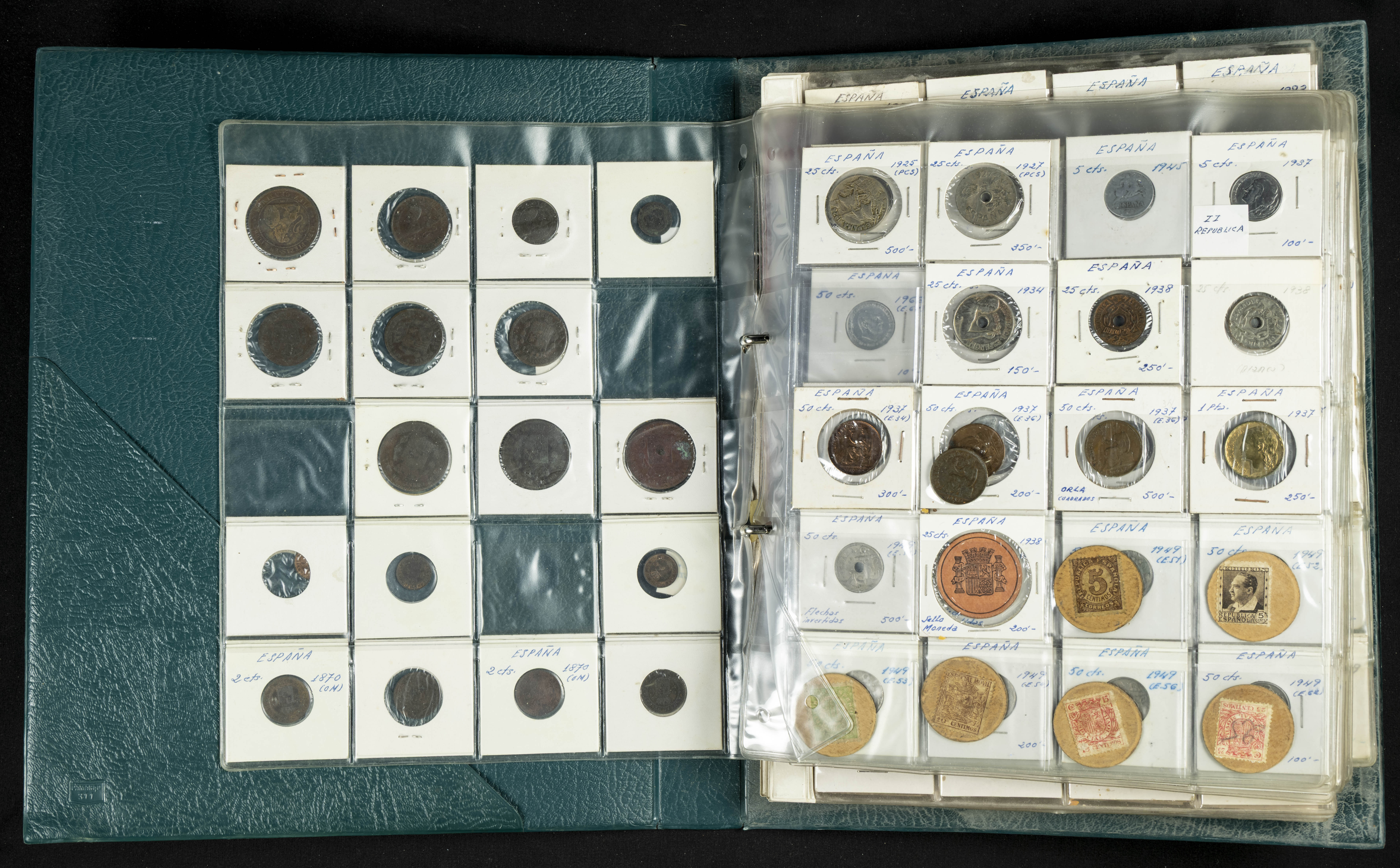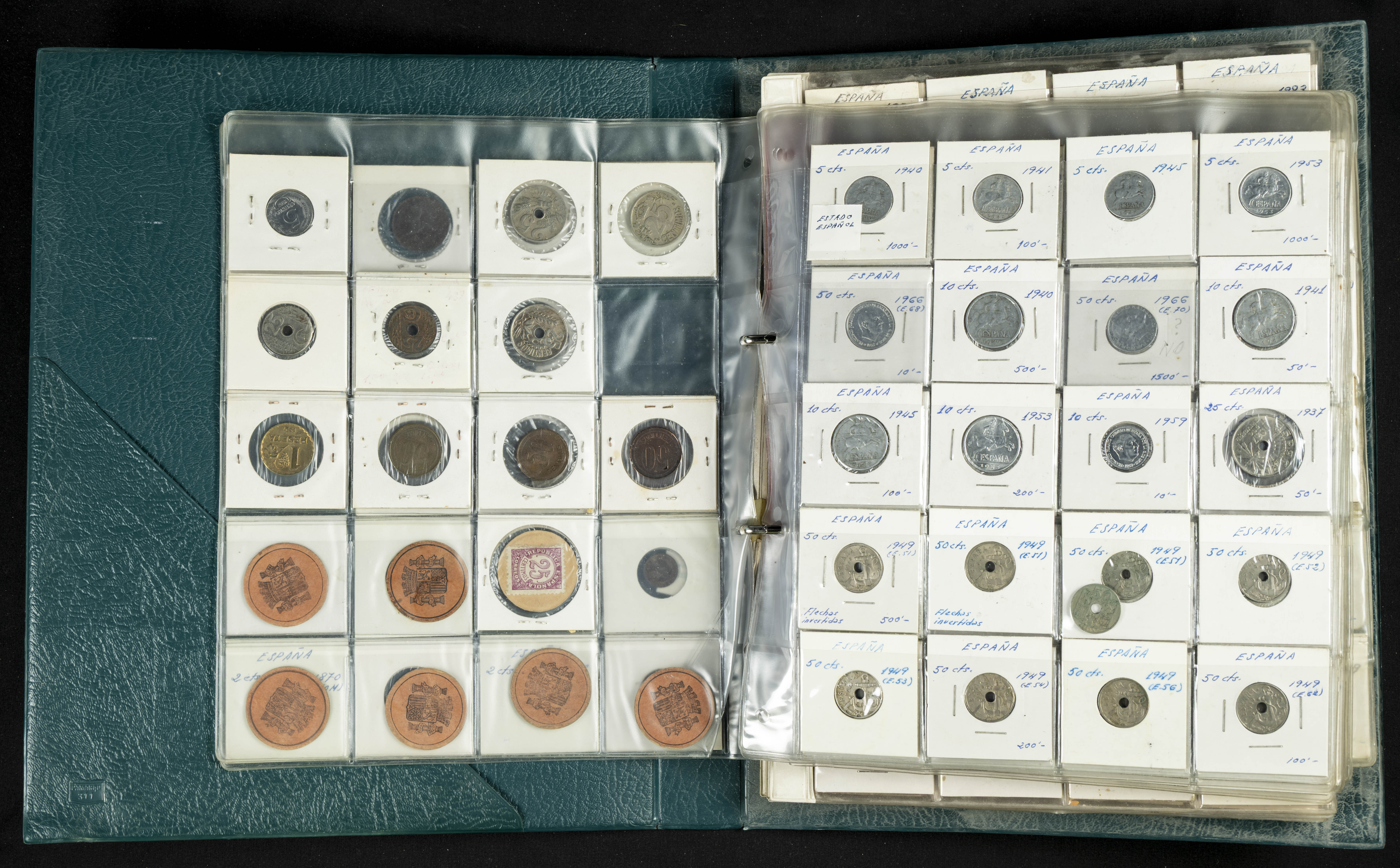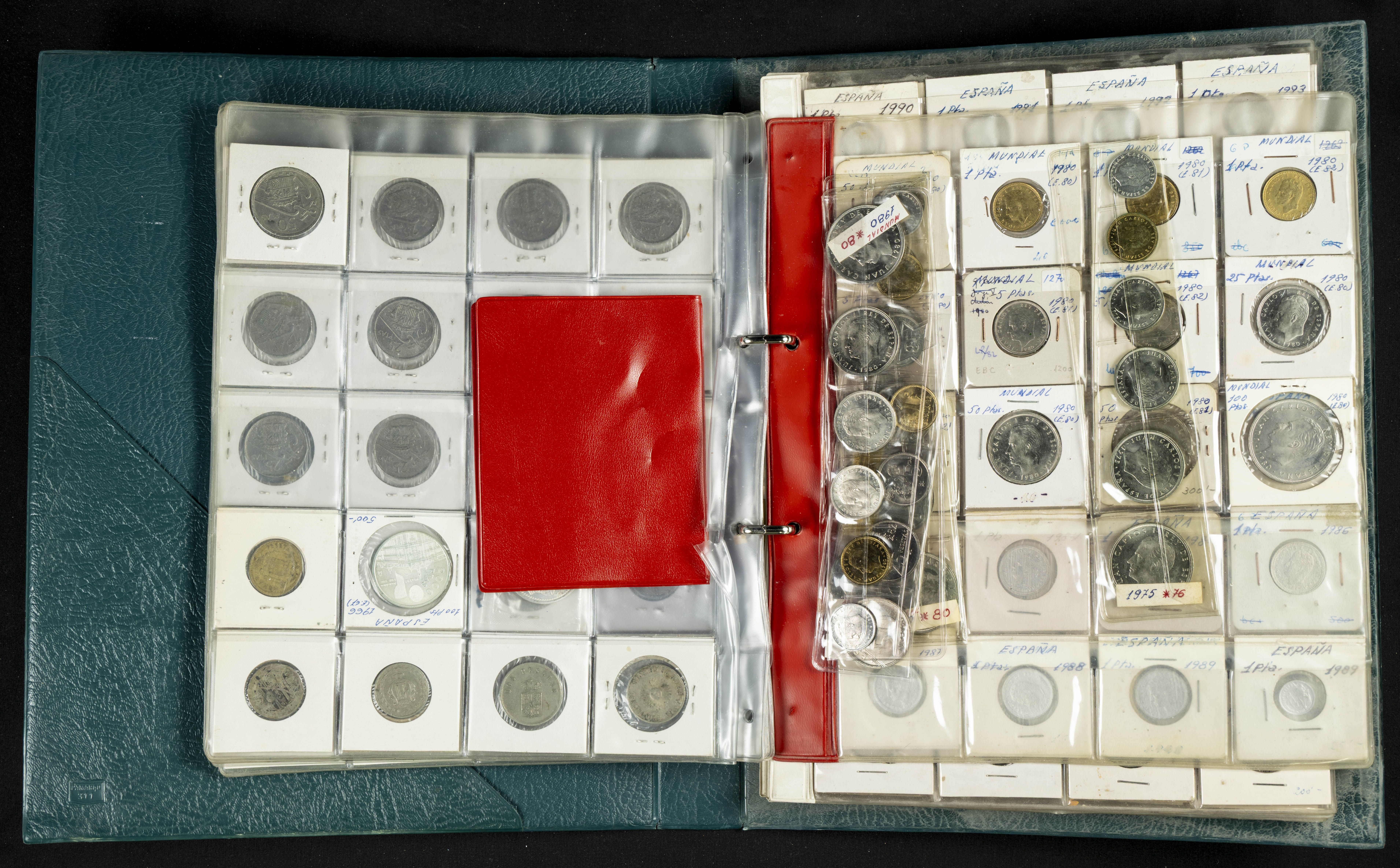 ESPAÑA. Álbum compuesto por alrededor de 300 monedas acuñadas entre los periodos del Centenario de la Peseta y el reinado de Juan Carlos I. Incluye algunos sellos moneda y algunas fichas de casino. Diferentes estados de conservación. A EXAMINAR.