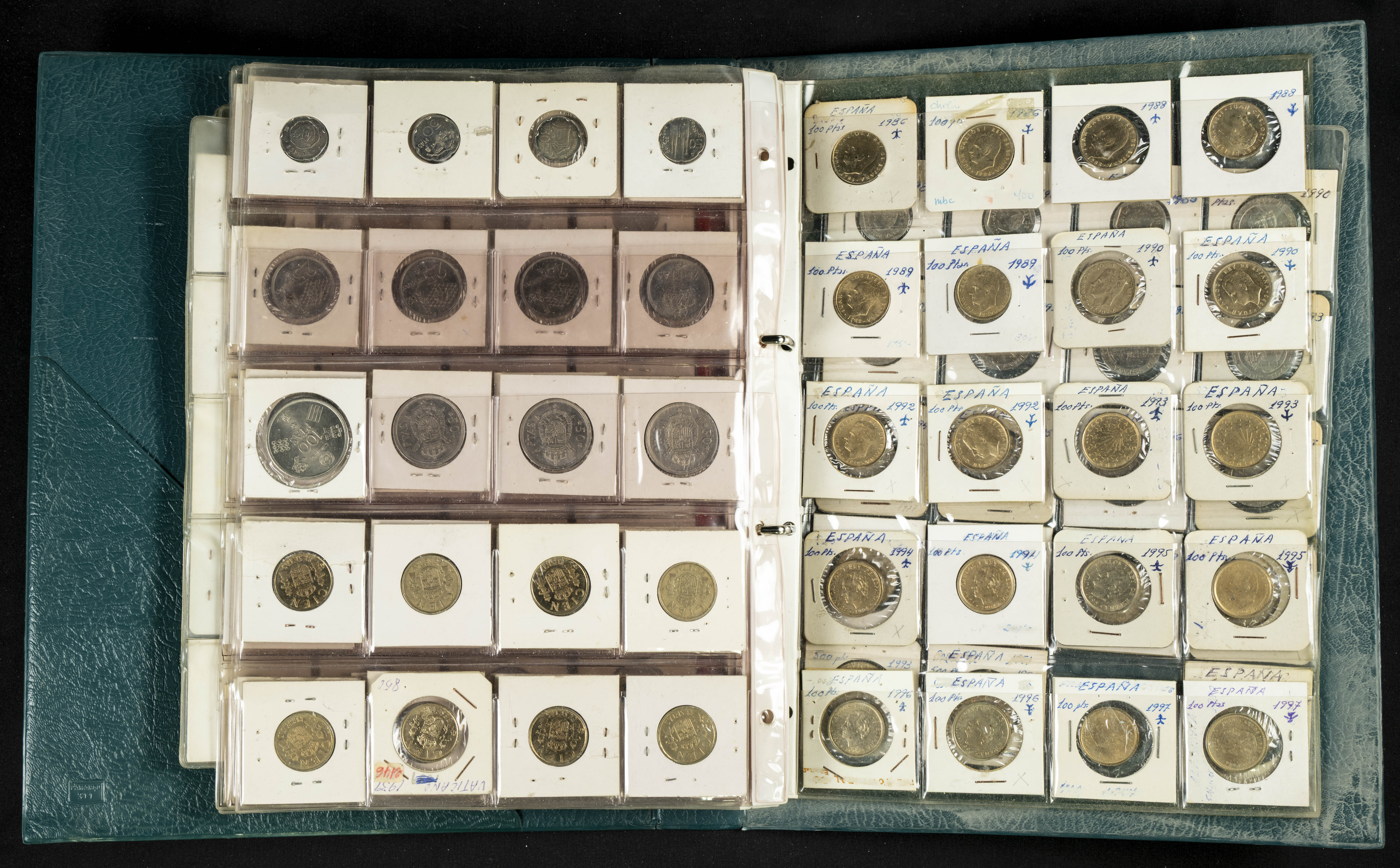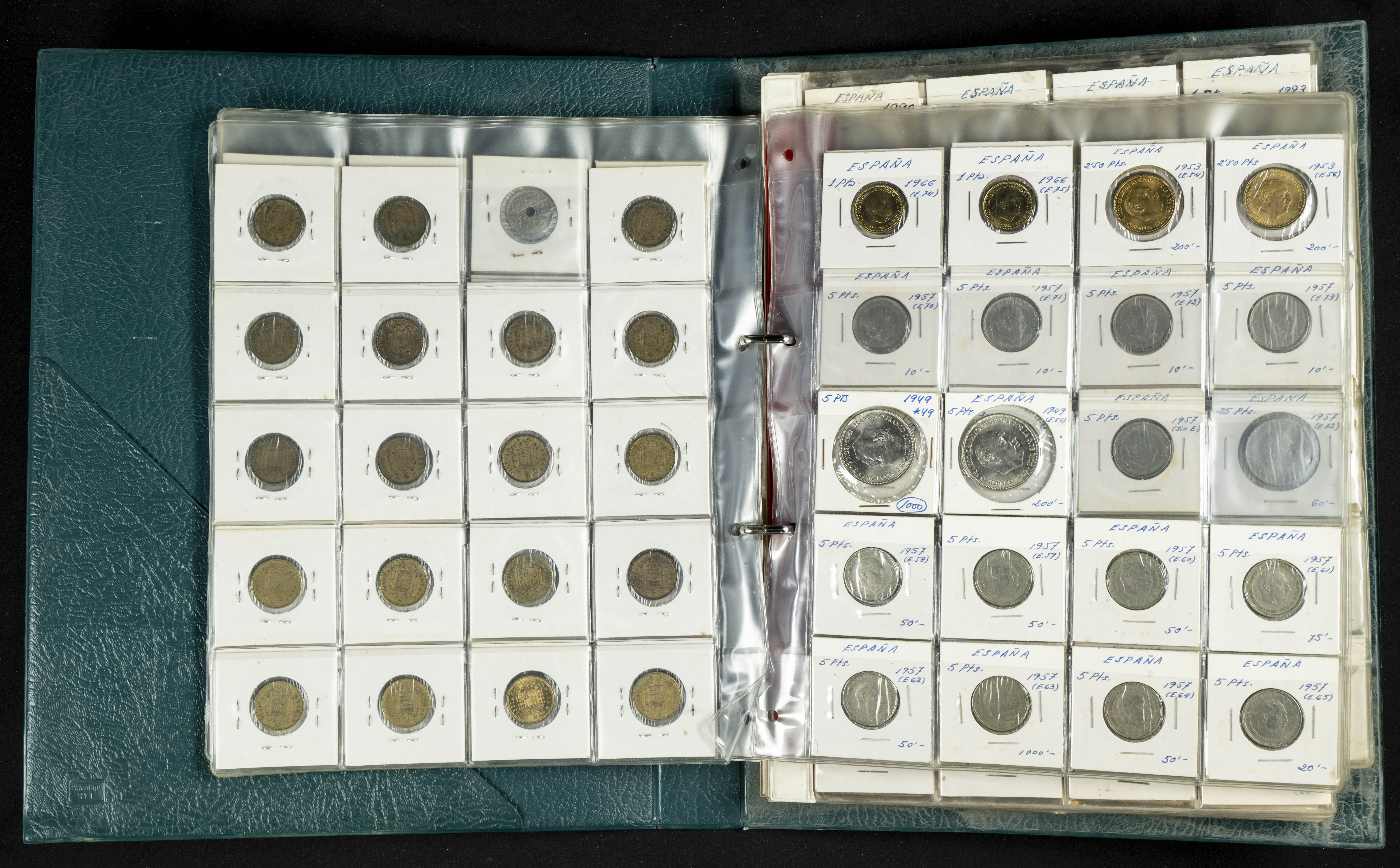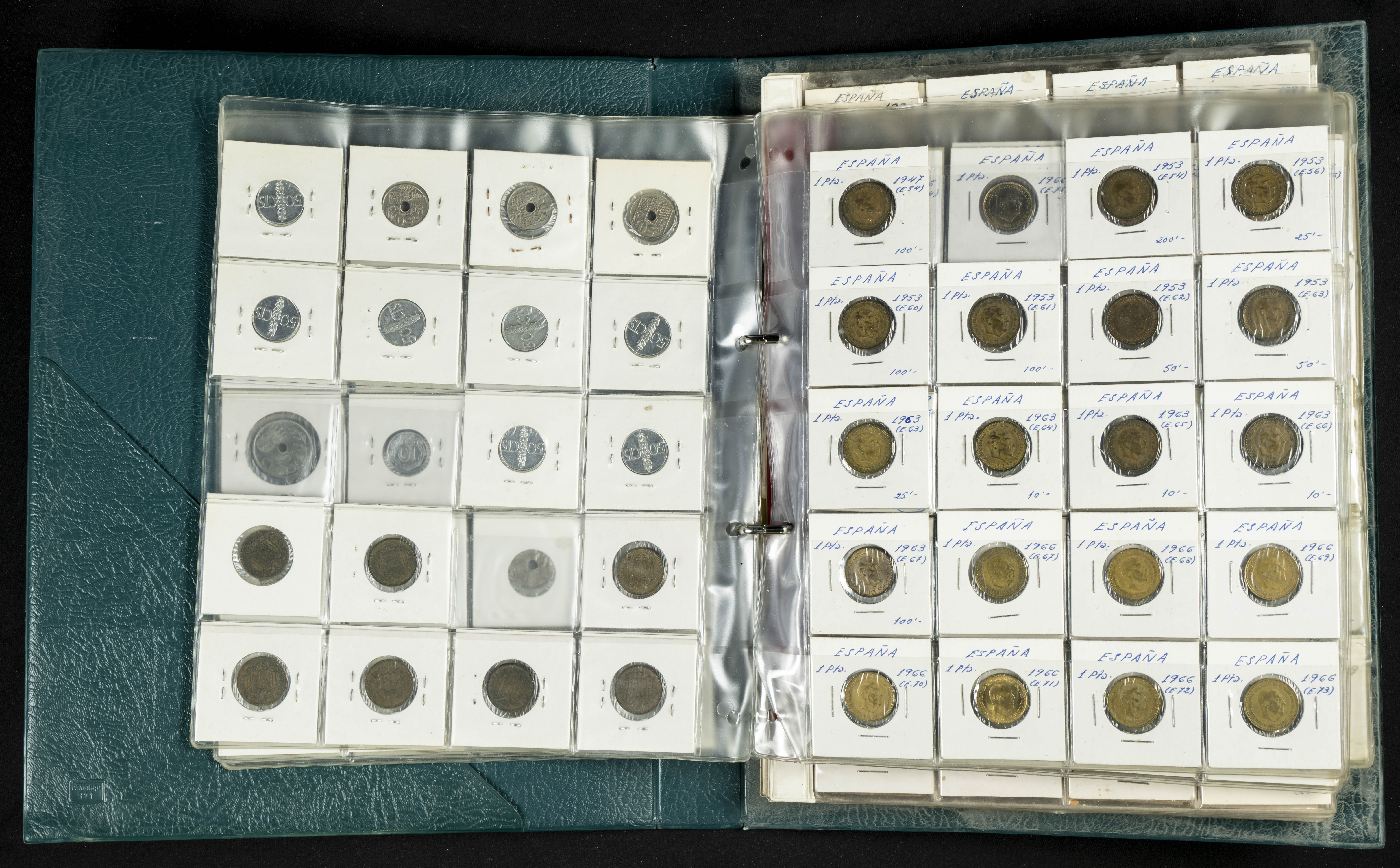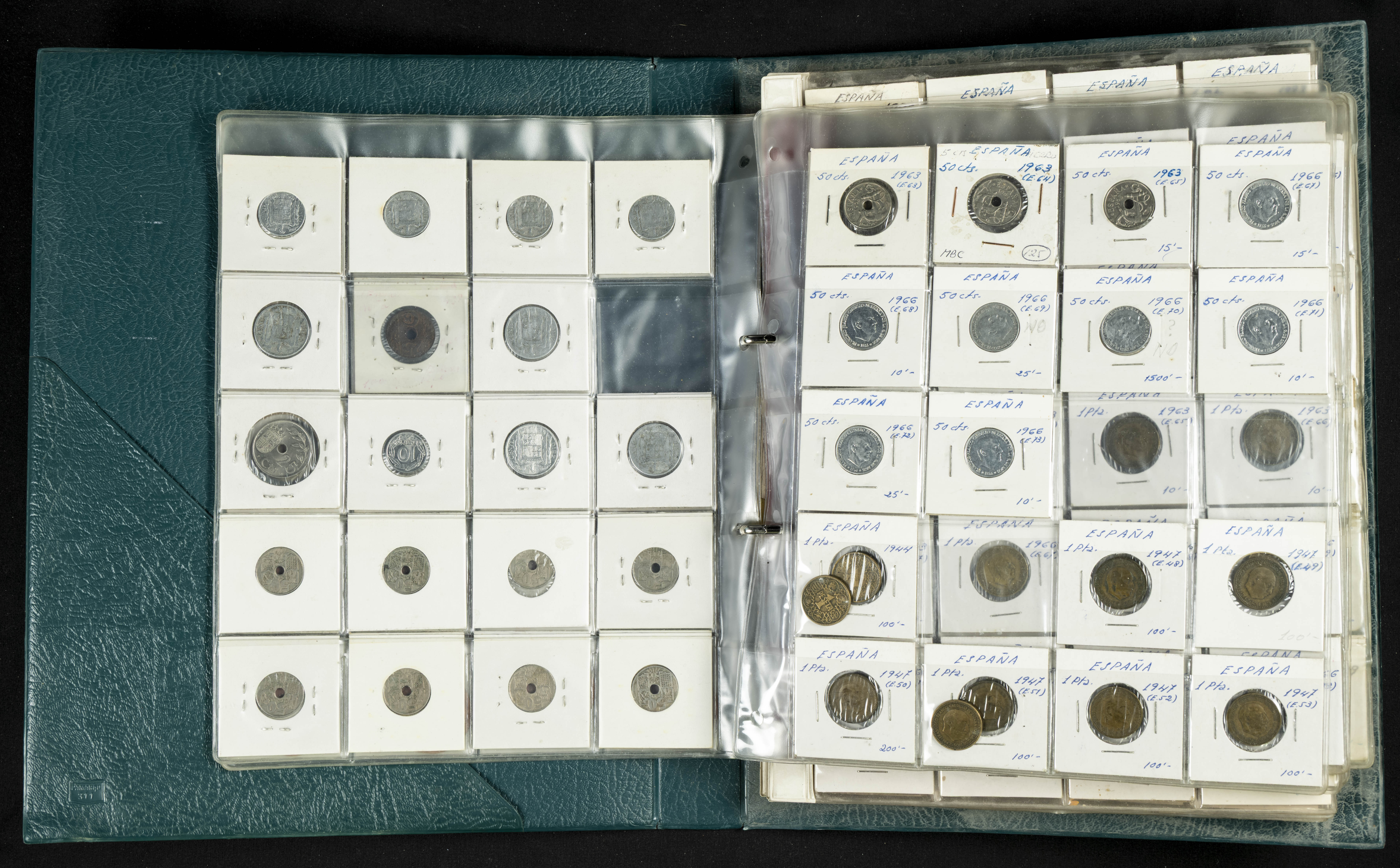 ESPAÑA. Álbum compuesto por alrededor de 300 monedas acuñadas entre los periodos del Centenario de la Peseta y el reinado de Juan Carlos I. Incluye algunos sellos moneda y algunas fichas de casino. Diferentes estados de conservación. A EXAMINAR.