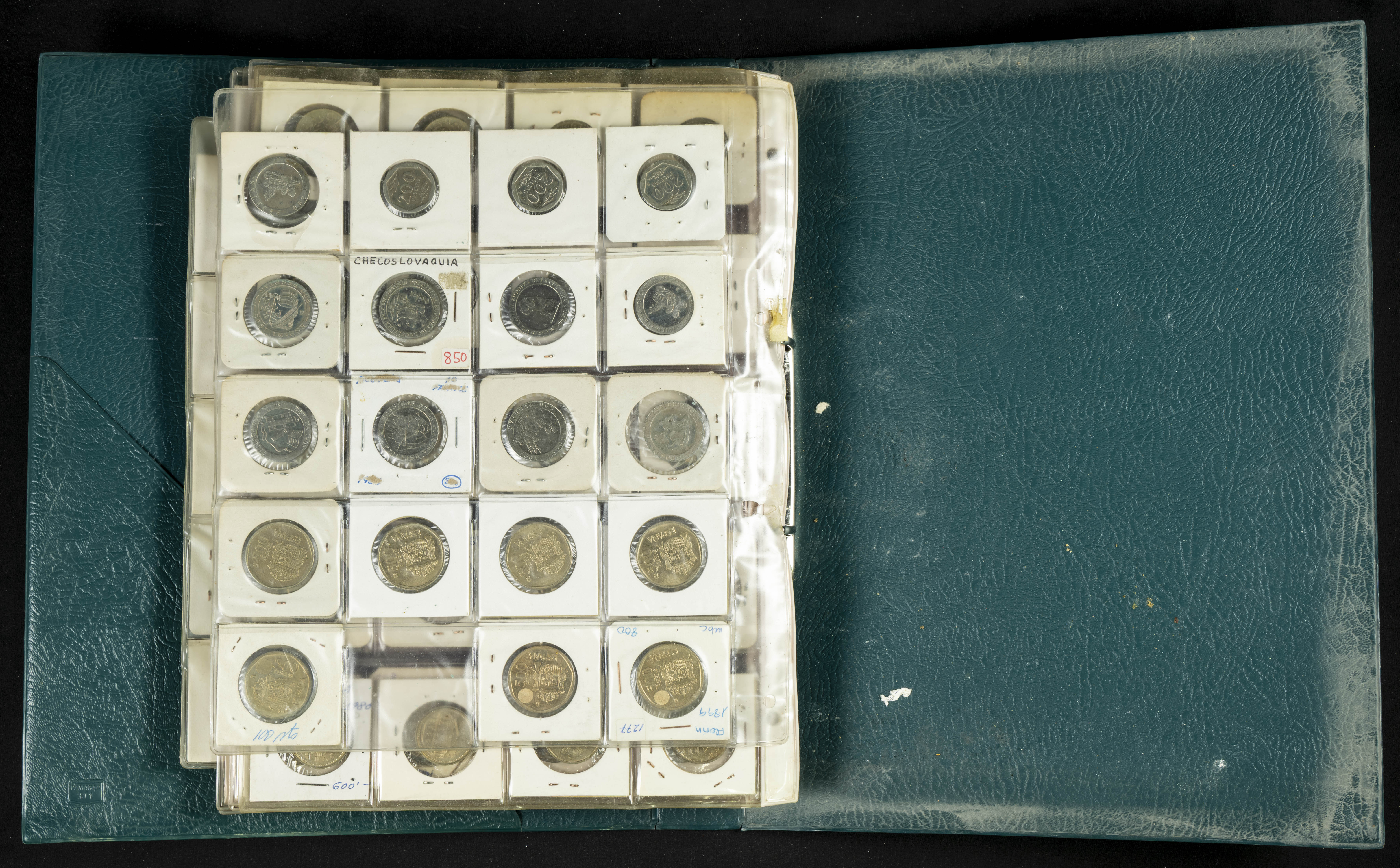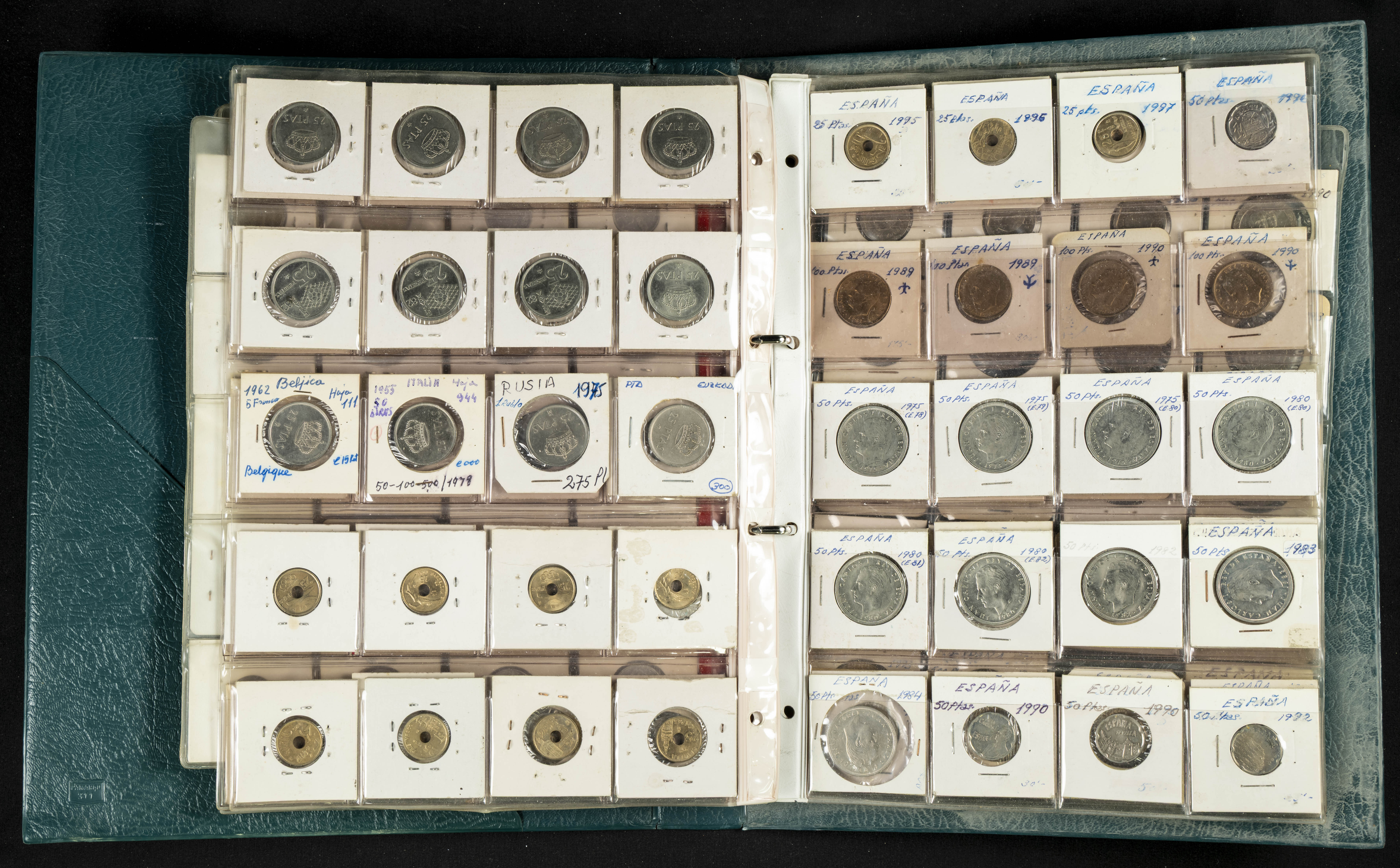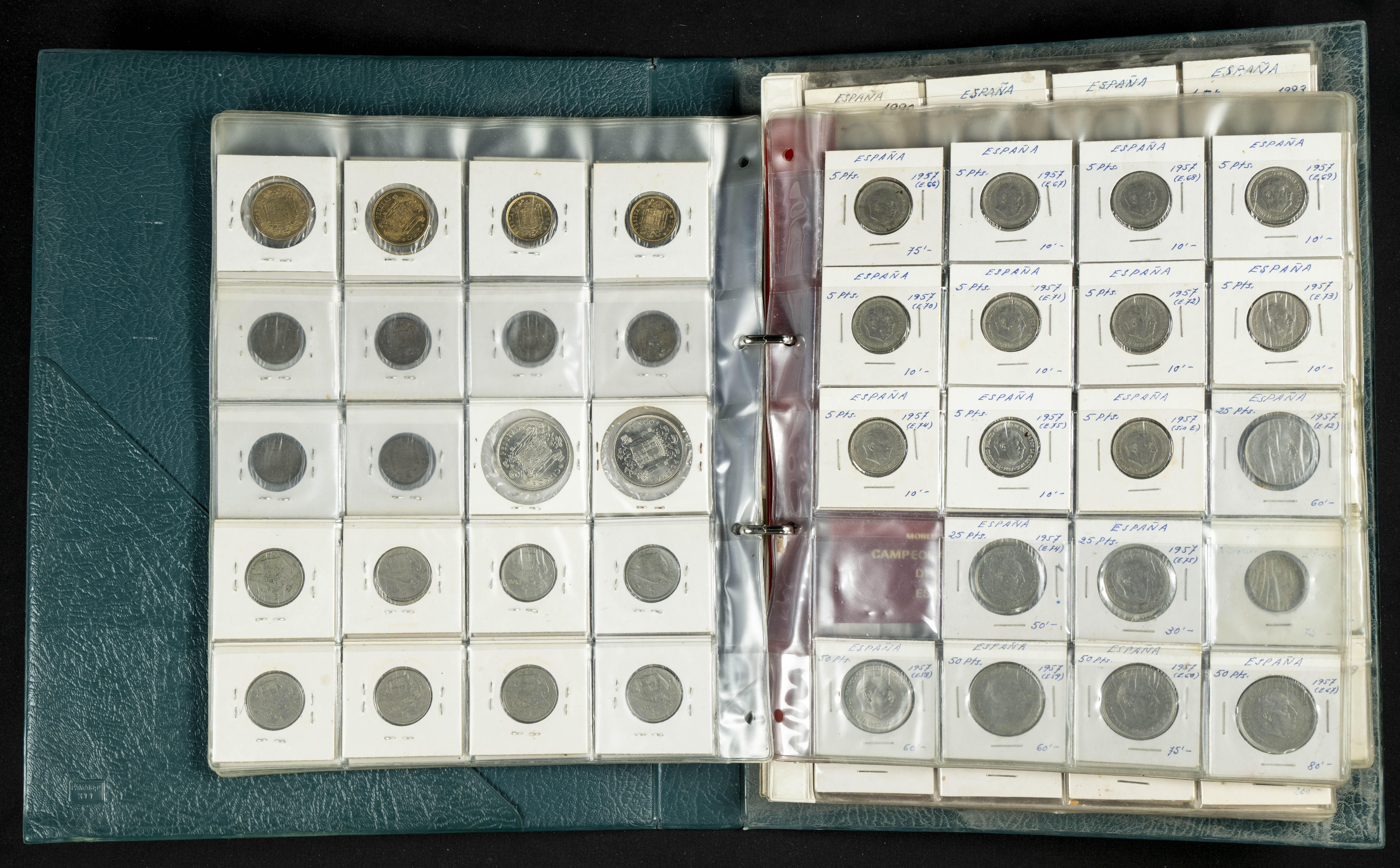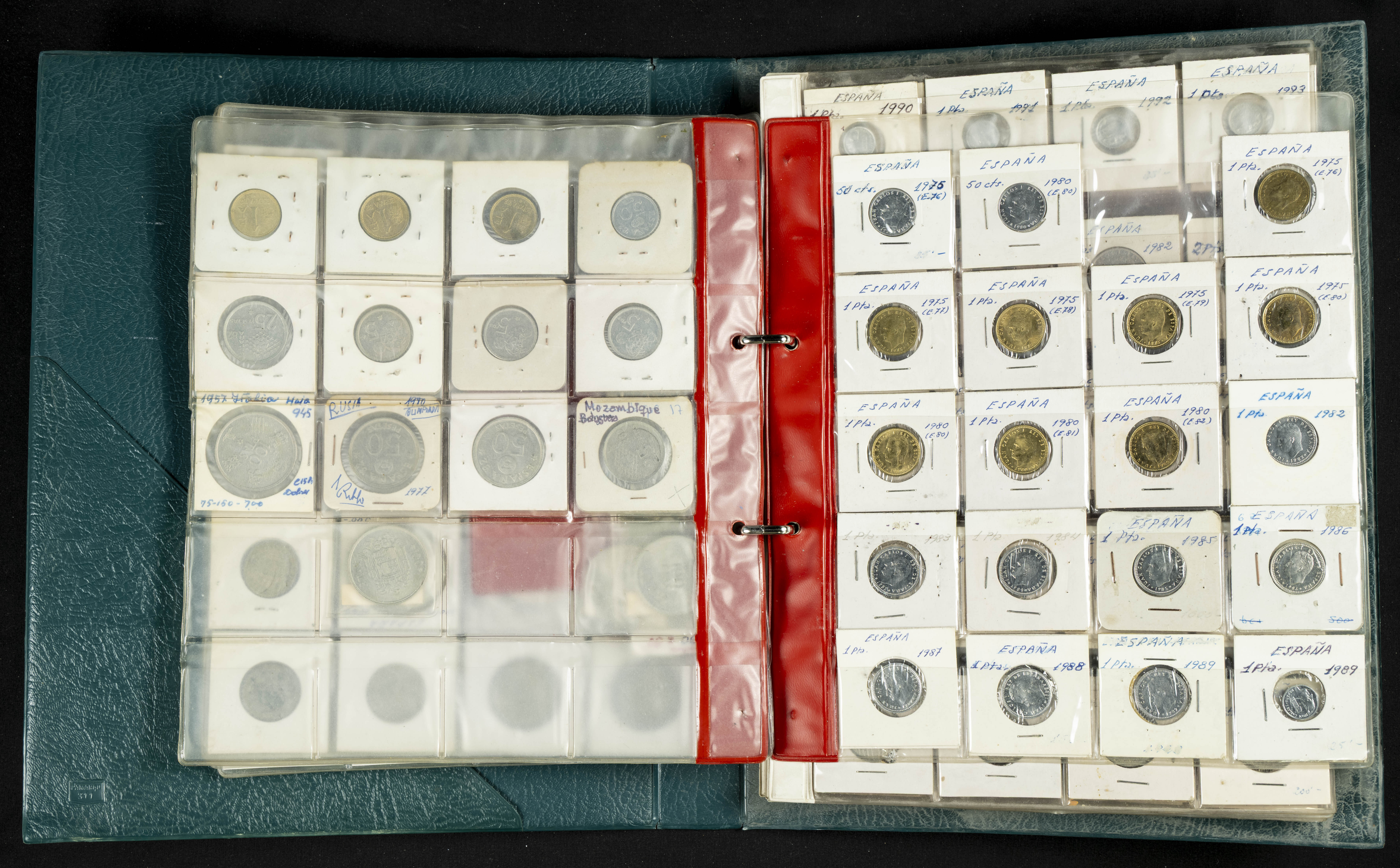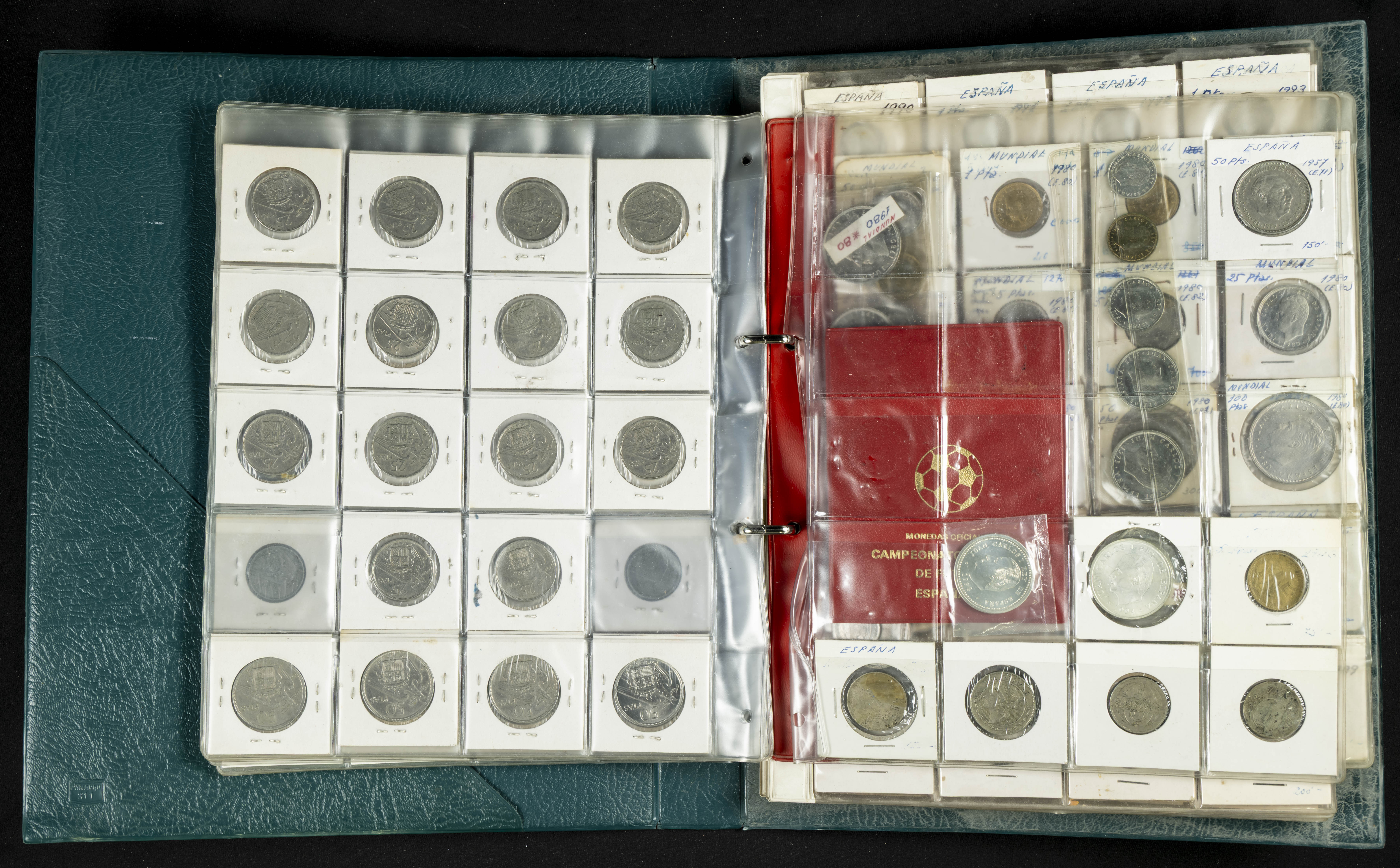 ESPAÑA. Álbum compuesto por alrededor de 300 monedas acuñadas entre los periodos del Centenario de la Peseta y el reinado de Juan Carlos I. Incluye algunos sellos moneda y algunas fichas de casino. Diferentes estados de conservación. A EXAMINAR.