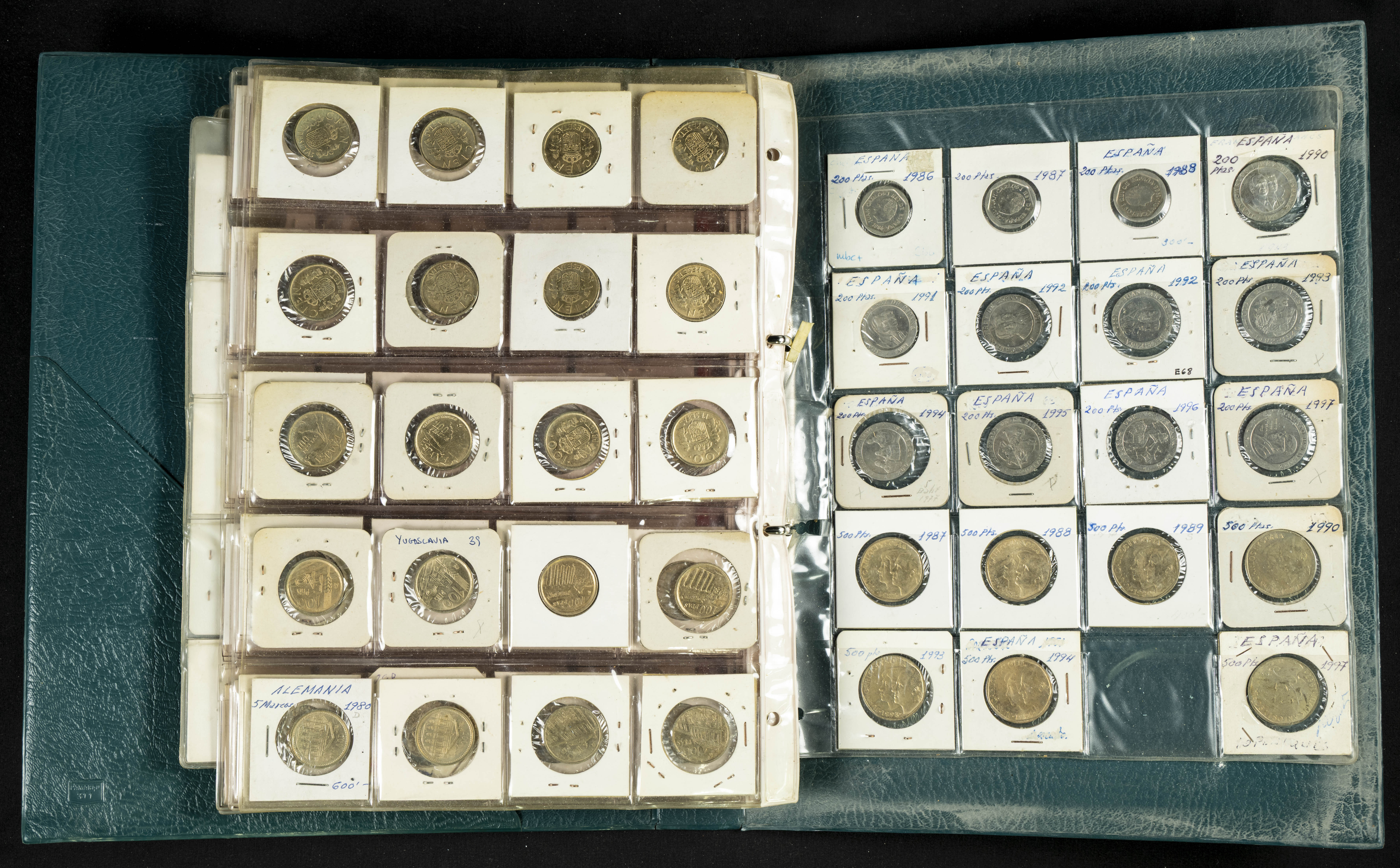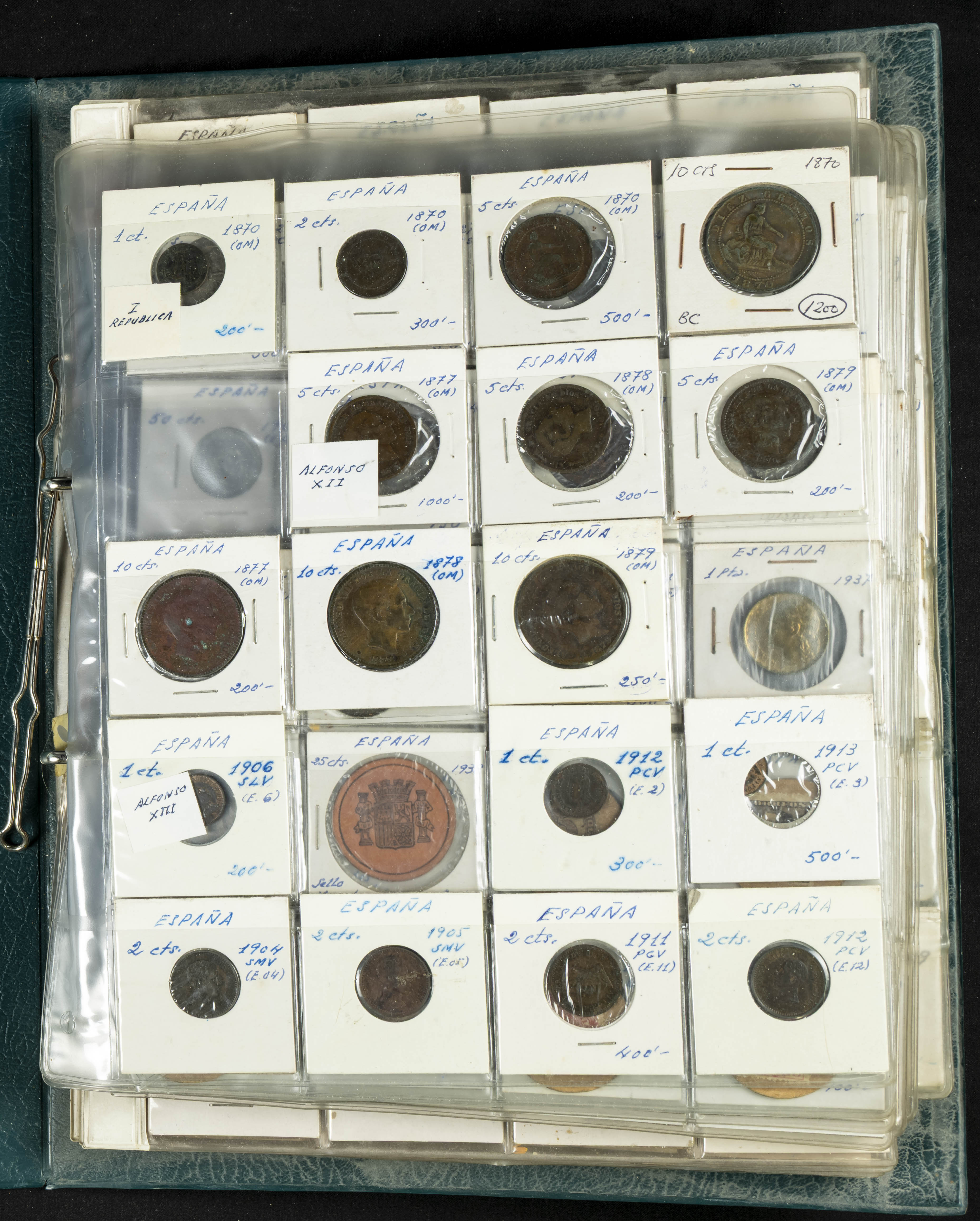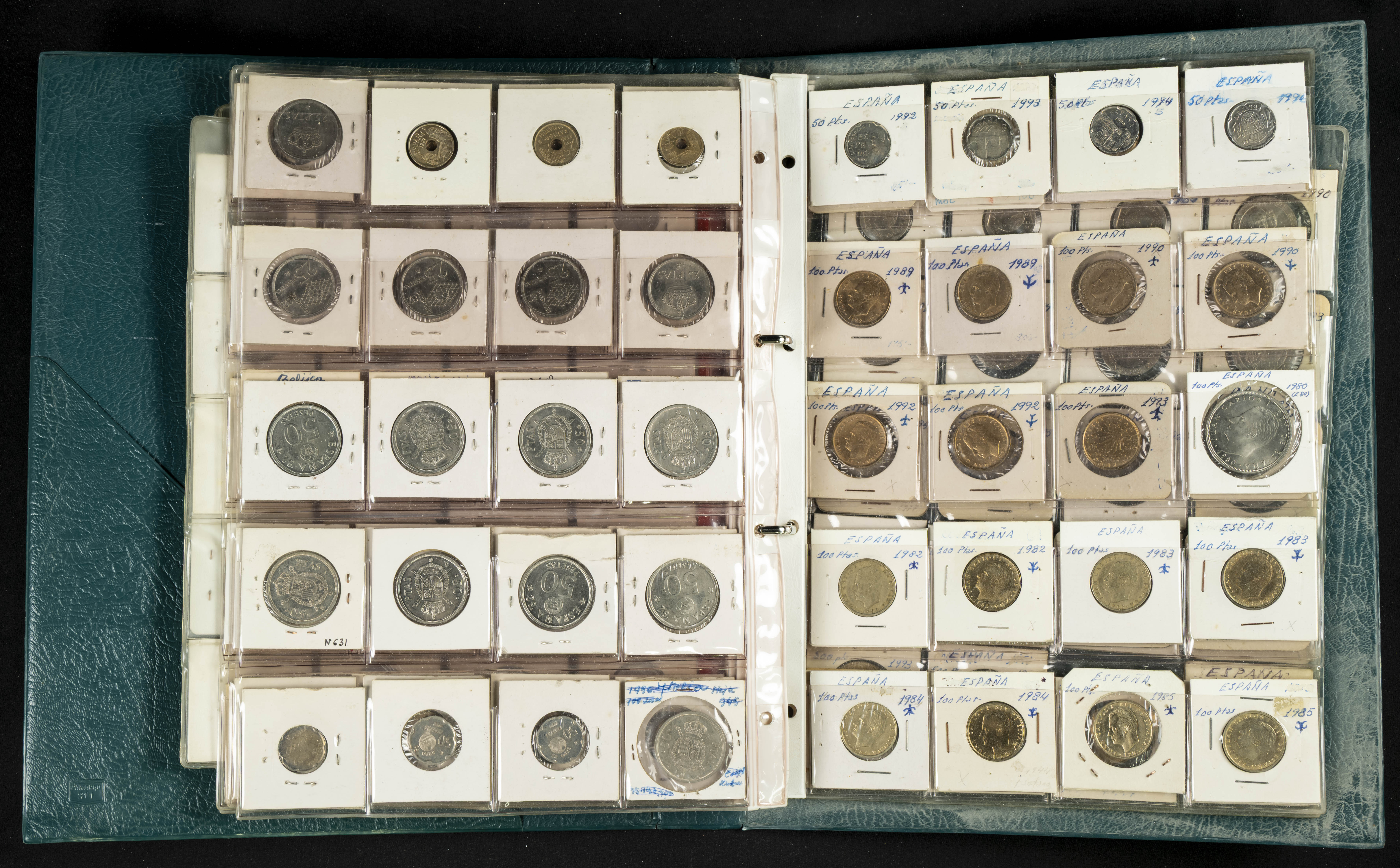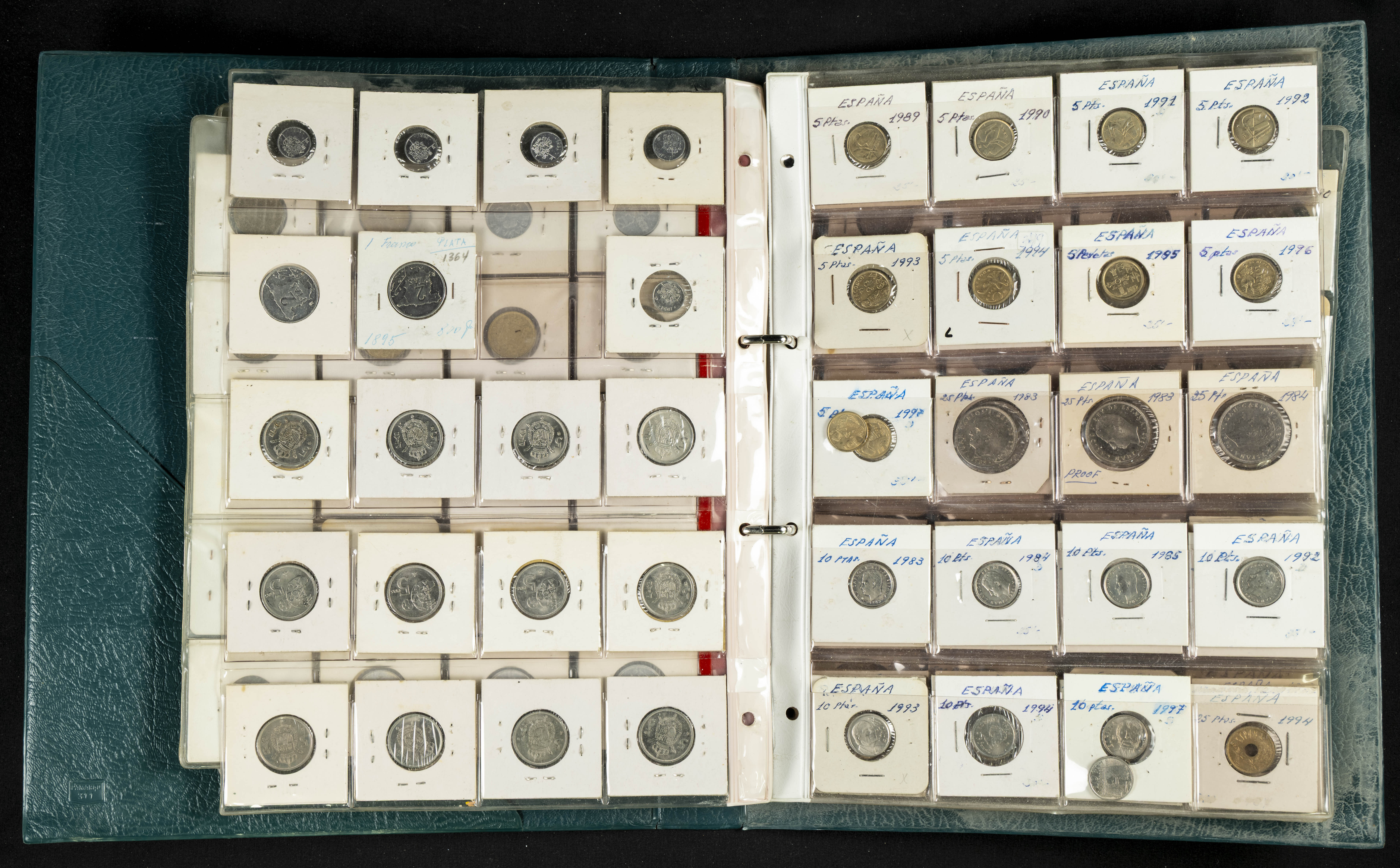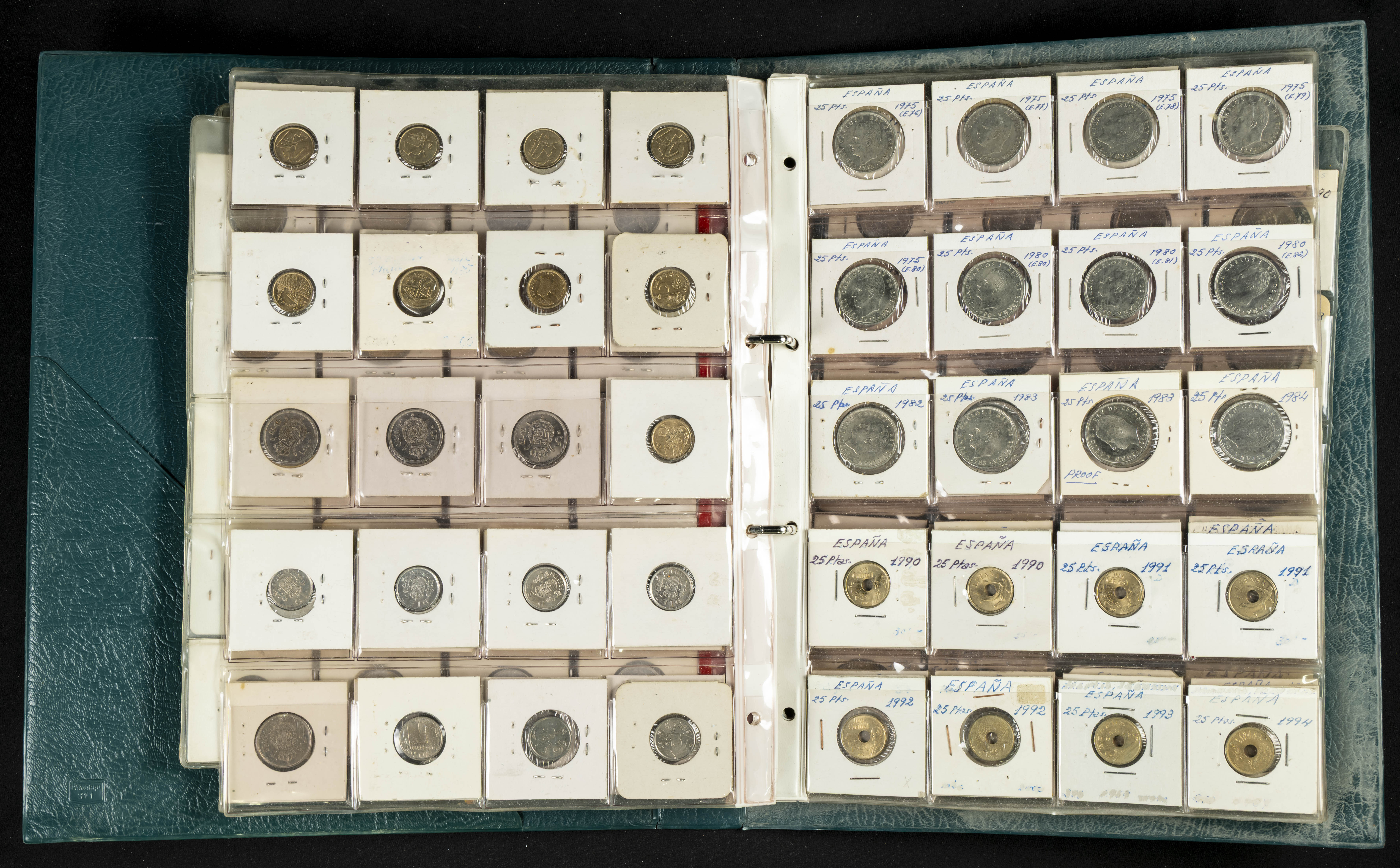 ESPAÑA. Álbum compuesto por alrededor de 300 monedas acuñadas entre los periodos del Centenario de la Peseta y el reinado de Juan Carlos I. Incluye algunos sellos moneda y algunas fichas de casino. Diferentes estados de conservación. A EXAMINAR.