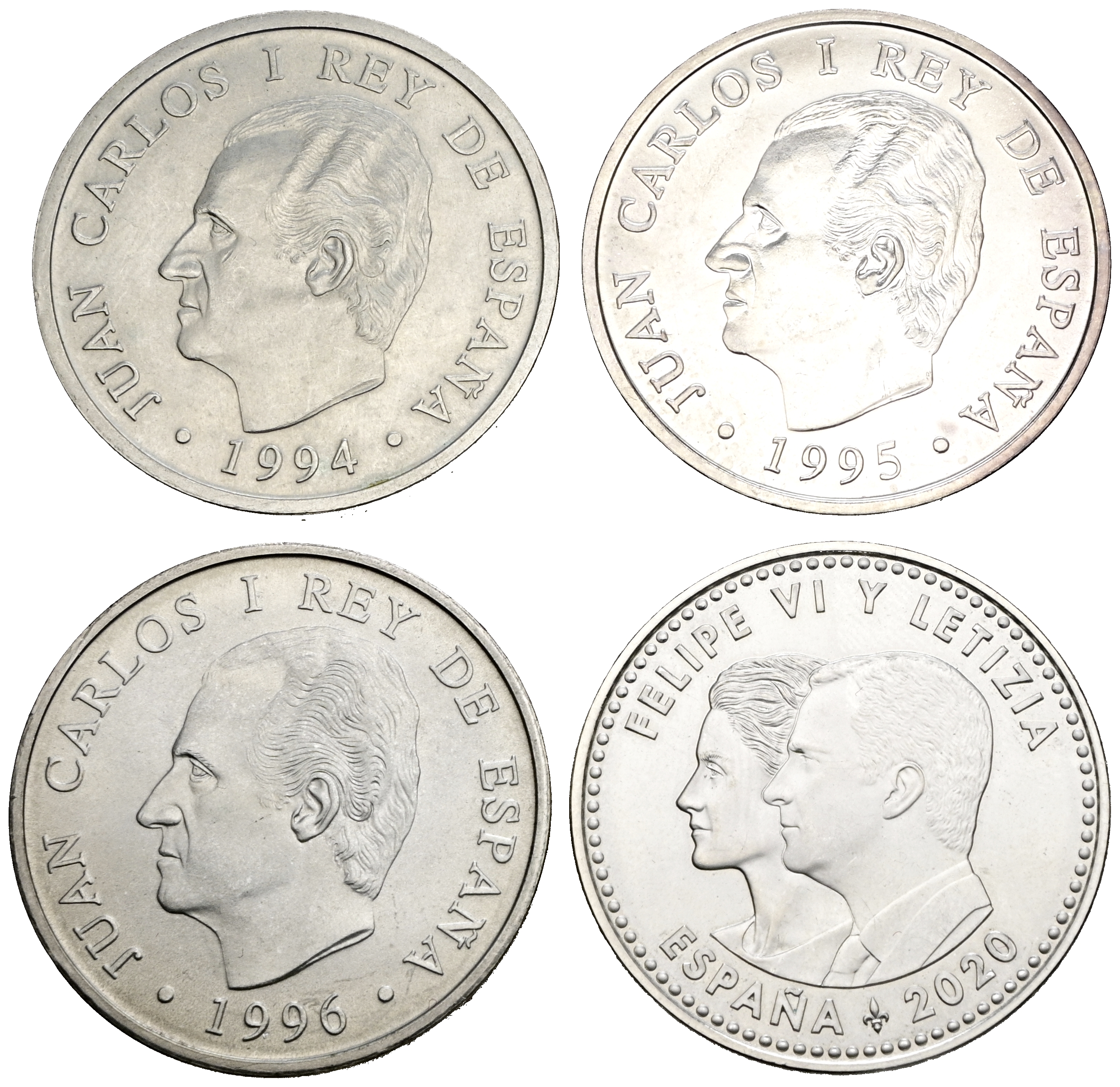 CONTEMPORANEO. Conjunto de 4 acuñaciones en plata con valores de 2.000 pesetas (3) y 30 euros (1). Diferentes medidas y estados de conservación.