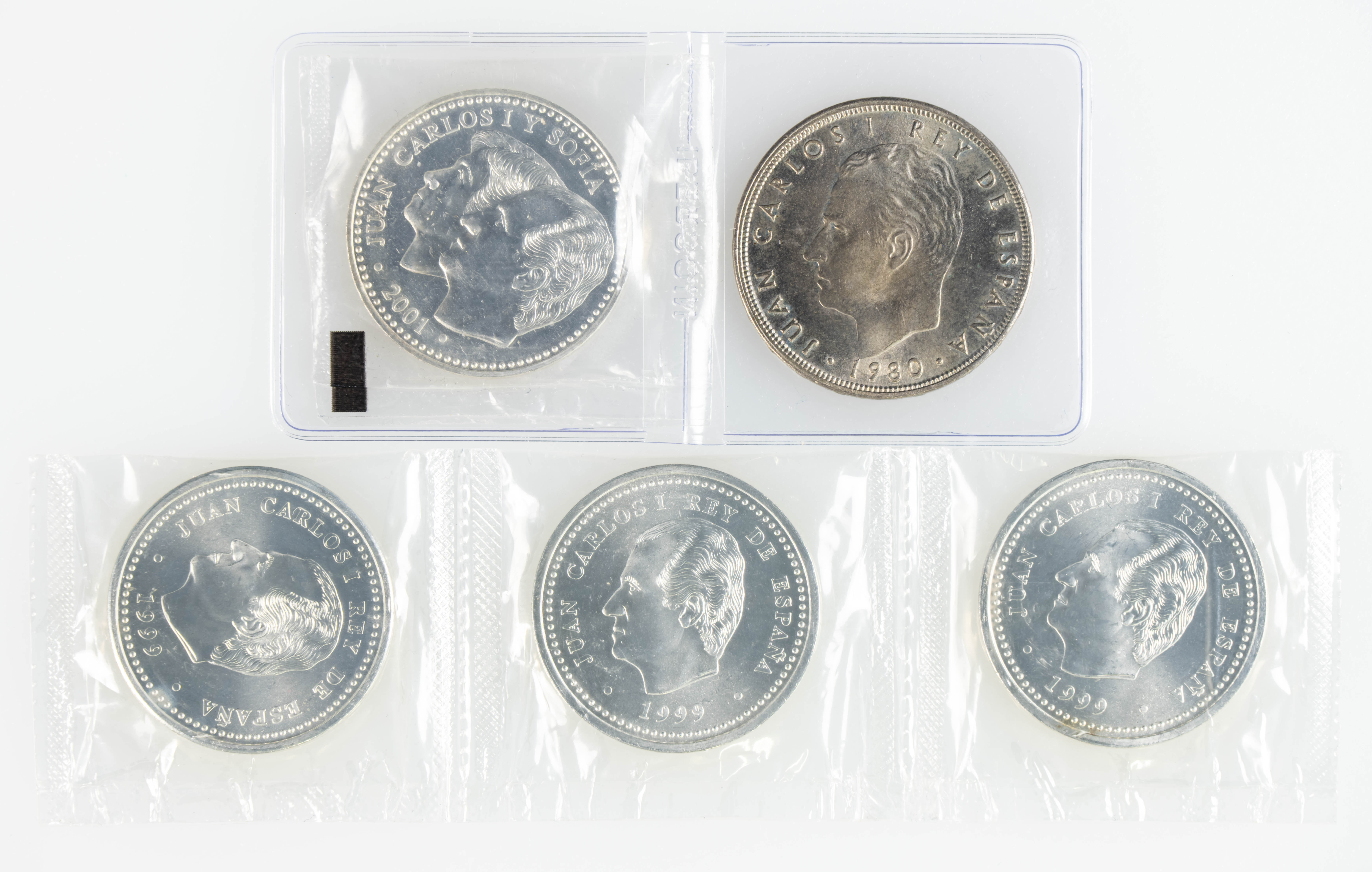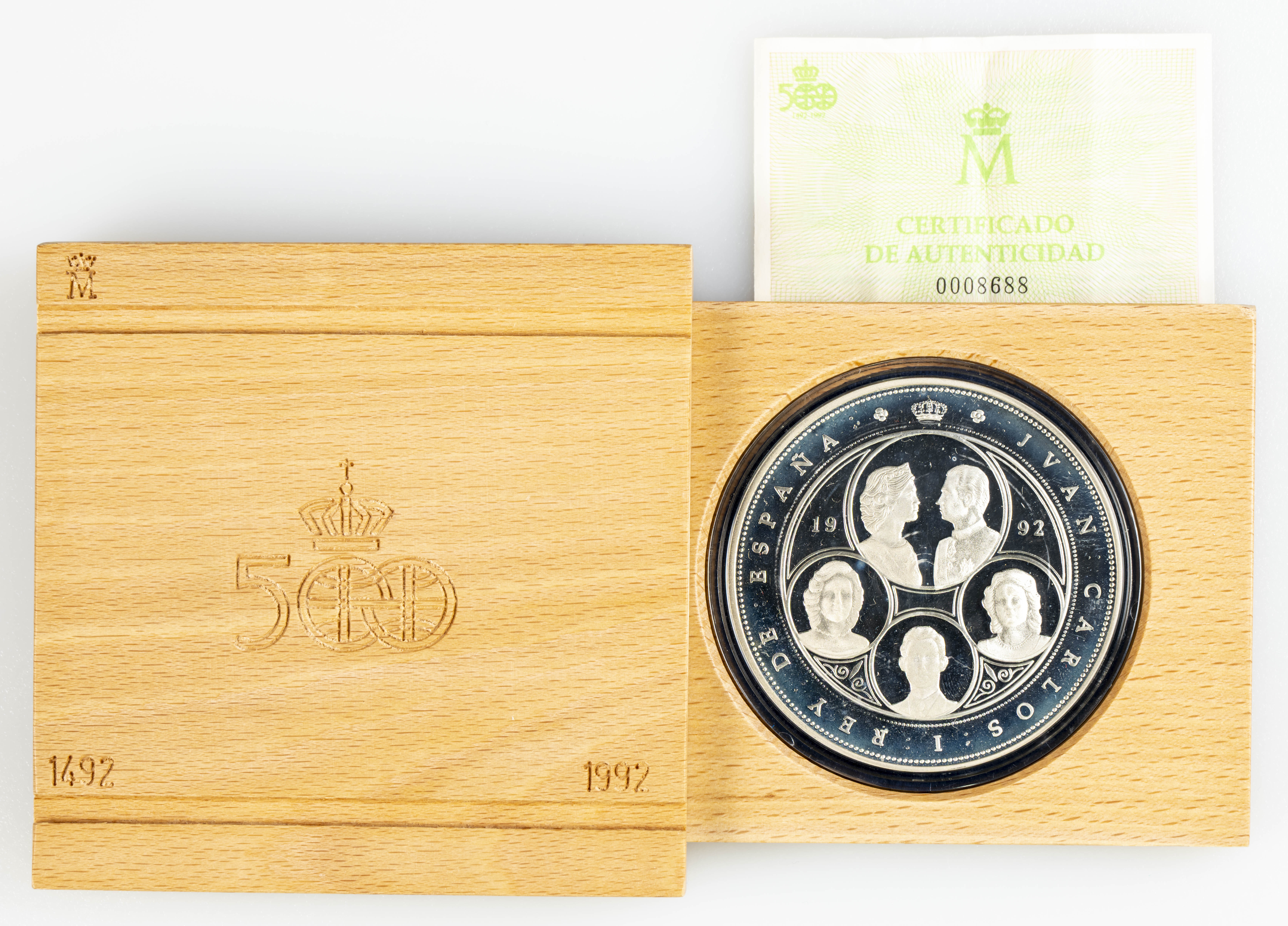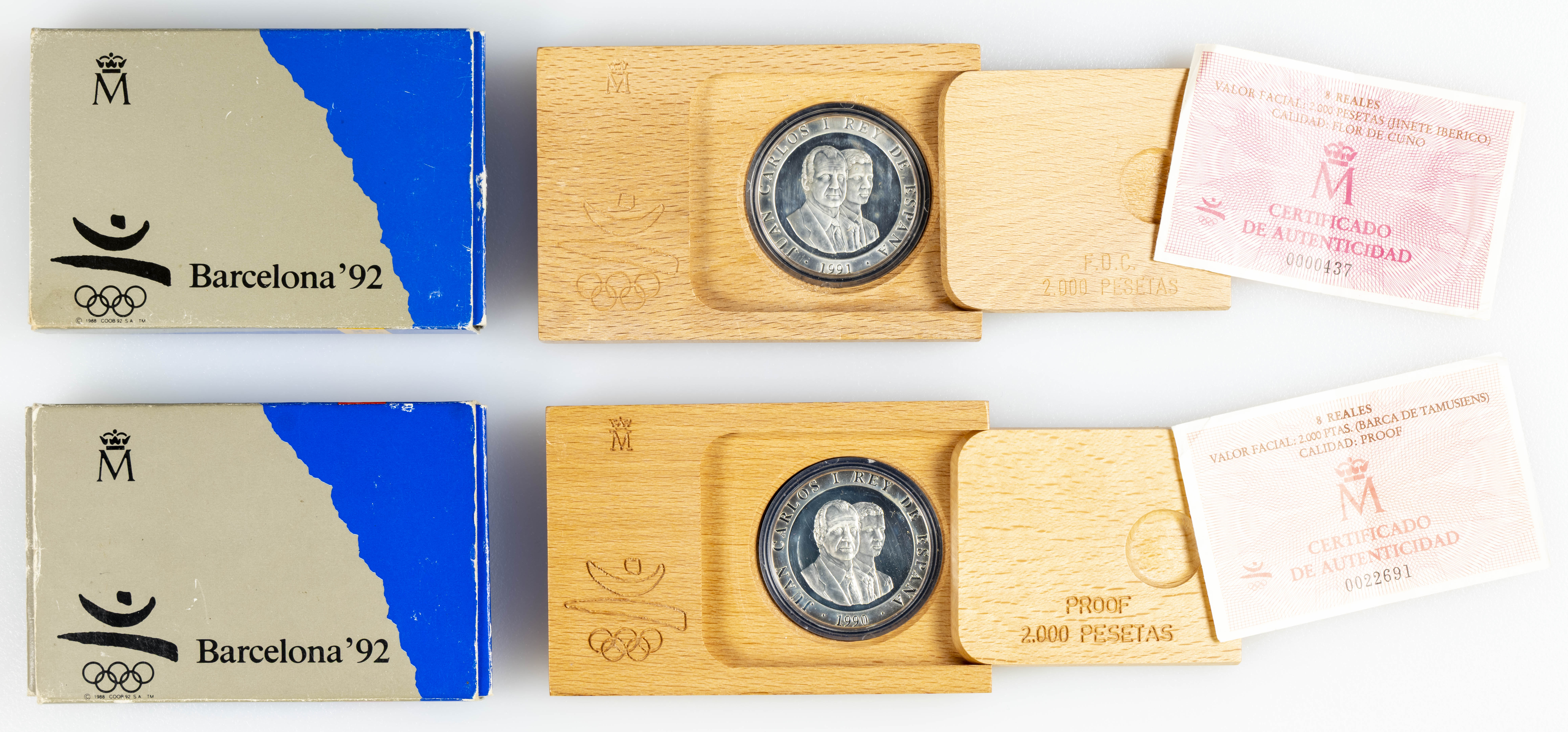 CONTEMPORÁNEO. Conjunto de 8 monedas repartidas en 3 estuches y varios blísters destacando un estuche completo de 10.000 Pesetas del IV Centenario (1992) y 6 ejemplares de 2000 pesetas en plata. A EXAMINAR.