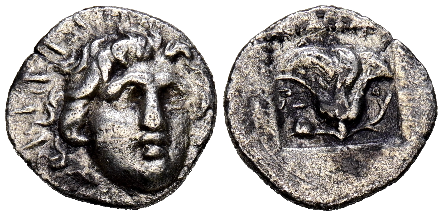 ISLAS DE CARIA, Rhodes. Hemidracma. (Ar. 1,27g/13mm). 250-229 a.C. (SNG Copenhaguen 728). Anv: Cabeza de Helios mirando a derecha. Rev: Rosa con tallo a izquierda, encima: ΑΙΝΗΤΩΡ, a derecha hoja. MBC-.