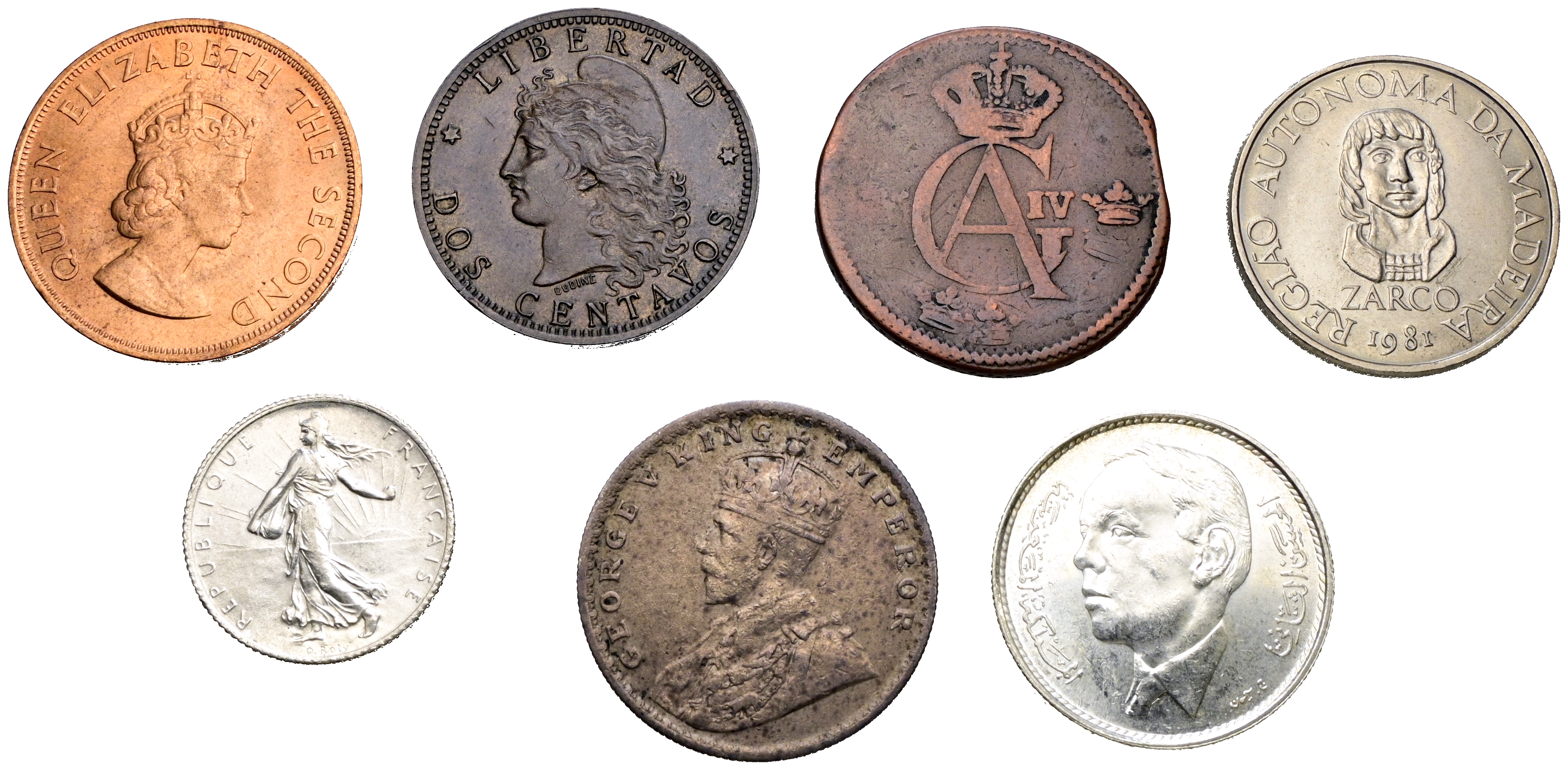 MONEDAS EXTRANJERAS. Precioso conjunto de 7 monedas, 3 de ellas en plata, de diferentes países, módulos y épocas. Diferentes estados de conservación. A EXAMINAR.