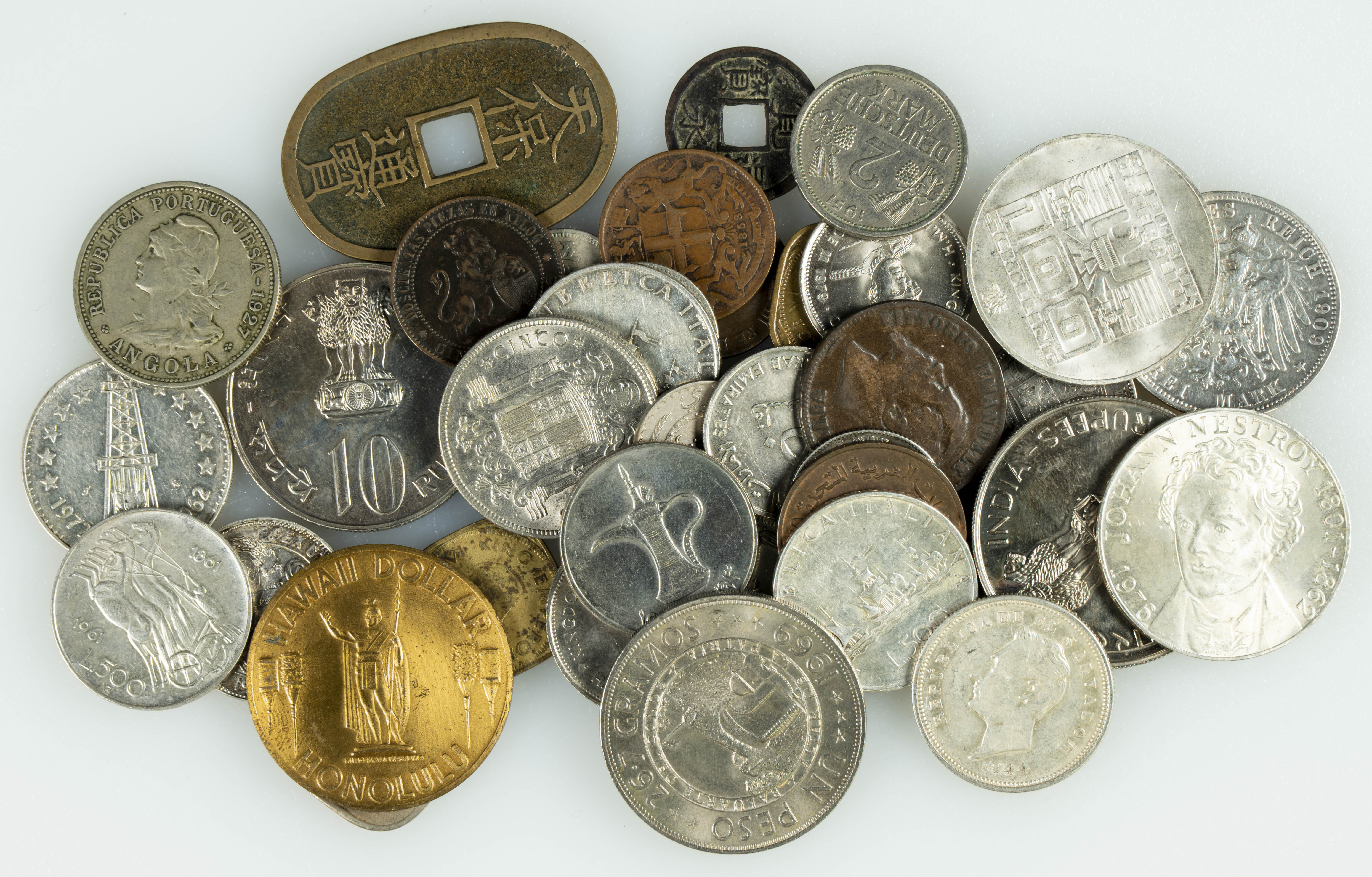 MONEDAS EXTRANJERAS. Interesante y bonito conjunto formado por 40 monedas mundiales, principalmente del siglo XX, con una gran variedad de módulos, países y materiales representados (incluye piezas en plata y 3 monedas españolas). Sin piezas repetidas. Diferentes estados de conservación. A EXAMINAR.