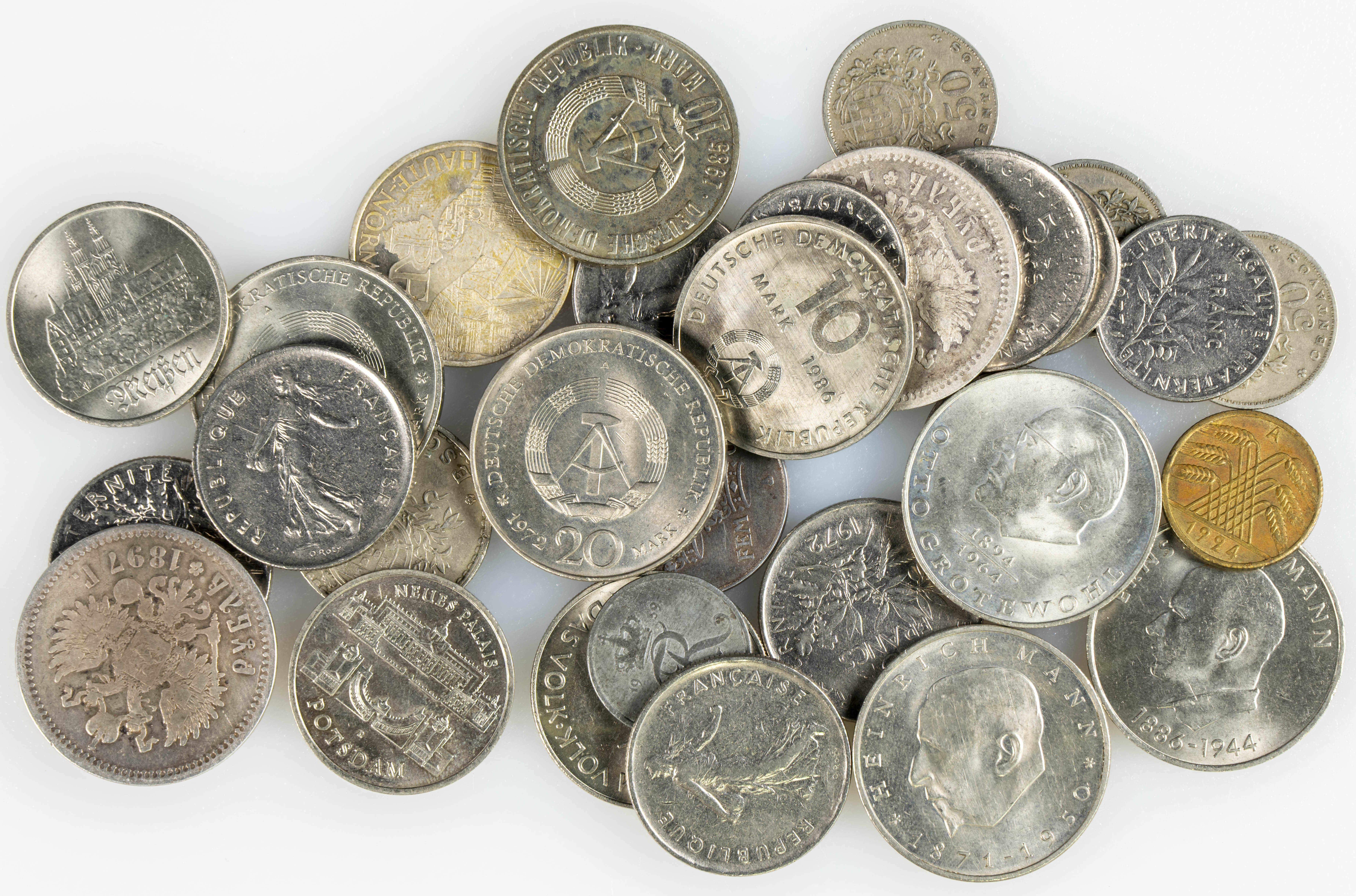 MONEDAS EXTRANJERAS. Interesante y variado conjunto de 48 monedas de diferentes países europeos acuñadas entre los siglos XIX y XX. Variedad de módulos y materiales, incluyendo la plata, destacando 2 piezas de Rublo de Nicolas II y un par de sets modernos de acuñaciones privadas. Diferentes estados de conservación. A EXAMINAR.