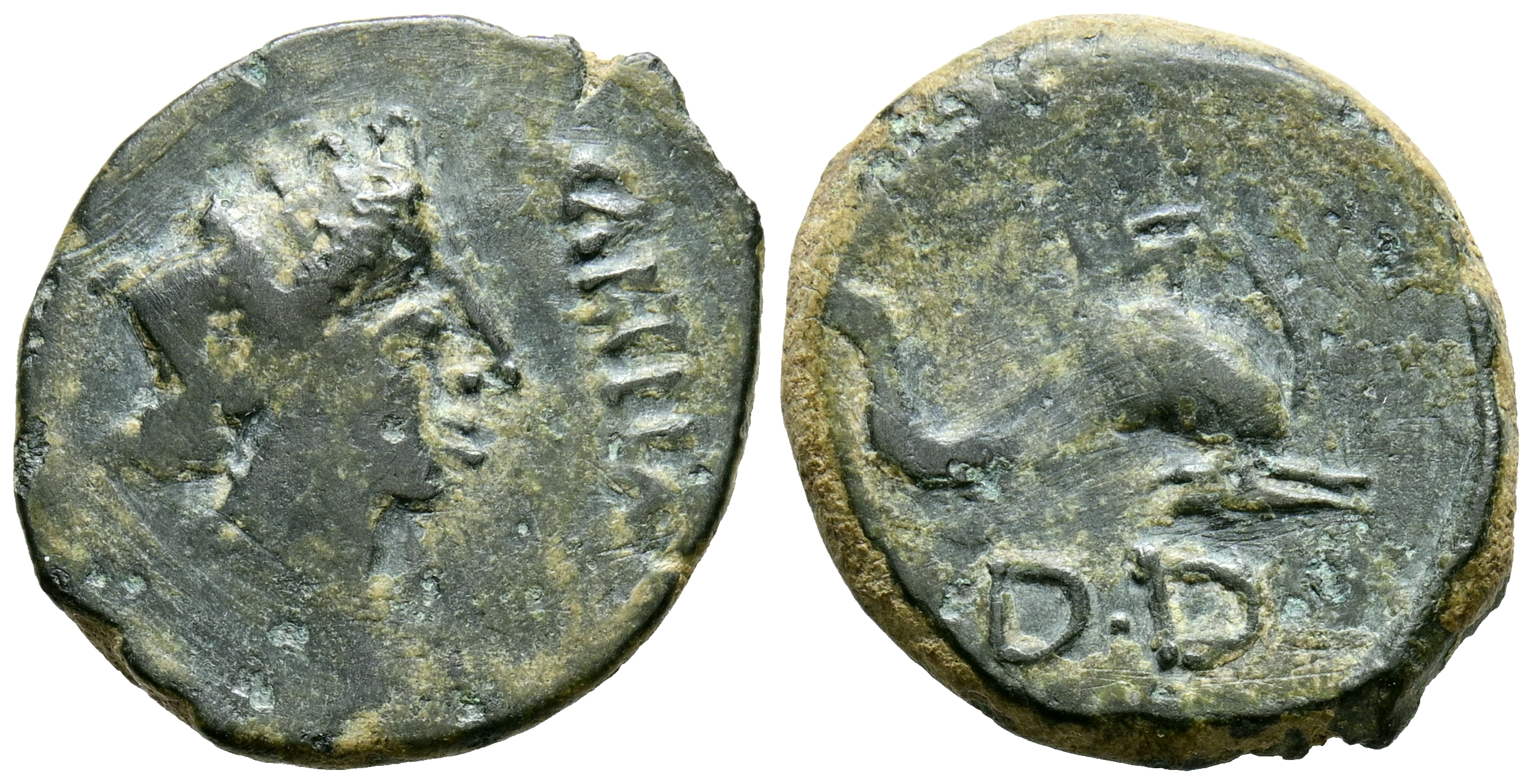 CARTEIA (San Roque, Cádiz). Cuadrante. (Ae. 4,01g/20mm). 14-36 d.C. (FAB-670). Anv: Cabeza femenina con corona mural a derecha, delante CARTEIA, detrás tridente. Rev: Amorcillo sobre delfín a derecha, encima : III VIR, debajo: EX DD. MBC-.