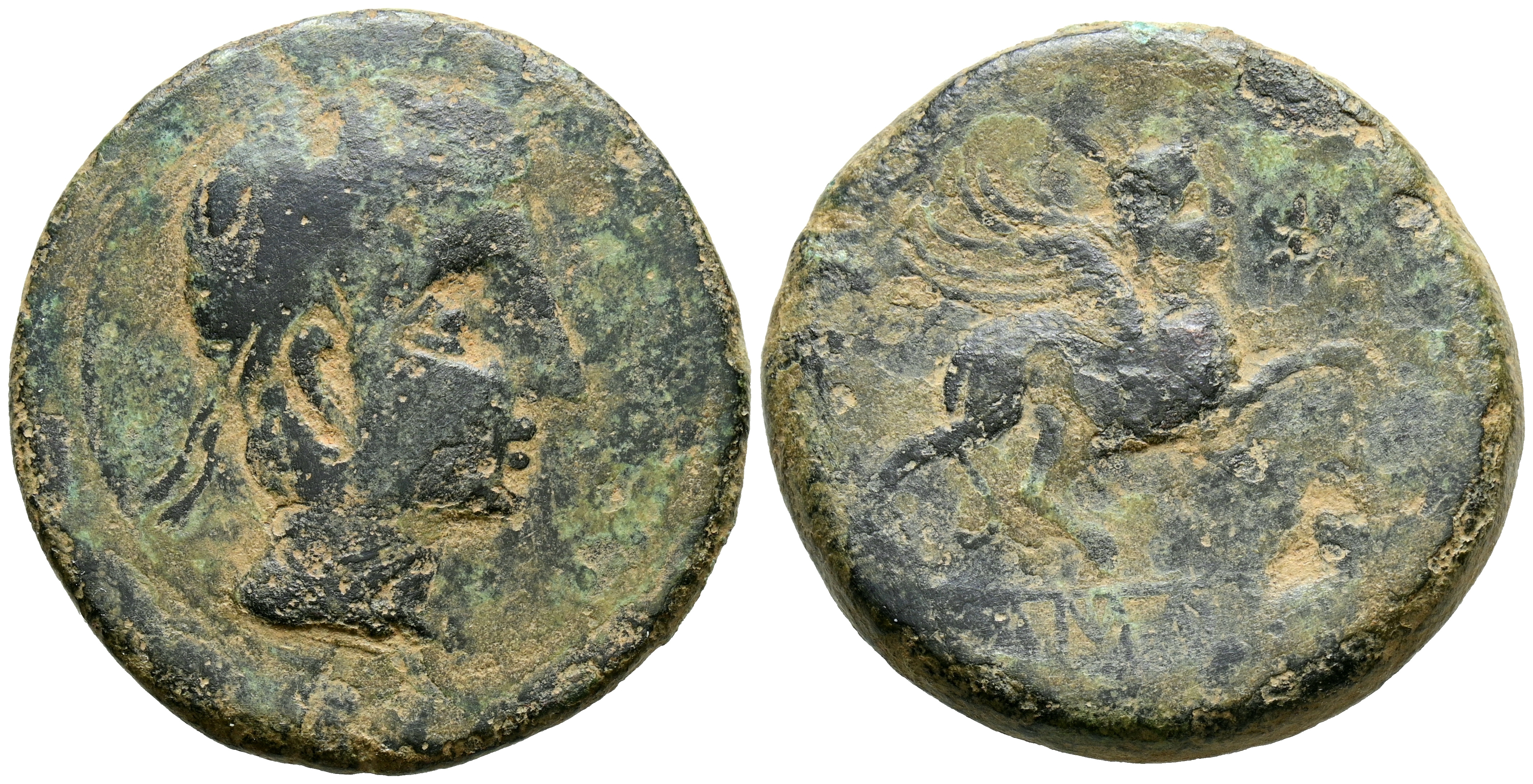 CASTULO (Cazlona, Jaén). As. (Ae. 17,37g/30mm). 180 a.C. FAB-697). Anv: Cabeza masculina diademada a derecha. Rev: Esfinge a derecha, delante estrella y letra ibérica Co, debajo leyenda ibérica: CaSTeLE. MBC-.