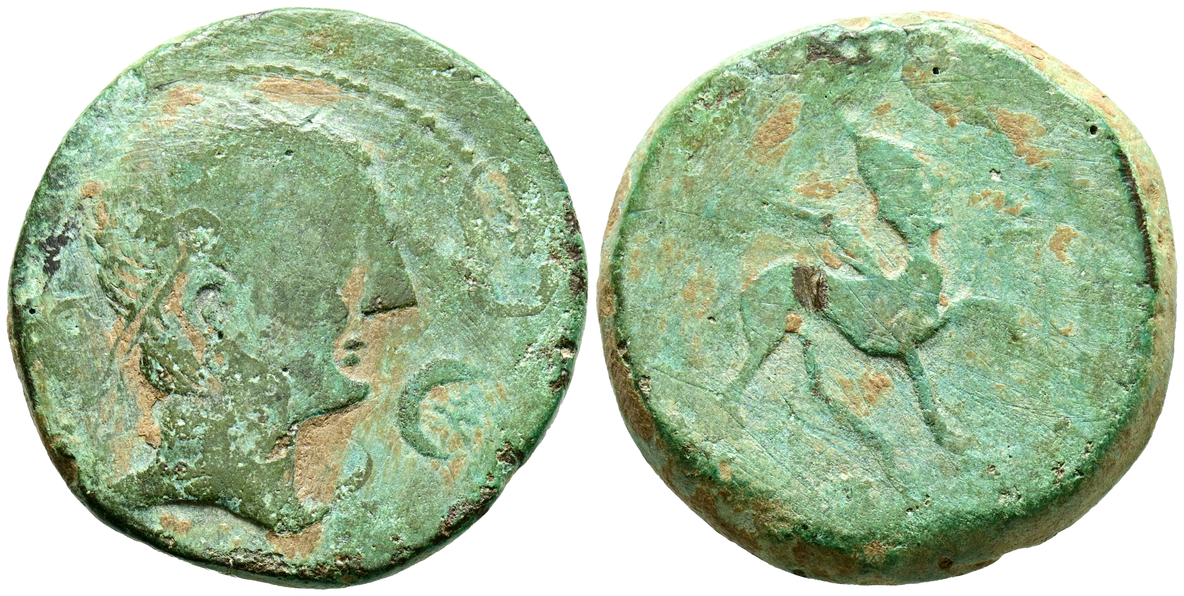CASTULO (Cazlona, Jaén). As. (Ae. 18,58g/28mm). 180 a.C. (FAB-702). Anv: Cabeza masculina diademada a derecha, delante creciente. Rev: Esfinge a derecha, delante estrella, debajo leyenda ibérica: CaSTeLE. BC+. Limpieza muy agresiva.