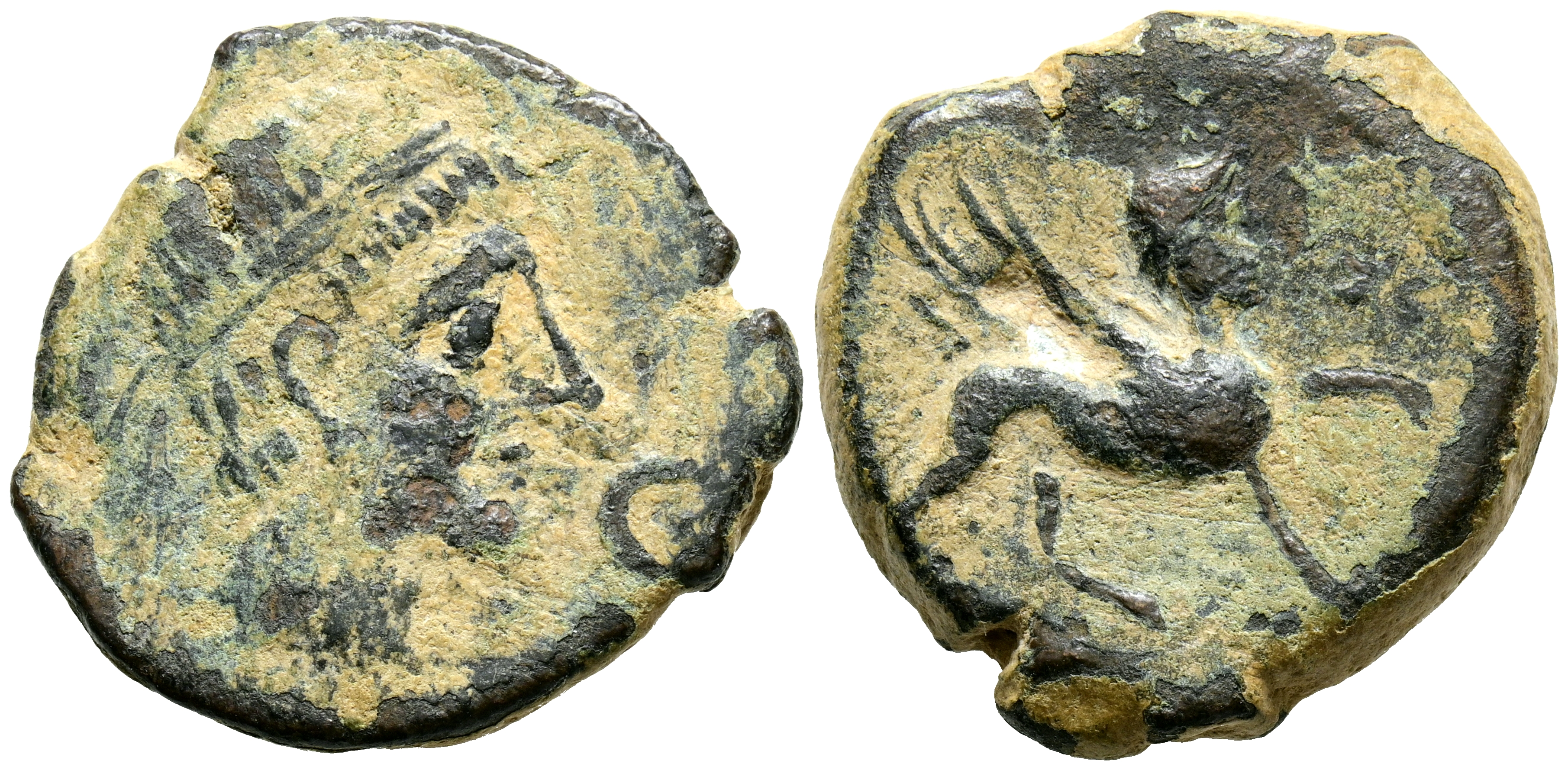 CASTULO (Cazlona, Jaén). As. (Ae. 12,32g/25mm). 180 a.C. (FAB-702). Anv: Cabeza masculina diademada a derecha, delante creciente. Rev: Esfinge a derecha, delante estrella, debajo leyenda ibérica: CaSTeLE. BC+.