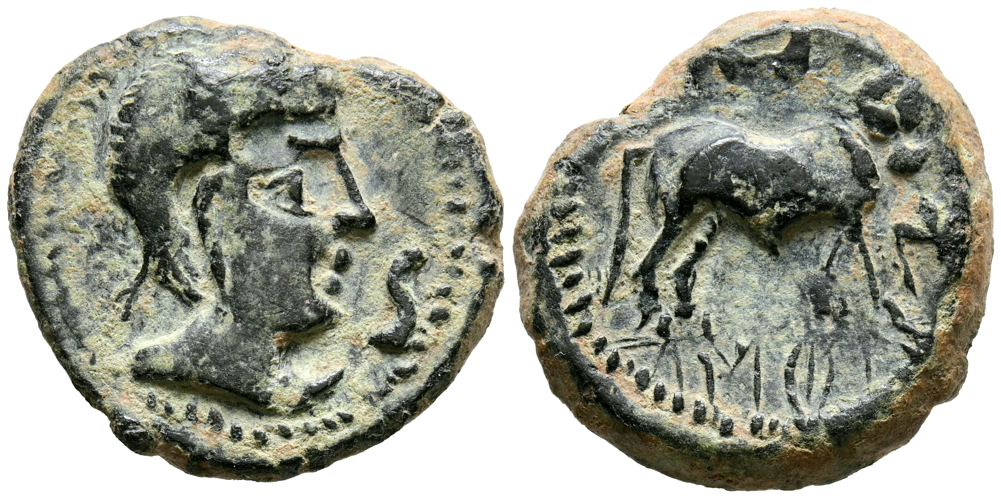 CASTULO (Cazlona, Jaén). Semis. (Ae. 8,83g/23mm). 180 a.C. (FAB-715). Anv: Cabeza masculina diademada a derecha, delante S. Rev: Toro a derecha, encima creciente, delante letra ibérica S, debajo leyenda ibérica: CaSTeLe. MBC+.