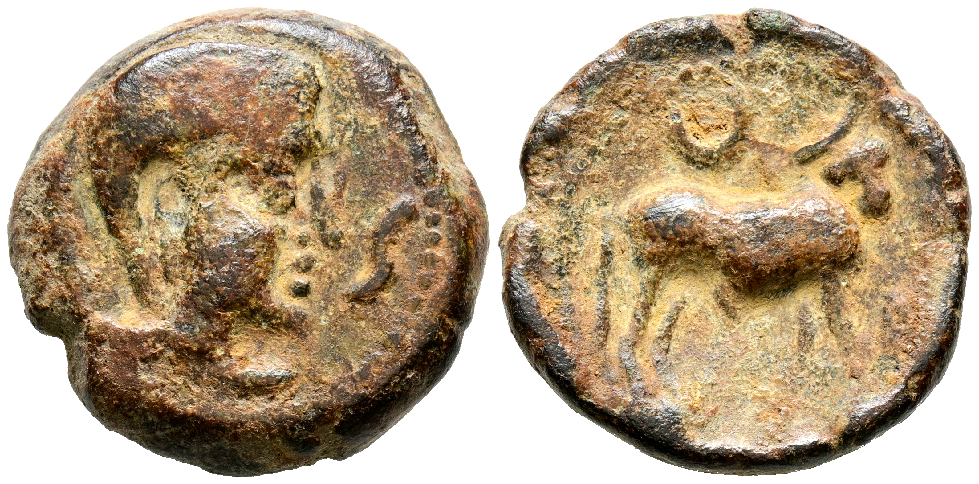 CASTULO (Cazlona, Sevilla). Semis. (Ae. 9,22g/22mm). 180 a.C. (FAB-715). Anv: Cabeza masculina con diadema a la derecha, delante S. Rev: Toro a la derecha, encima creciente, antes de la letra ibérica Co, en exergo leyenda ibérica: CaSTeLE. MBC-.
