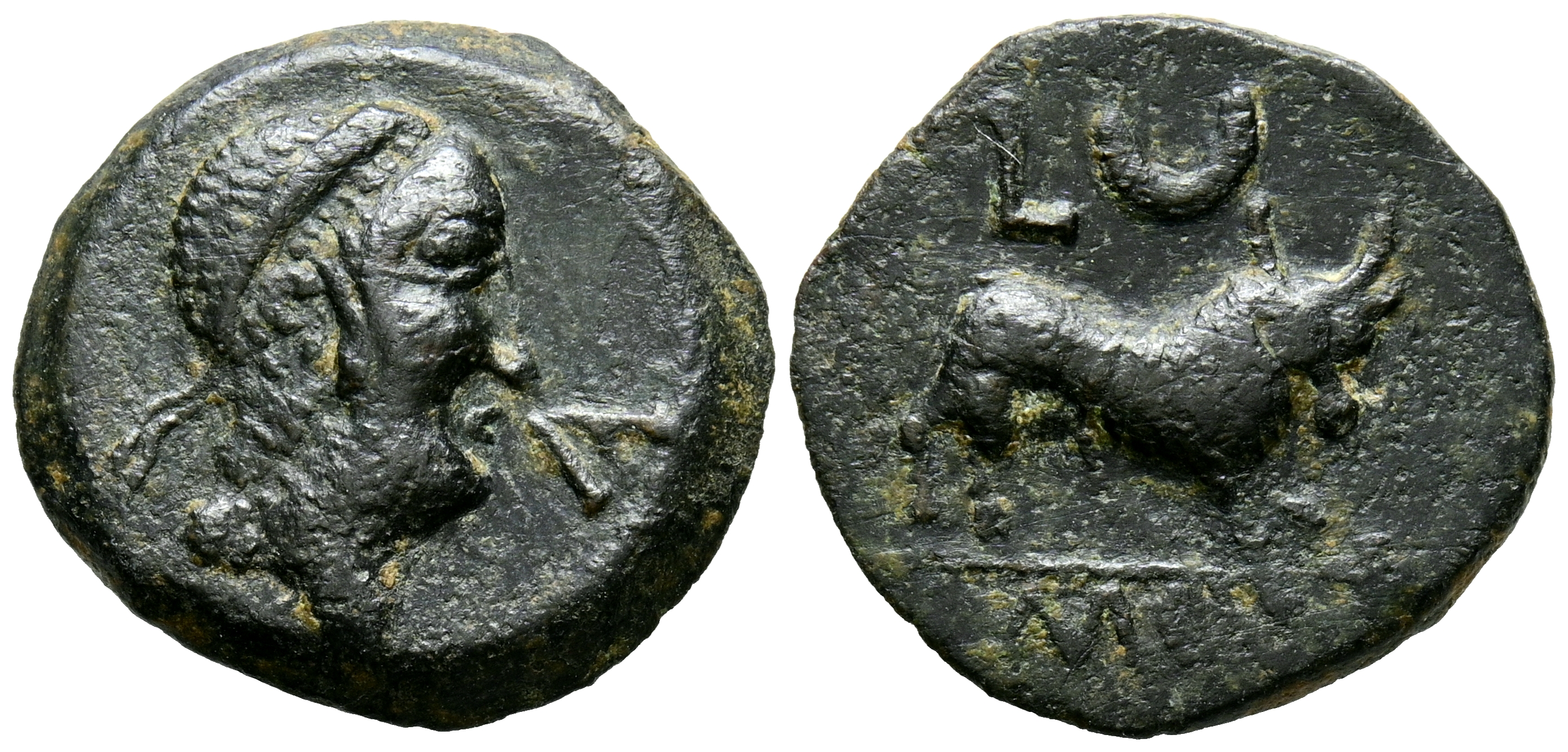 CASTULO (Cazlona, Jaén). Semis. (Ae. 4,14g/19mm). 180 a.C. (FAB-722). Anv: Cabeza masculina diademada a derecha, delante letra ibérica: Ca. Rev: Toro a derecha, encima letra L y creciente, en exergo leyenda ibérica: CaSTeLe. MBC.