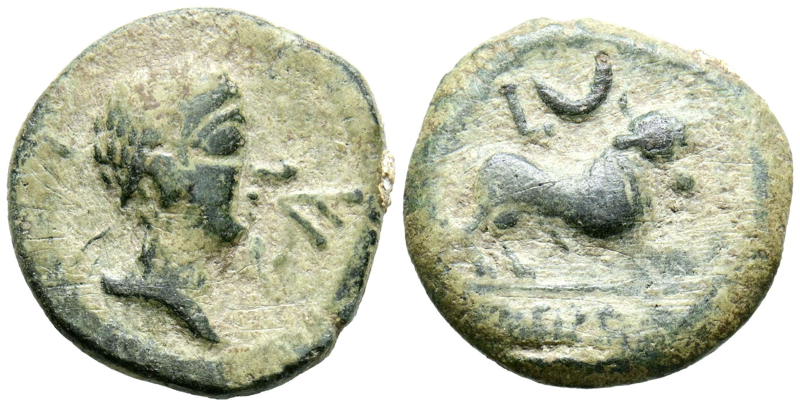 CASTULO (Cazorla, Jaén). Semis. (Ae. 4,49g/19mm). 180 a.C. (FAB-722). Anv: Cabeza masculina diademada a derecha, delante letra ibérica: Ca. Rev: Toro a derecha partiendo leyenda con las patas, encima letra L y creciente, en exergo leyenda ibérica: CaSTeLe. MBC.
