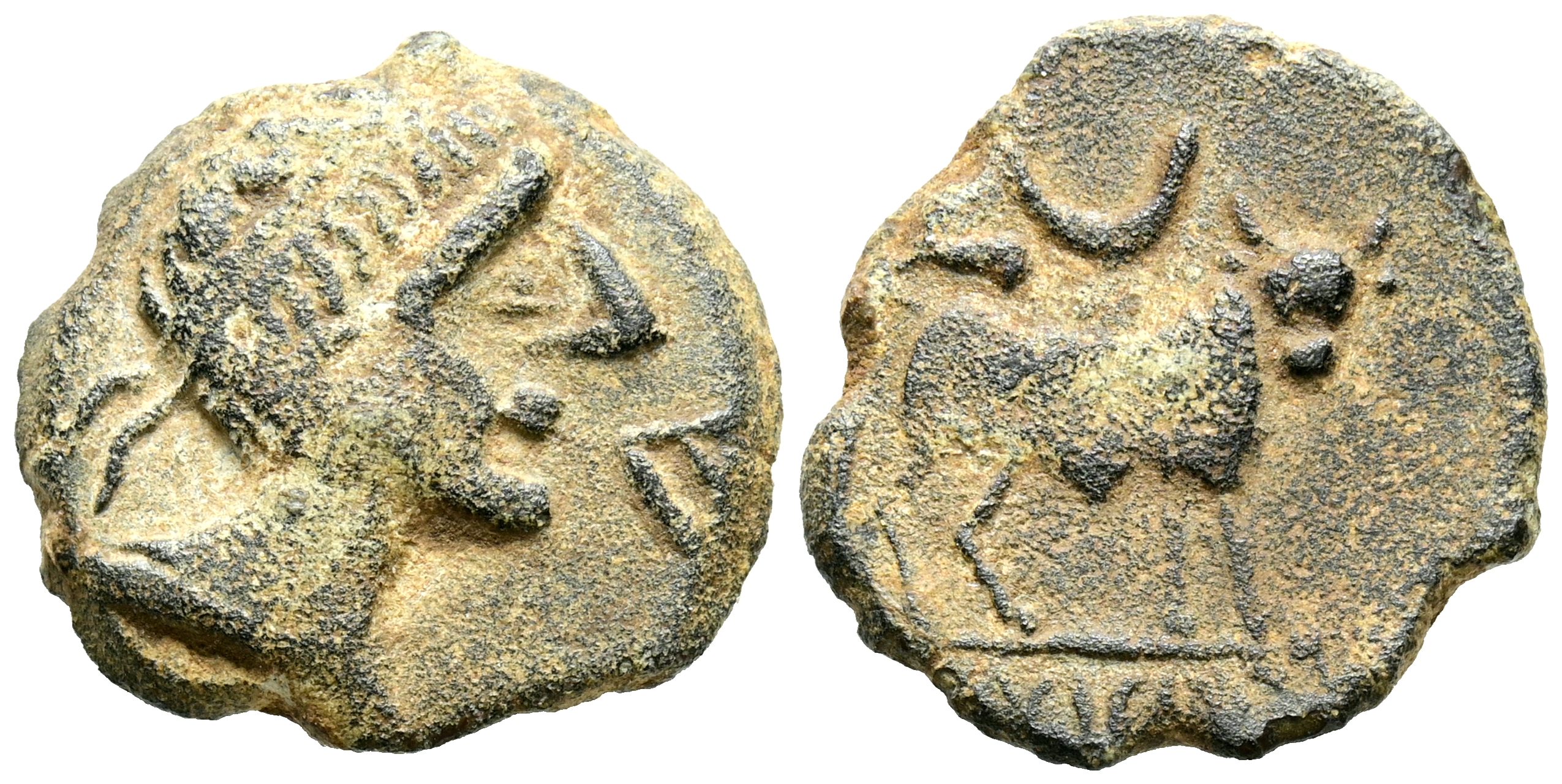CASTULO (Cazlona, Jaén). Semis. (Ae. 4,06g/18mm). 180 a.C. (FAB-722). Anv: Cabeza masculina diademada a derecha, delante letra ibérica: Ca. Rev: Toro a derecha, encima letra L y creciente, en exergo leyenda ibérica: CaSTeLe. MBC.