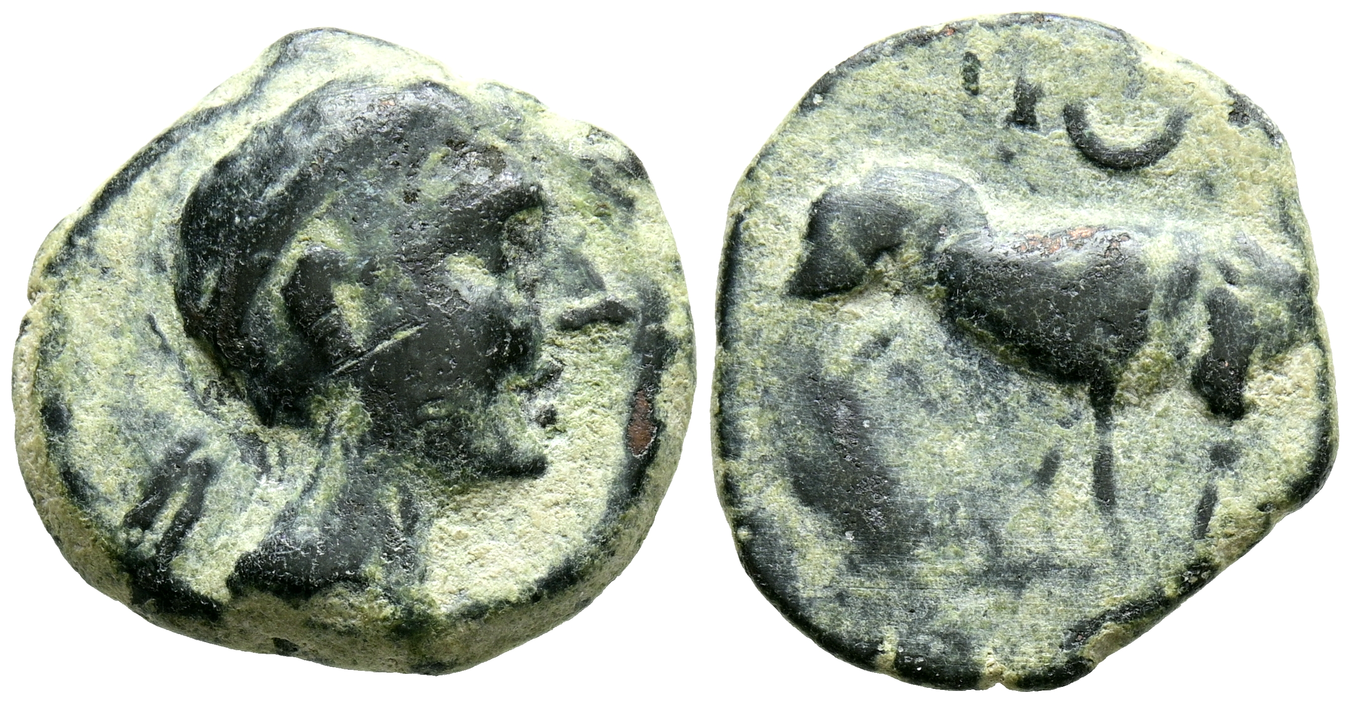 CASTULO (Cazlona, Jaén). Semis. (Ae. 5,09g/19mm). 180 a.C. (FAB-722). Anv: Cabeza masculina diademada a derecha, delante letra ibérica: Ca. Rev: Toro a derecha, encima letra L y creciente, en exergo leyenda ibérica: CaSTeLe. MBC/BC+.