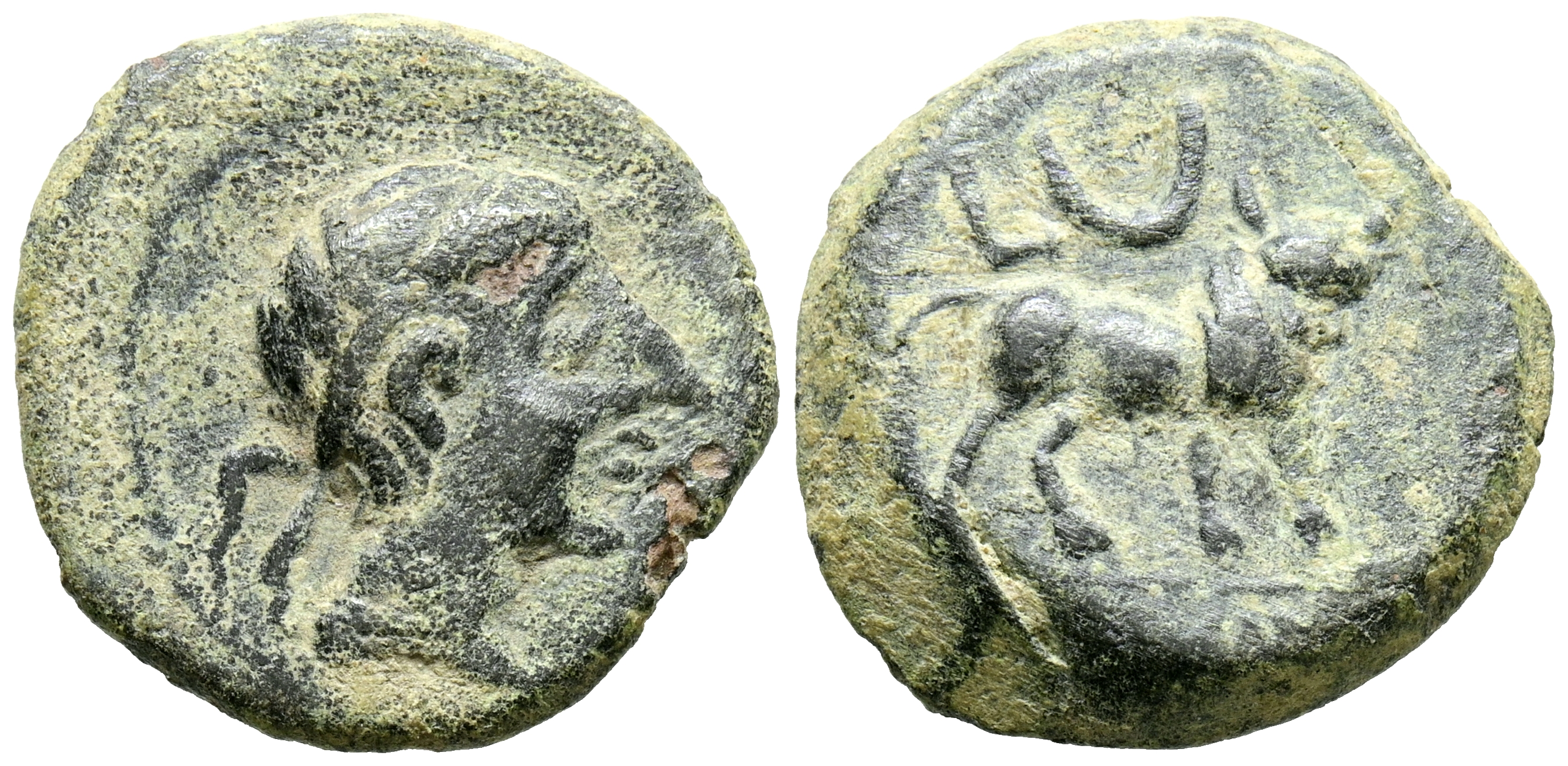 CASTULO (Cazlona, Jaén). Semis. (Ae. 5,19g/18mm). 180 a.C. (FAB-722). Anv: Cabeza masculina diademada a derecha, delante letra ibérica: Ca. Rev: Toro a derecha, encima letra L y creciente, en exergo leyenda ibérica: CaSTeLe. MBC.