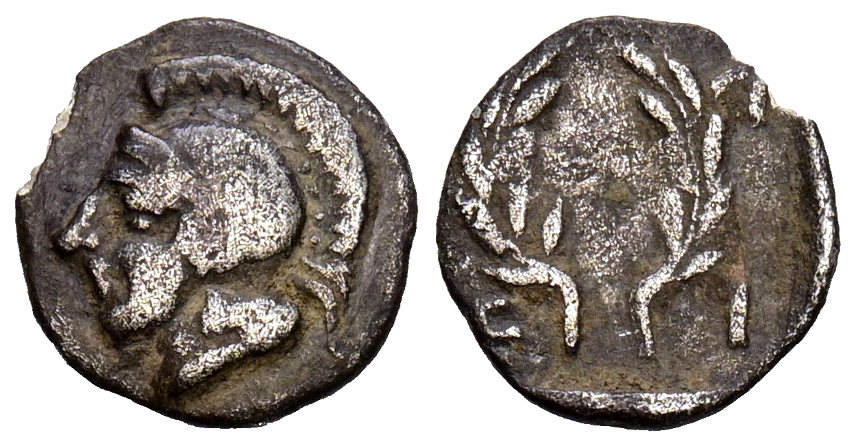 AEOLIS, Elaia. Hemióbolo. (Ar. 0,31g/8mm). 450-400 a. C. (SNG Copenhagen 164). Anv: Cabeza de Atenea con casco a la izquierda. Rev: Corona de laurel. MBC.