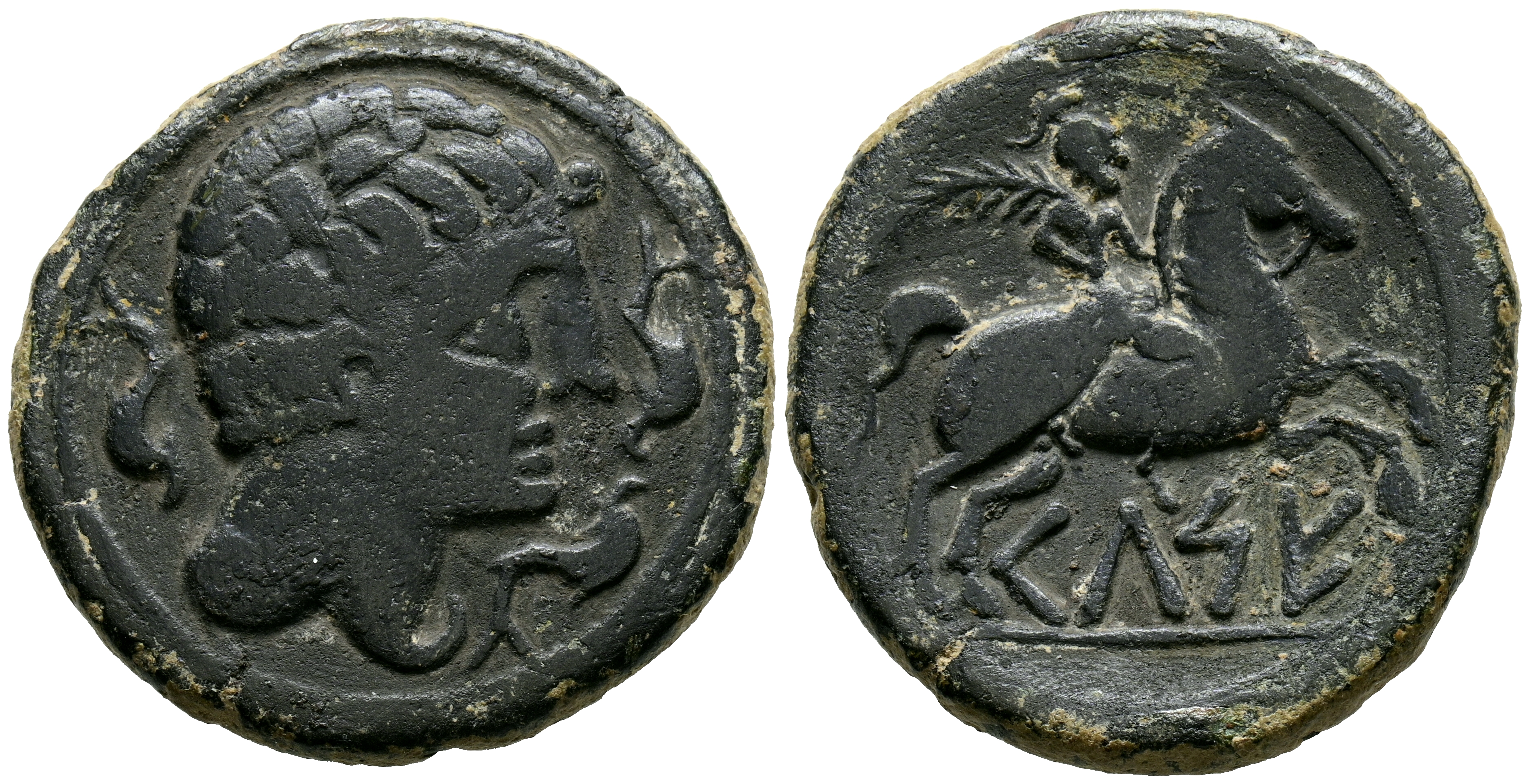 CELSE (Velilla de Ebro, Zaragoza). As. (Ae. 15,73g/30mm). 120-50 a.C. (FAB-771). Anv: Cabeza masculina a derecha con manto y fíbula, alrededor de tres delfines. Rev: Jinete con palma a derecha, debajo leyenda ibérica sobre línea: CeLSE. MBC.