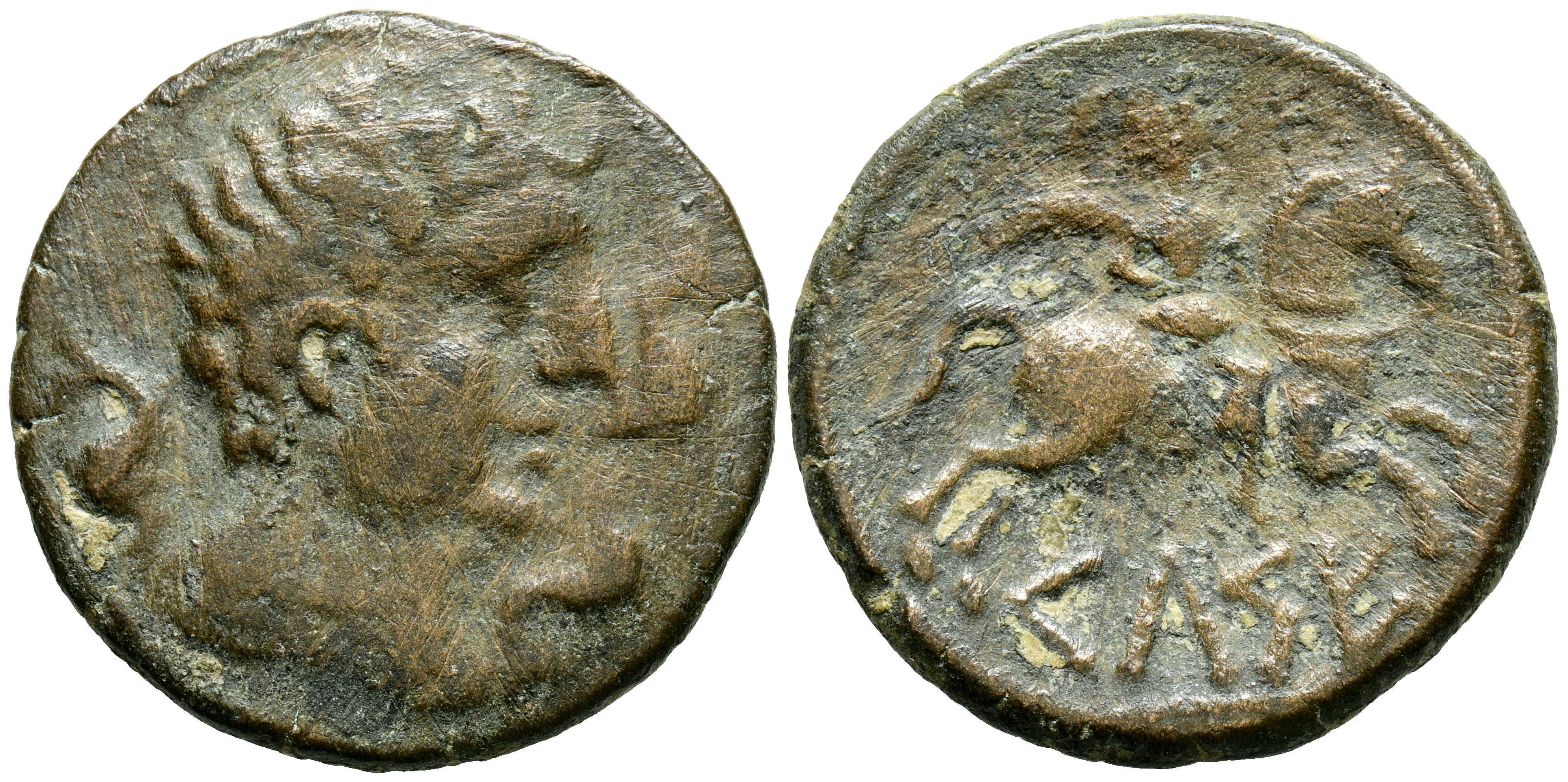 CELSE (Velilla de Ebro, Zaragoza). As. (Ae. 10,81g/28mm). 120-50 a.C. (FAB-771). Anv: Cabeza masculina a derecha con manto y fíbula, alrededor de tres delfines. Rev: Jinete con palma a derecha, debajo leyenda ibérica sobre línea: CeLSE. MBC-.