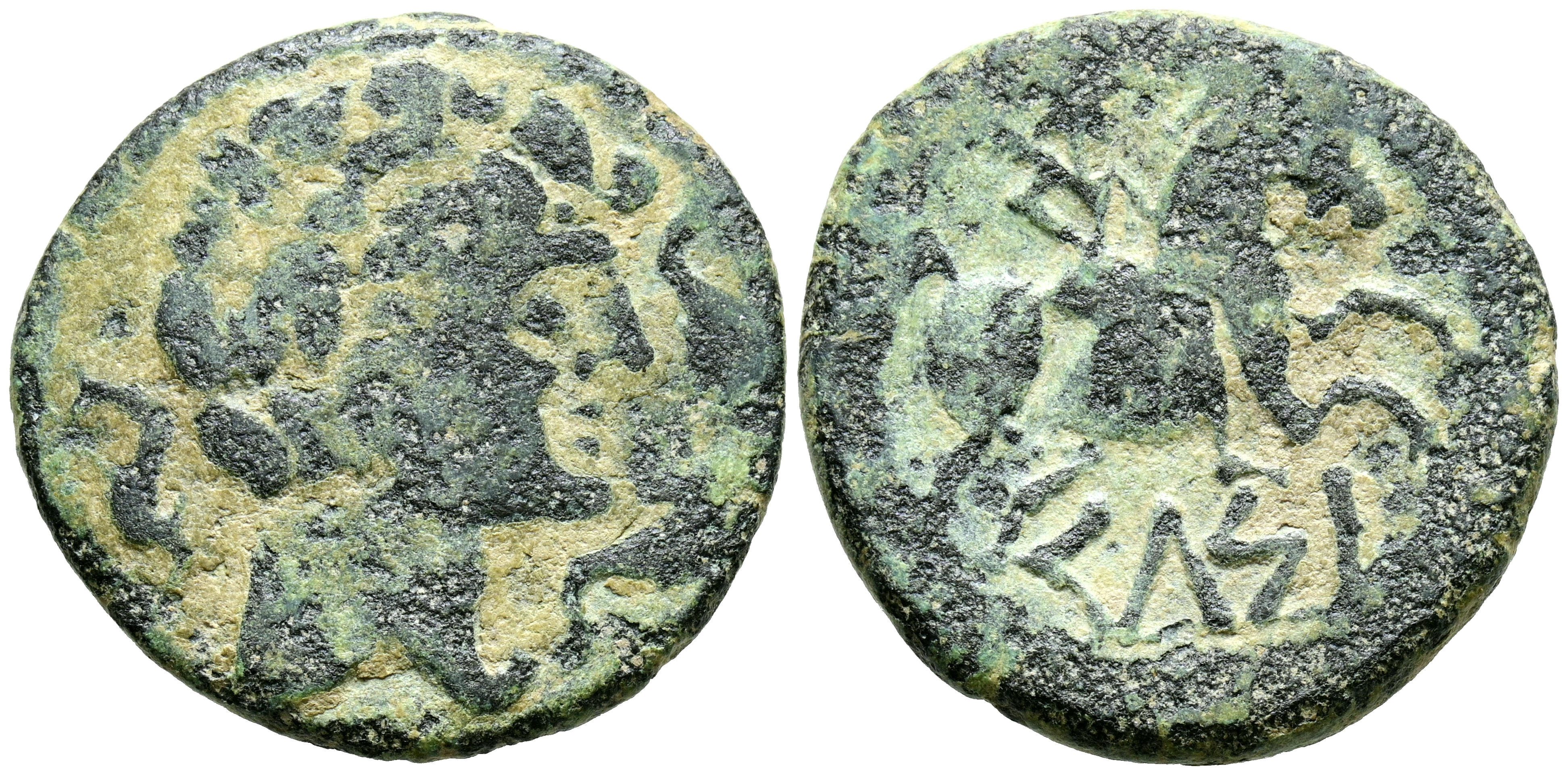 CELSE (Velilla de Ebro, Zaragoza). As. (Ae. 11,61g/27mm). 120-50 a.C. (FAB-771). Anv: Cabeza masculina a derecha con manto y fíbula, alrededor de tres delfines. Rev: Jinete con palma a derecha, debajo leyenda ibérica sobre línea: CeLSE. MBC.