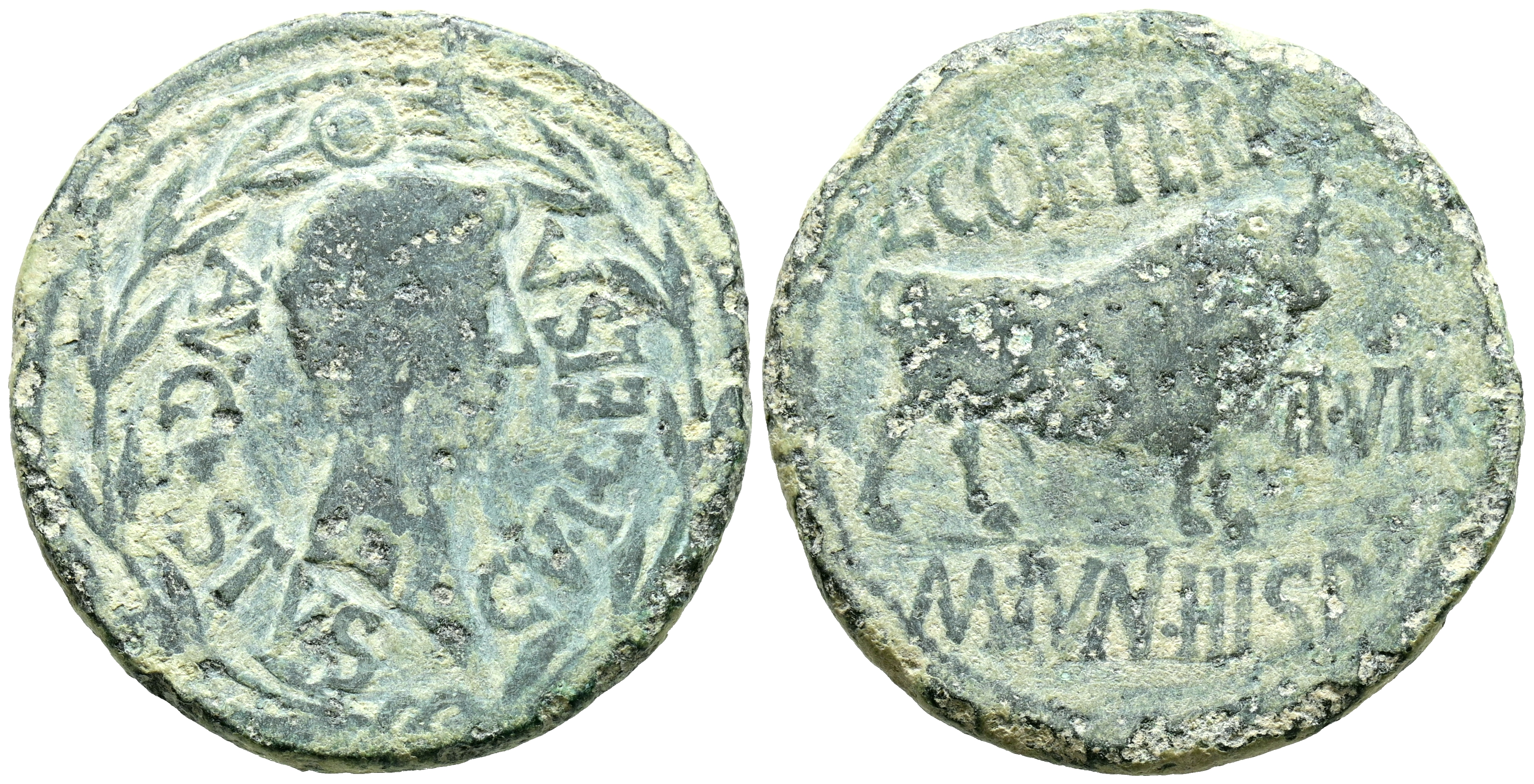 CELSE (Velilla del Ebro, Zaragoza). As. (Ae. 12,35g/30mm). 27 a.C-14 d.C. (FAB-807). Anv: Cabeza de Augusto a derecha, alrededor leyenda: AVGVSTVS C V I CELSA, todo dentro de corona de laurel. Rev: Toro estante a derecha, alredeor leyenda: L COR TER M IVN HISP II VIR. MBC-.