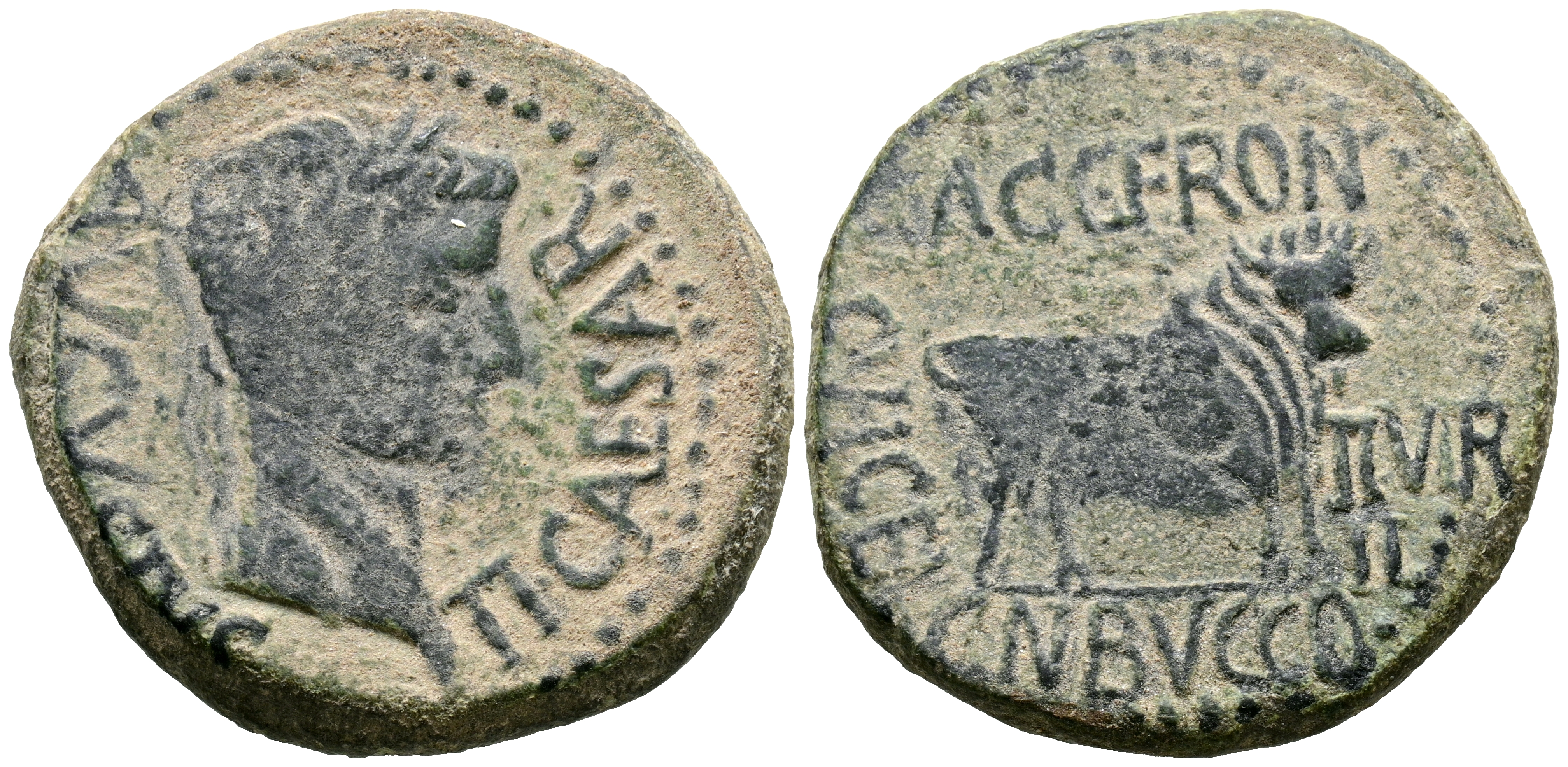CELSE (Velilla del Ebro, Zaragoza). As. (Ae. 13,08g/29mm). 14-36 d.C. (FAB-819). Anv: Cabeza laureada de Tiberio a derecha, alrededor leyenda: TI CAESAR AVGVSTVS. Rev: Toro a derecha, encima leyenda: BACC FRONT, debajo: CN BVCCO, a la izquierda: D V I CEL, a la derecha: II VIR II. MBC-. Repatinado.