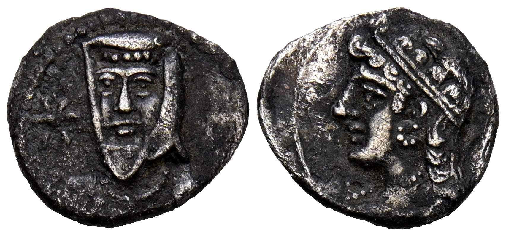 CILICIA. Óbolo. (Ar. 0,50g/11mm). Siglo IV a.C. Ceca incierta.(Winzer 18.2). Anv: Busto drapeado mirando ligeramente hacia la izquierda, vistiendo kyrbasia; estrella a la izquierda. Rev: Cabeza diademada de mujer hacia la izquierda, vistiendo tainia, arete y collar. MBC. Muy raro.