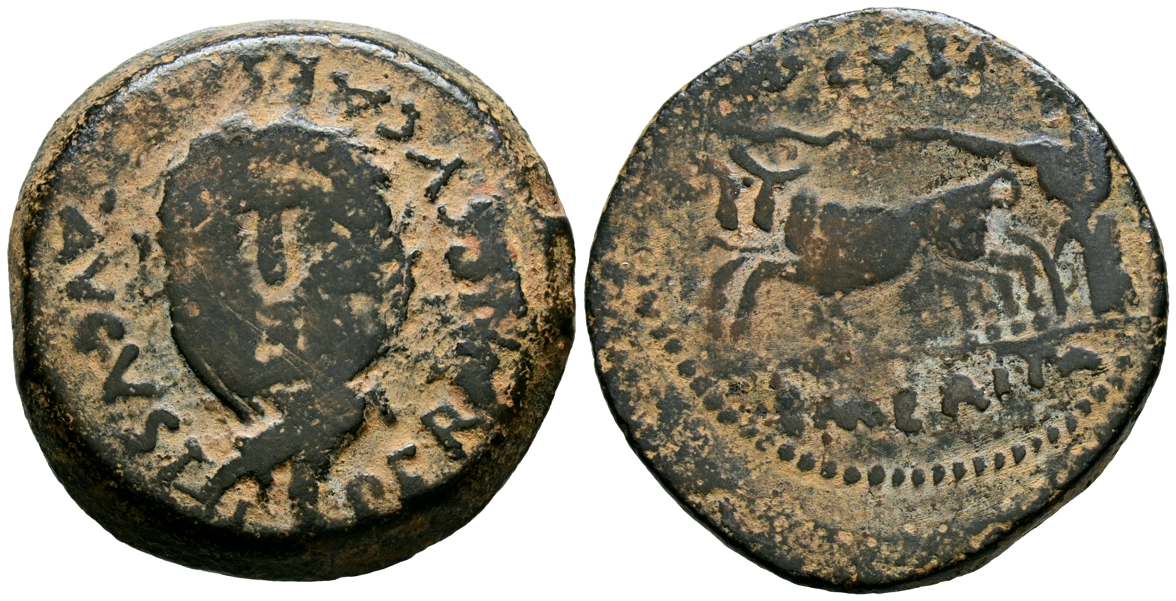 EMERITA AUGUSTA (Mérida, Badajoz). As. (Ae. 12,68g/27mm). 22 a.C.-14 d.C. (FAB-1009). Anv: Cabeza barbada de frente, debajo ánfora, alrededor leyenda: PERMISSV CAESARIS AVGVSTI. Rev: Yunta a izquierda, encima leyenda: AVGVSTA, debajo: EMERITA. MBC-.