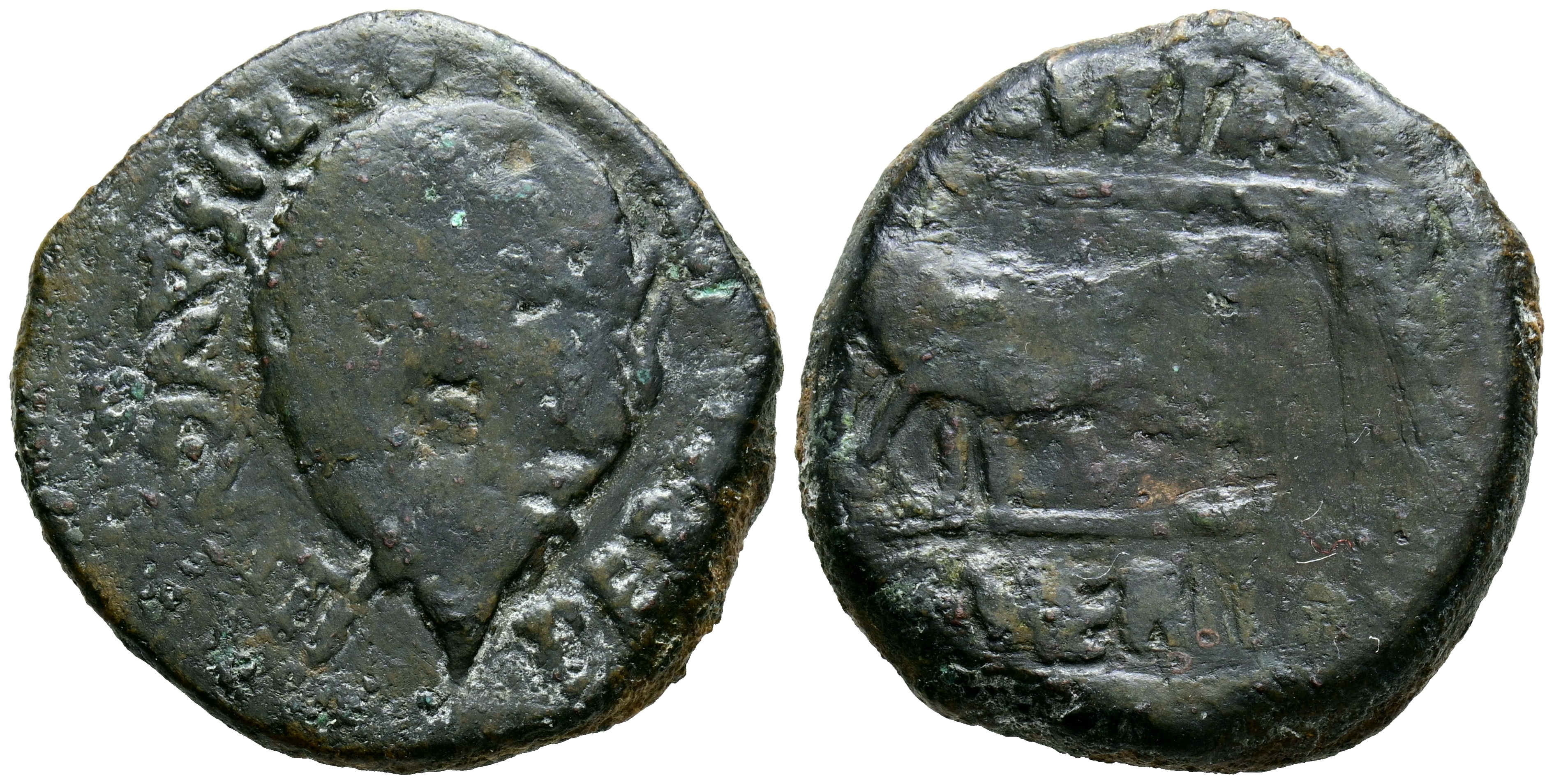 EMERITA AUGUSTA (Mérida, Badajoz). As. (Ae. 13,47g/27mm). 22 a.C.-14 d.C. (FAB-1009). Anv: Cabeza barbada de frente, abajo ánfora, alrededor leyenda: PERMISSV CAESARIS AVGVSTI. Rev: Yunta a izquierda, encima leyenda: AVGVSTA, debajo: EMERITA. BC+.