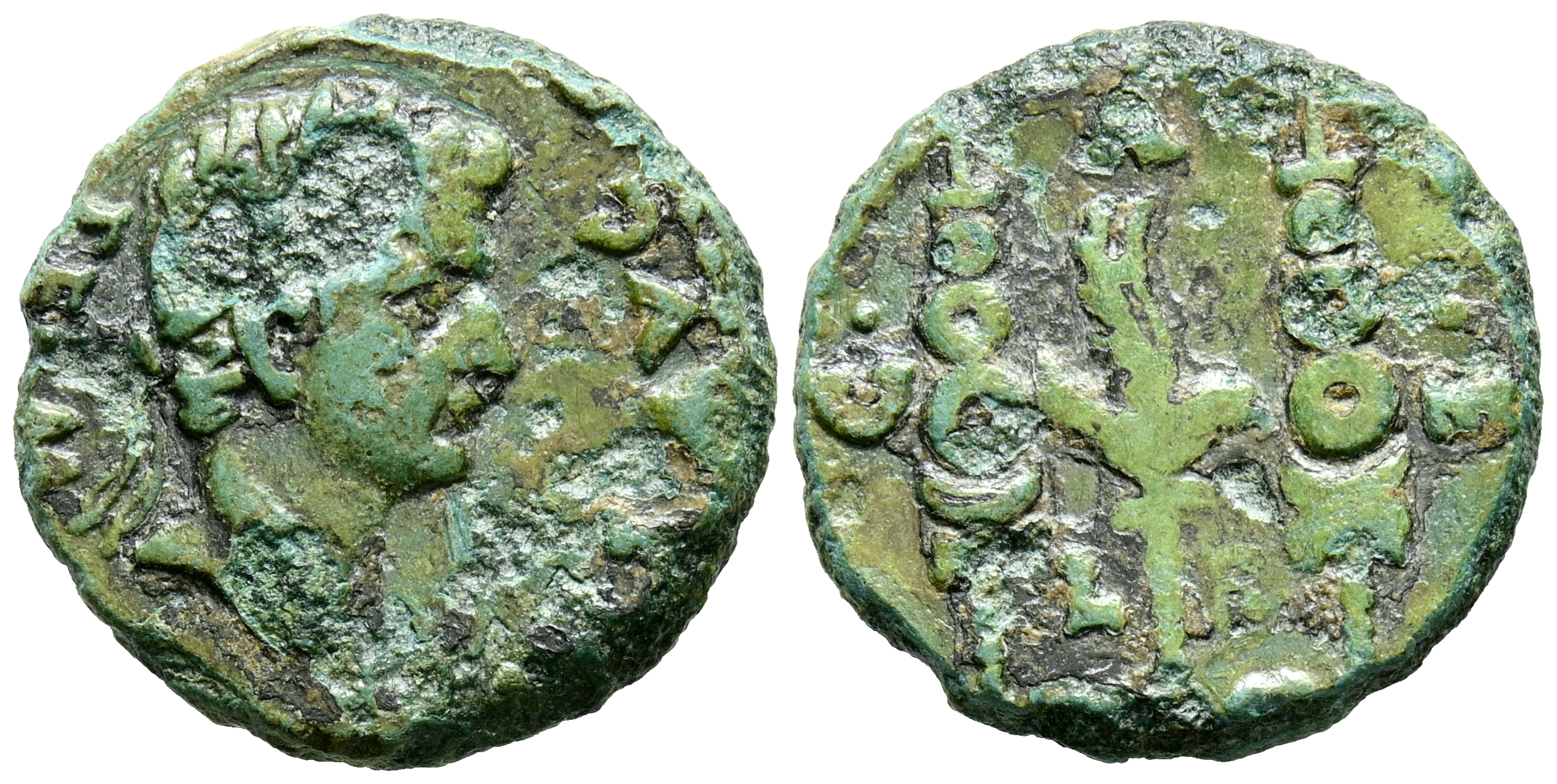 EMERITA AUGUSTA (Mérida, Badajoz). Semis. (Ae. 4,00g/18mm). 22 a.C-14 d.C. (FAB-1016). Anv: Cabeza laureada de Augusto a derecha, alrededor leyenda: PERM CAES AVG. Rev: Aguila legionaria entre estandartes, encima: CAE, entre ellas: LE/VX. MBC-.