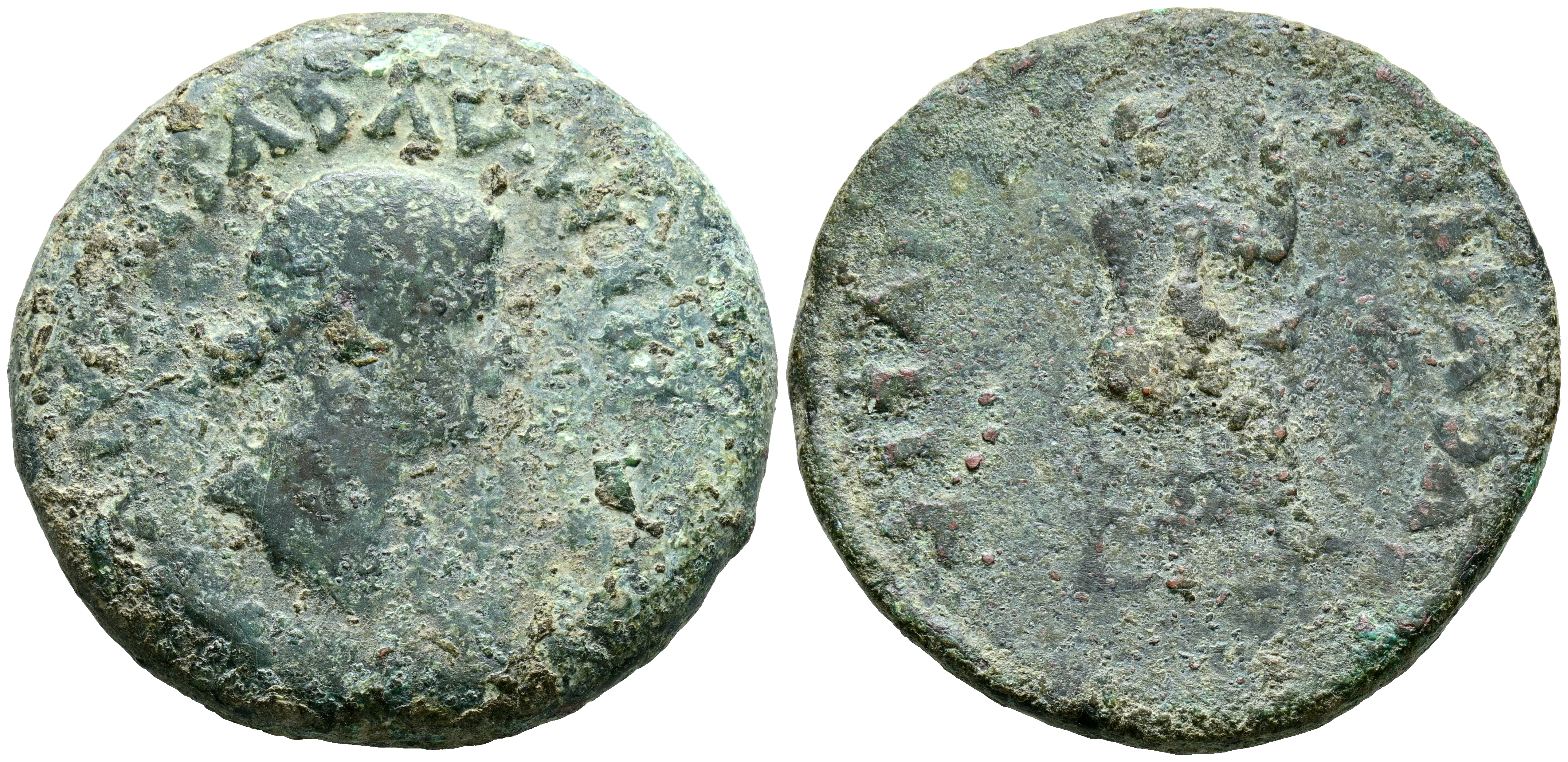 EMERITA AUGUSTA (Mérida). Dupondio. (Ae. 26,63g/35mm). 14-36 d.C. (FAB-1026). Anv: Cabeza de Livia a derecha, alrededor leyenda: PERM AVGVSTI SALVS AVGVSTA. Rev: Livia sentada a derecha, como Ceres, alrededor leyenda: AVGVSTA IVLIA C A E. BC+.