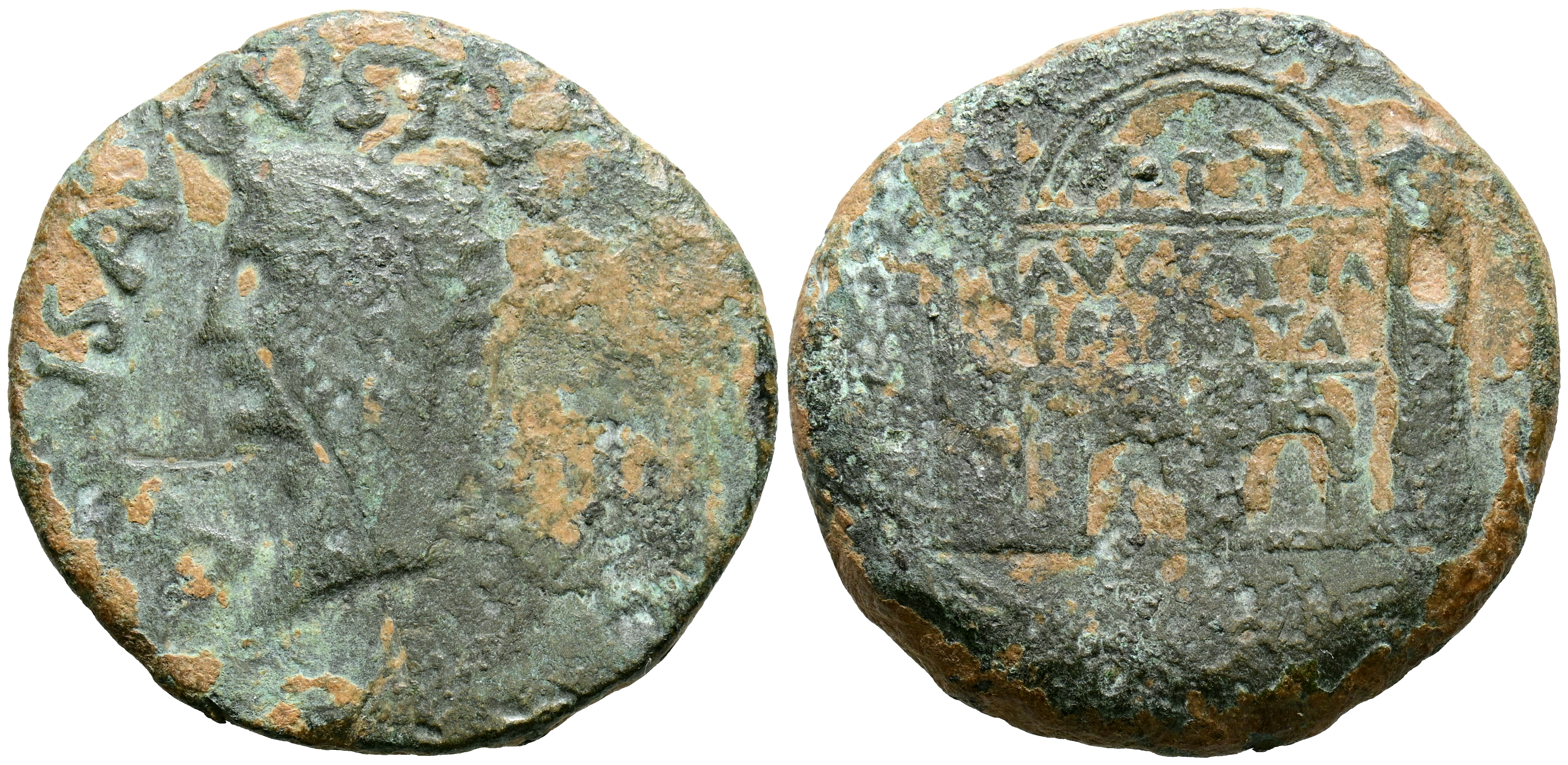 EMERITA AUGUSTA (Mérida, Badajoz). Dupondio. (Ae. 19,95g/33mm). 14-36 d.C. (FAB-1034). Anv: Cabeza radiada de Augusto a la izquierda, alrededor leyenda de lectura externa: DIVVS AVGVS PATER. Rev: Puerta con inscripción: AVGVSTA EMERITA. BC+. Rara.
