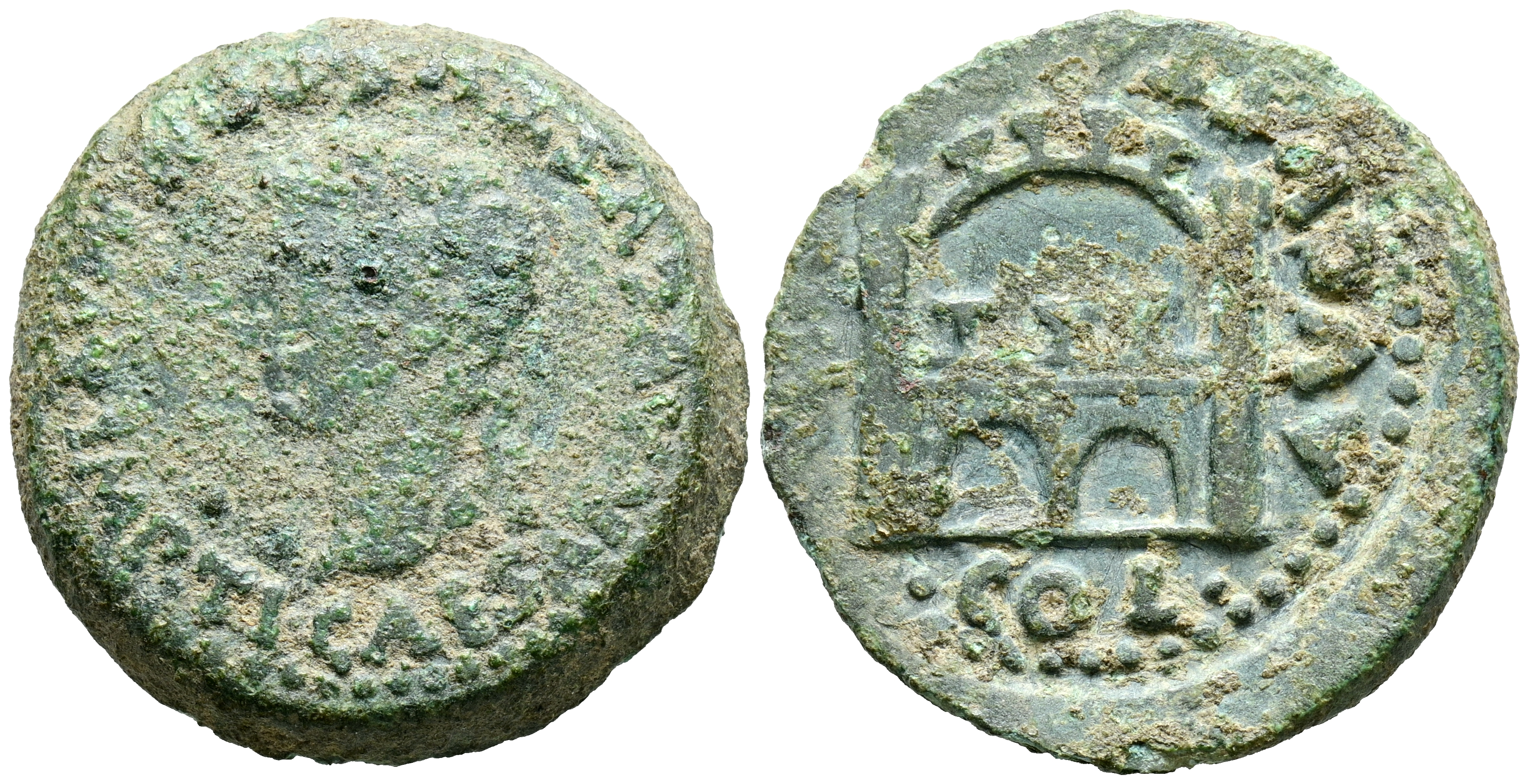 EMERITA AUGUSTA (Mérida). As. (Ae. 11,11g/26mm). 14-36 d.C. (FAB-1055) Anv: Cabeza desnuda de Tiberio a izquierda, alrededor leyenda: TI CAESAR AVG PON MAX IMP. Rev: Puerta de la ciudad, alrededor leyenda: COL AVGVSTA EMERITA. MBC.