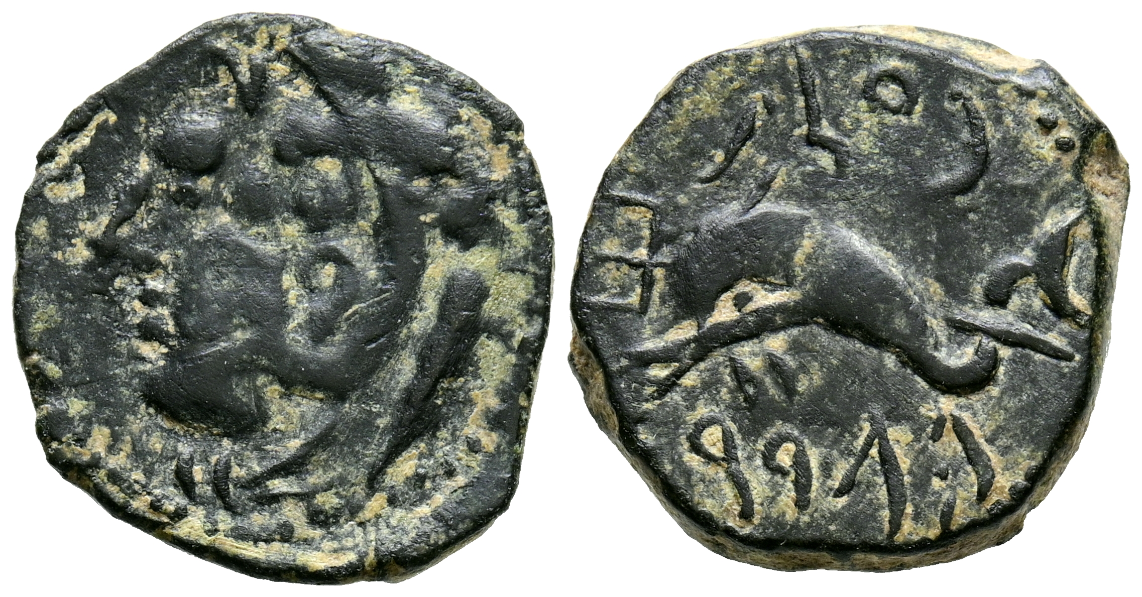 GADES (Cádiz). Cuadrante. (Ae. 2,91g/17mm). 100-20 a.C. (FAB-1356). Anv: Cabeza de Hércules con piel de león a izquierda, detrás clava. Rev: Delfín a izquierda con tridente entre leyenda púnica. MBC.