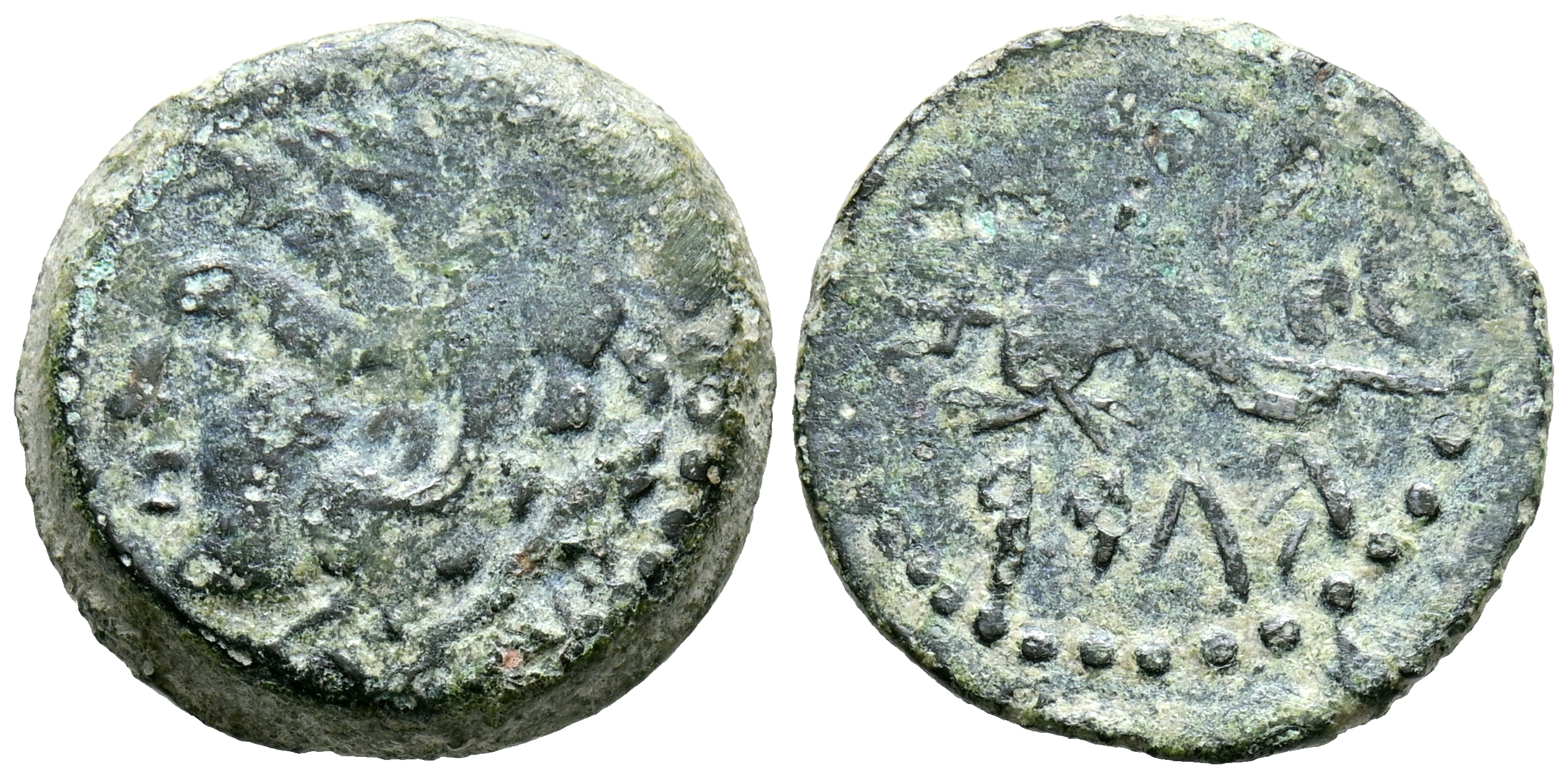 GADES (Cádiz). Cuadrante. (Ae. 3,60g/17mm). 100-20 a.C. (FAB-1356). Anv: Cabeza de Hércules con piel de león a izquierda, detrás clava. Rev: Delfín a izquierda con tridente entre leyenda púnica. MBC-.