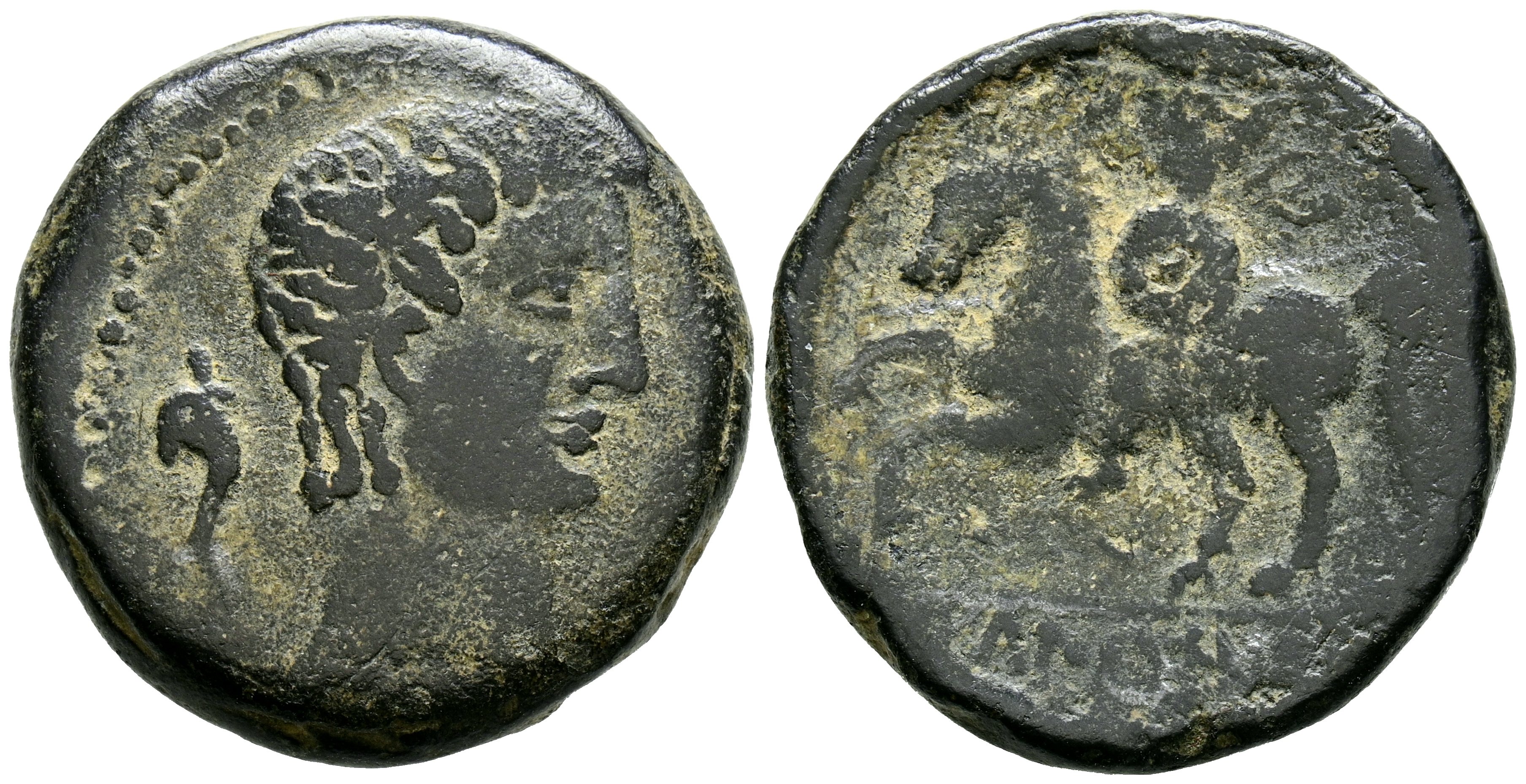 ICALCUSCEN (Iniesta, Cuenca). As. (Ae. 12,35g/25mm). 120-20 a.C. (FAB-1399). Anv: Cabeza masculina a derecha, detrás delfín. Rev: Jinete con lanza y escudo a izquierda, debajo leyenda ibérica: ICaLCuSCeN. MBC-.
