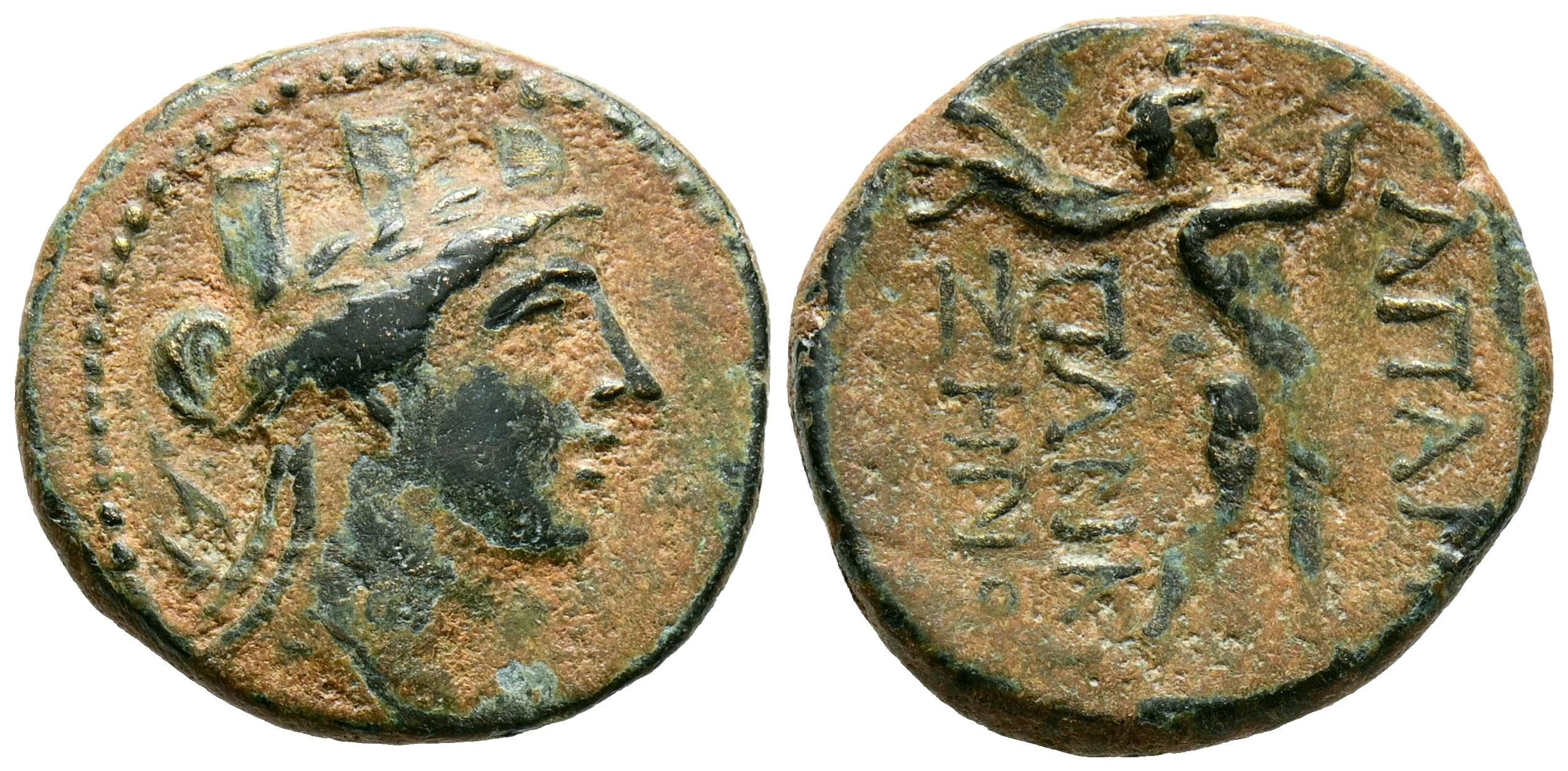 PHRYGIA, Apameia. Ae17. (Ae. 3,14g/17mm). 133-48 a.C. (SNG Copenhague 193; HGC 7, 674). Anv: Cabeza de Artemis con corona mural, a su espalda arco y carcaj. Rev: Marsyas avanzando a derecha tocando instrumento, alrededor leyenda griega: AΠAME / KHΦI ΣO / ΣKAY. MBC.