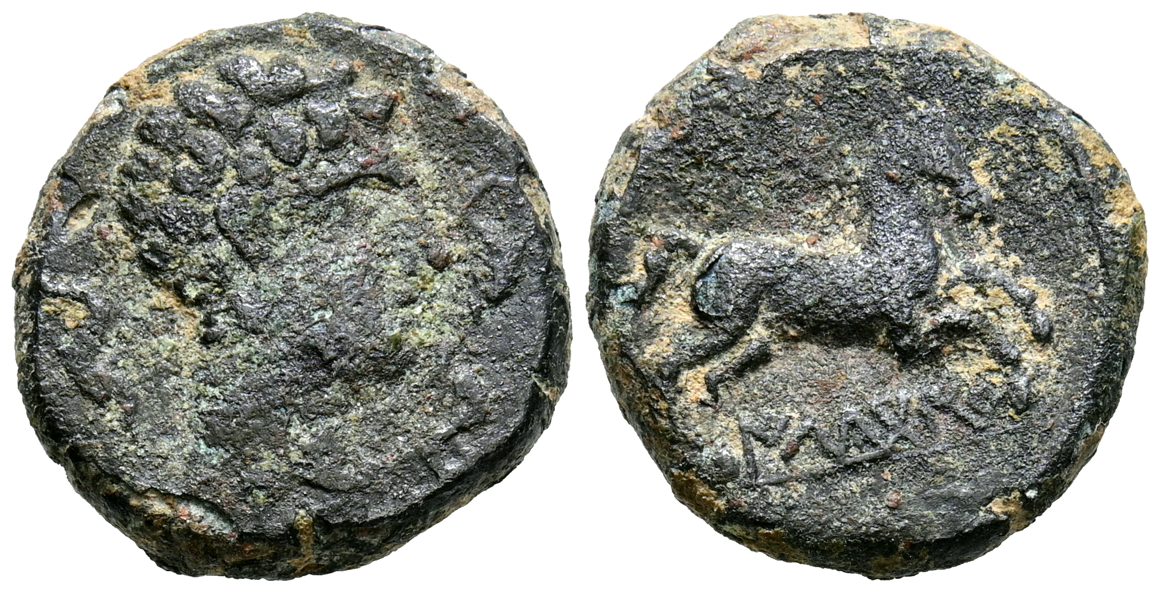 ILDUCOITE (Olite, Teruel). Cuadrante. (Ae. 4,02g/16mm). 120-20 a.C. (FAB-1430; ACIP 1504, catalogado como R9). Anv: Cabeza masculina a derecha rodeada de tres delfines. Rev: Caballo galopando a derecha, debajo leyenda ibérica sobre línea: ILDuCoITE. MBC. Raro ejemplar.