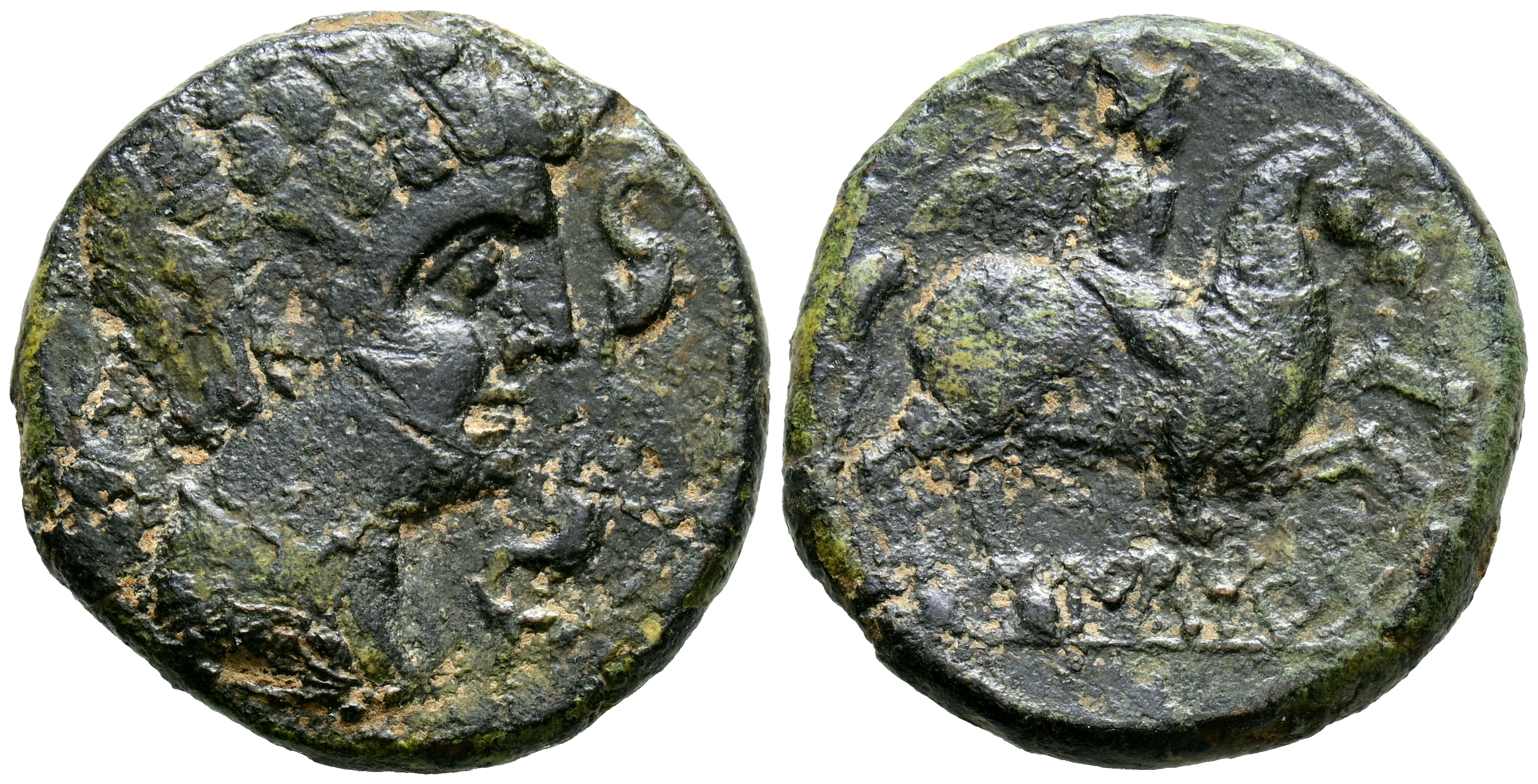 ILTIRTA (Lérida). As. (Ae. 10,89g/25,6mm). 200-20 a.C. (FAB-1471). Anv: Cabeza masculina a derecha, alrededor tres delfines. Rev: Jinete con palma a derecha, debajo leyenda ibérica: ILTiRTa. MBC.