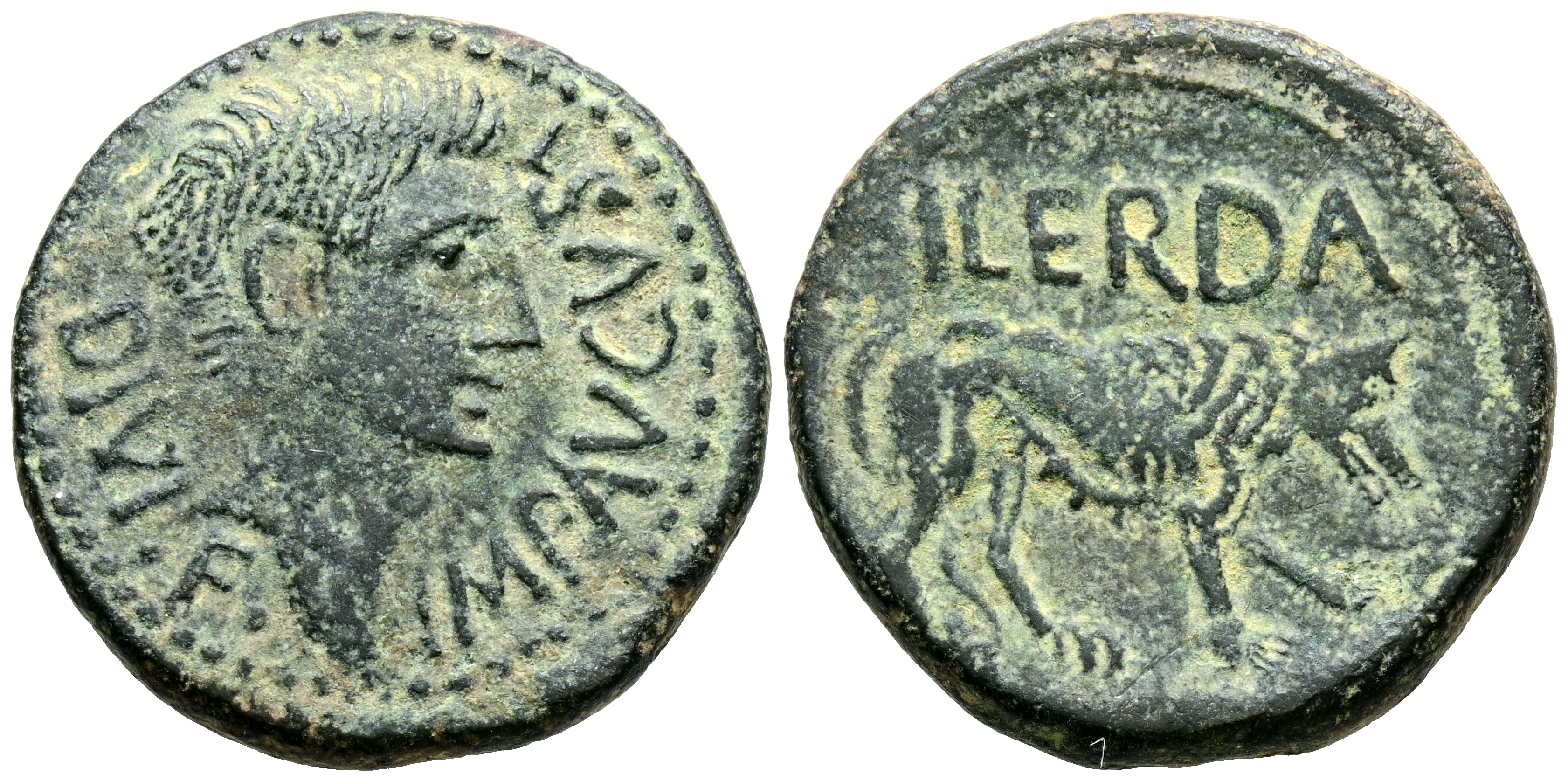 ILTIRTA (Lérida). As. (Ae. 8,20g/23mm). 27 a.C.-14 d.C. (FAB-1488). Anv: Cabeza de Augusto a derecha, alrededor leyenda: DIVI F IMP AVGVST. Rev: Lobo andando a derecha, encima leyenda: ILERDA. MBC+. Repasada.