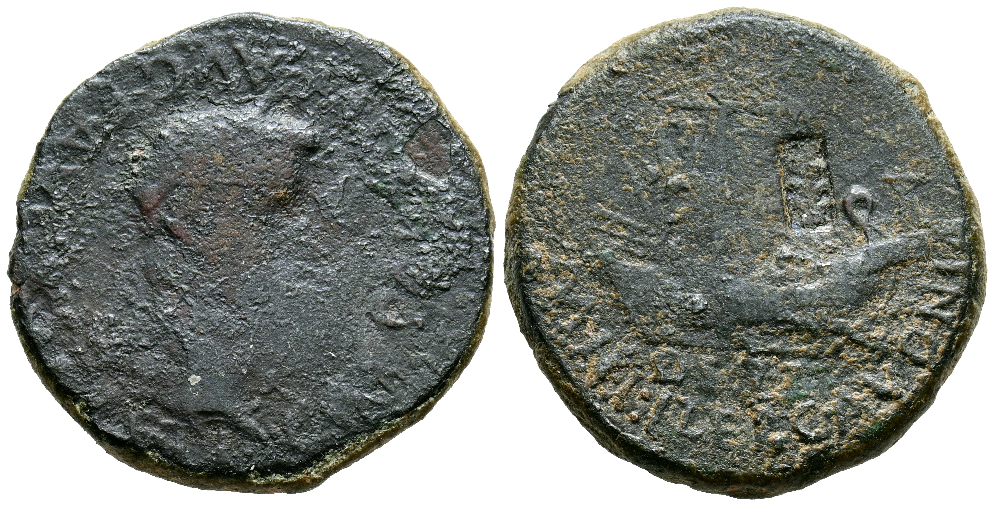 ILERGAVONIA (Tortosa, Tarragona). As. (Ae. 7,53g/23mm). 14-36 d.C. (FAB-1493). Anv: Cabeza laureada de Tiberio a derecha, alrededor leyenda: TI CAESAR DIVI AVG AVGVSTVS. Rev: Nave, debajo: DERT/ILRECAVONIA. BC-. Escaso ejemplar. Resello en reverso.