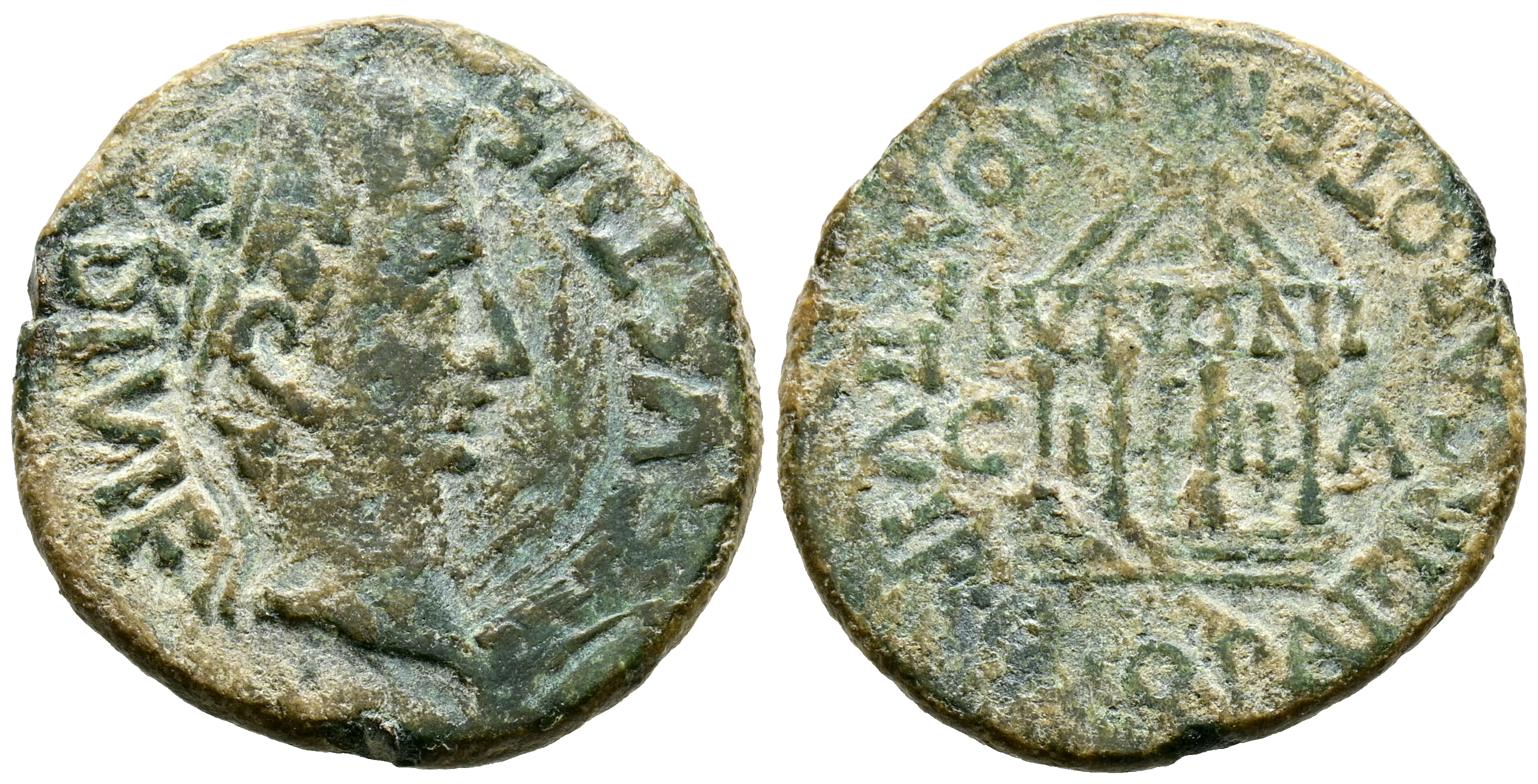 ILICI (Elche, Alicante). Semis. (Ae. 5,21g/22mm). 27 a.C.-14 d.C. (FAB-1519). Anv: Cabeza laureada de Augusto a derecha, alrededor leyenda: AVGVSTVS DIVI F. Rev: Templo tetrástilo, con inscripción: IVNONI, entre las columnas: C I I A, alrededor: Q PAPIR CAR Q TERE MONT II VIR Q. MBC-.