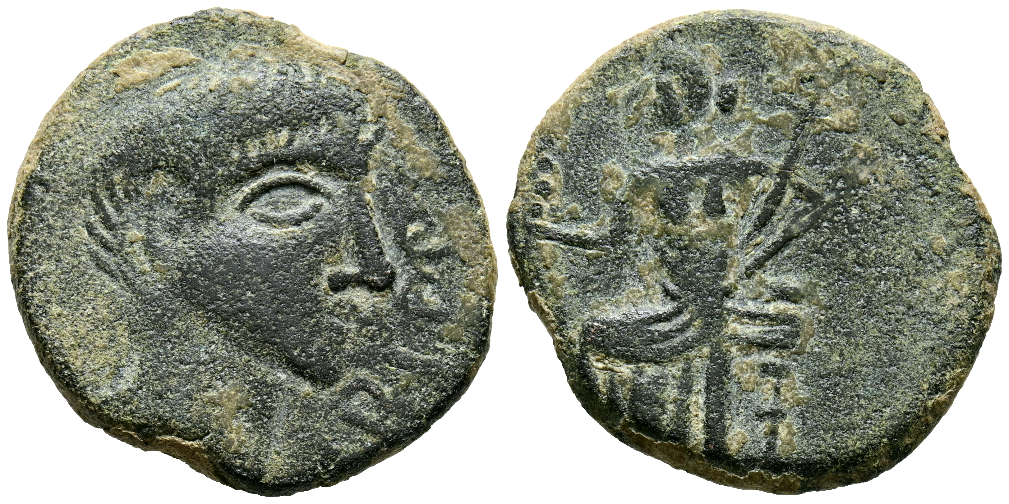 IRIPPO (Zona sur de Sevilla). Semis. (Ae. 6,30g/23mm). 30 a.C. (FAB-1581). Anv: Cabeza masculina a derecha, delante: IRIPPO. Rev: Figura femenina sentada a izquierda con piña y cornucopia. MBC.
