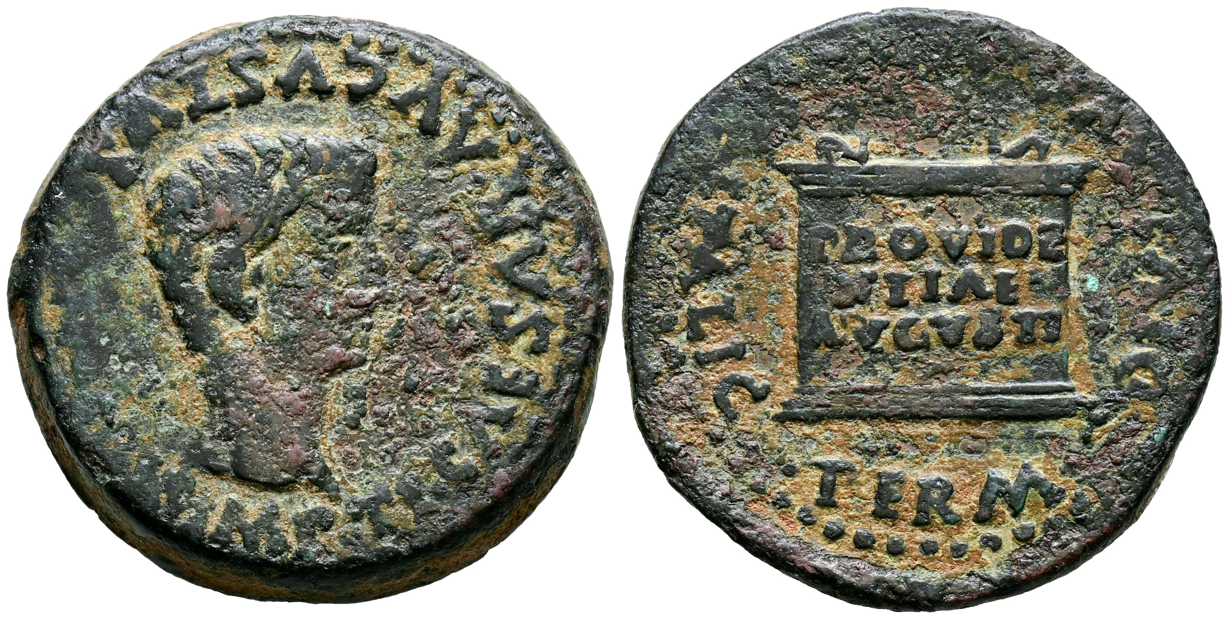 ITALICA (Santiponce, Sevilla). As. (Ae. 13,92g/29mm). 14-36 d.C. (FAB-1593). Anv: Cabeza de Tiberio a derecha, alrededor leyenda: IMP TI CAESAR AVGVSTVS PON MAX, Rev: Ara con leyenda inscrita: PROVIDE/NTIAE/AVGVSTI, alrededor leyenda: PERM DIVI AVG MVNIC ITALIC. MBC-.