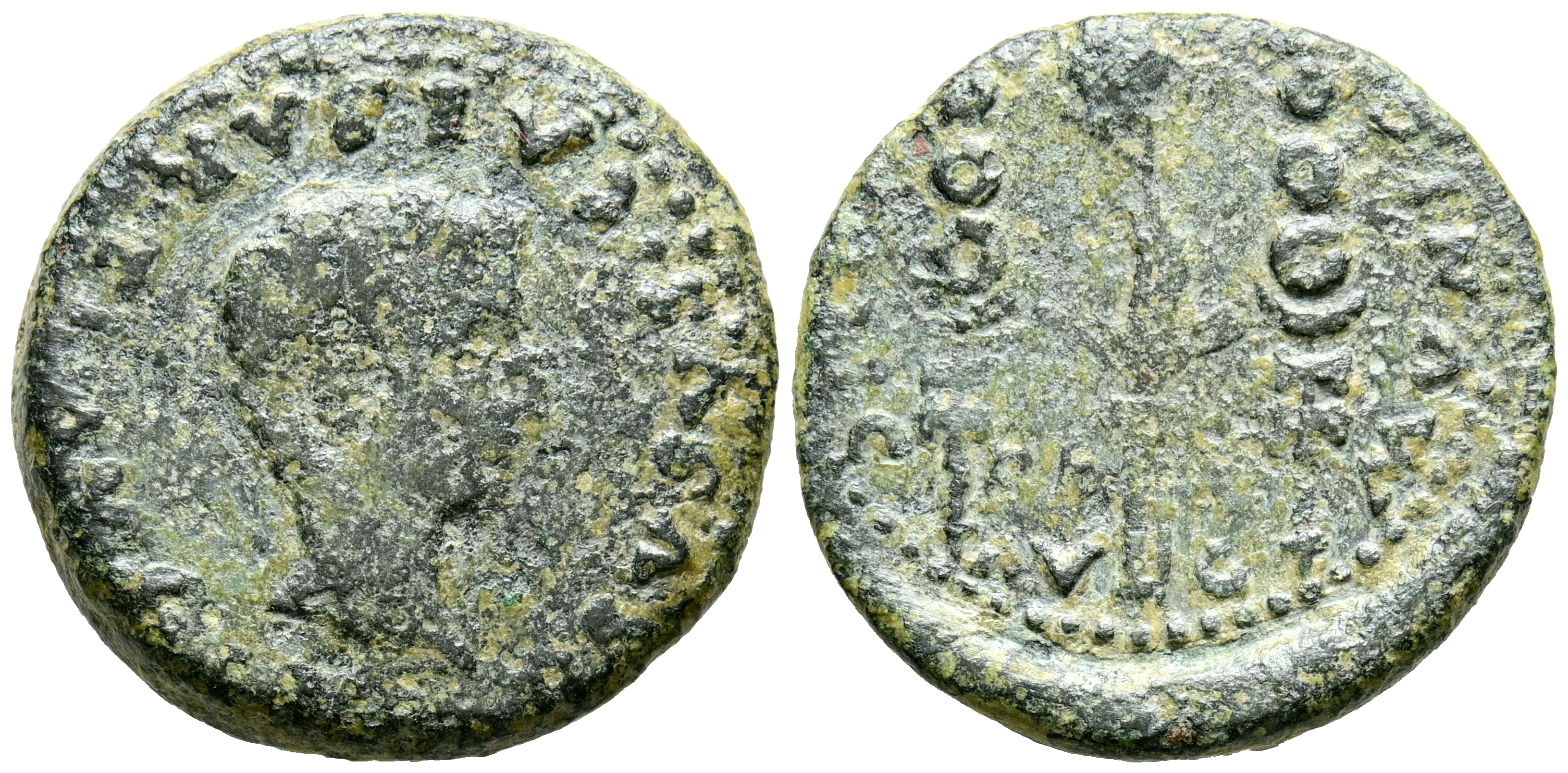 ITÁLICA (Santiponce, Sevilla). Semis. (Ae. 6,88g/23mm). 27 a.C.-14 d.C. (FAB-1596). Anv: Cabeza de Druso a la derecha, alrededor de la leyenda: DRVSVS CAESAR TI AVG. Rev: Estandartes, incluyendo águila legionaria, incluyendo: PER / AVG, alrededor de la leyenda: MVNIC ITALIC. BC+.
