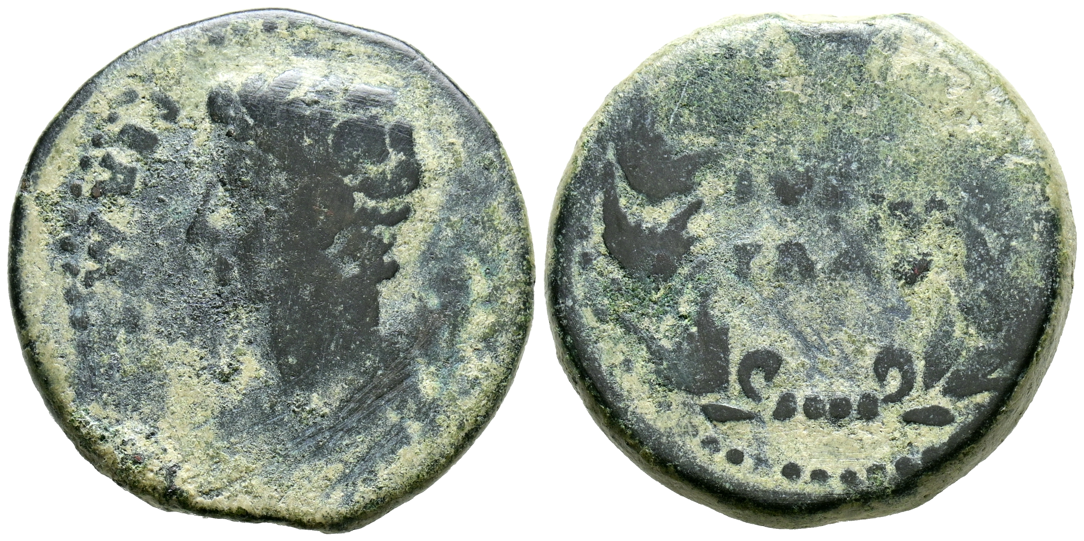 IULIA TRADUCTA (Algeciras, Cádiz). As. (Ae. 9,74g/24mm). 27 a.C.-14 d.C. (FAB-1614). Anv: Cabeza de Augusto a izquierda, alrededor leyenda: PERM CAES AVG. Rev: Leyenda: IVLIA/TRAD, dentro de corona de laurel. BC.
